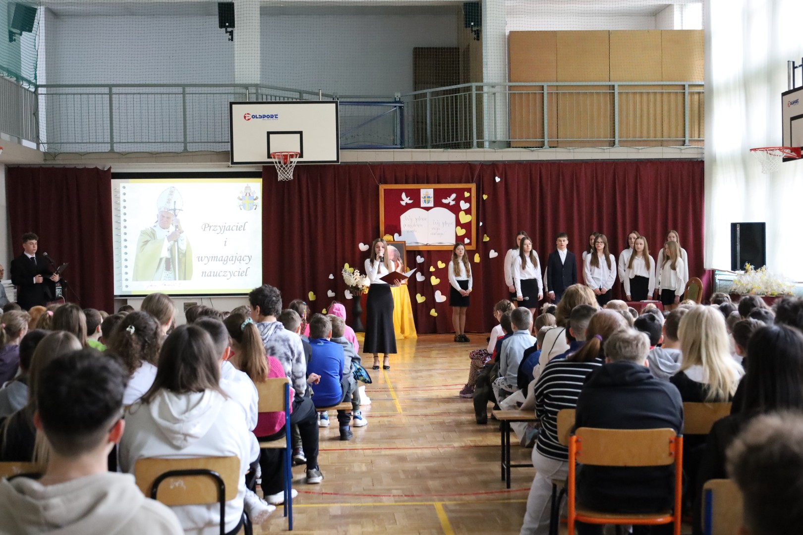 Dnia 1 kwietnia 2026r. w naszej szkole odbyła się uroczysta akademia poświęcona Janowi Pawłowi II. W wydarzeniu uczestniczyli uczniowie, nauczyciele oraz zaproszeni goście. Celem spotkania było oddanie hołdu wielkiemu Polakowi oraz przypomnienie jego życia, działalności i nauczania.