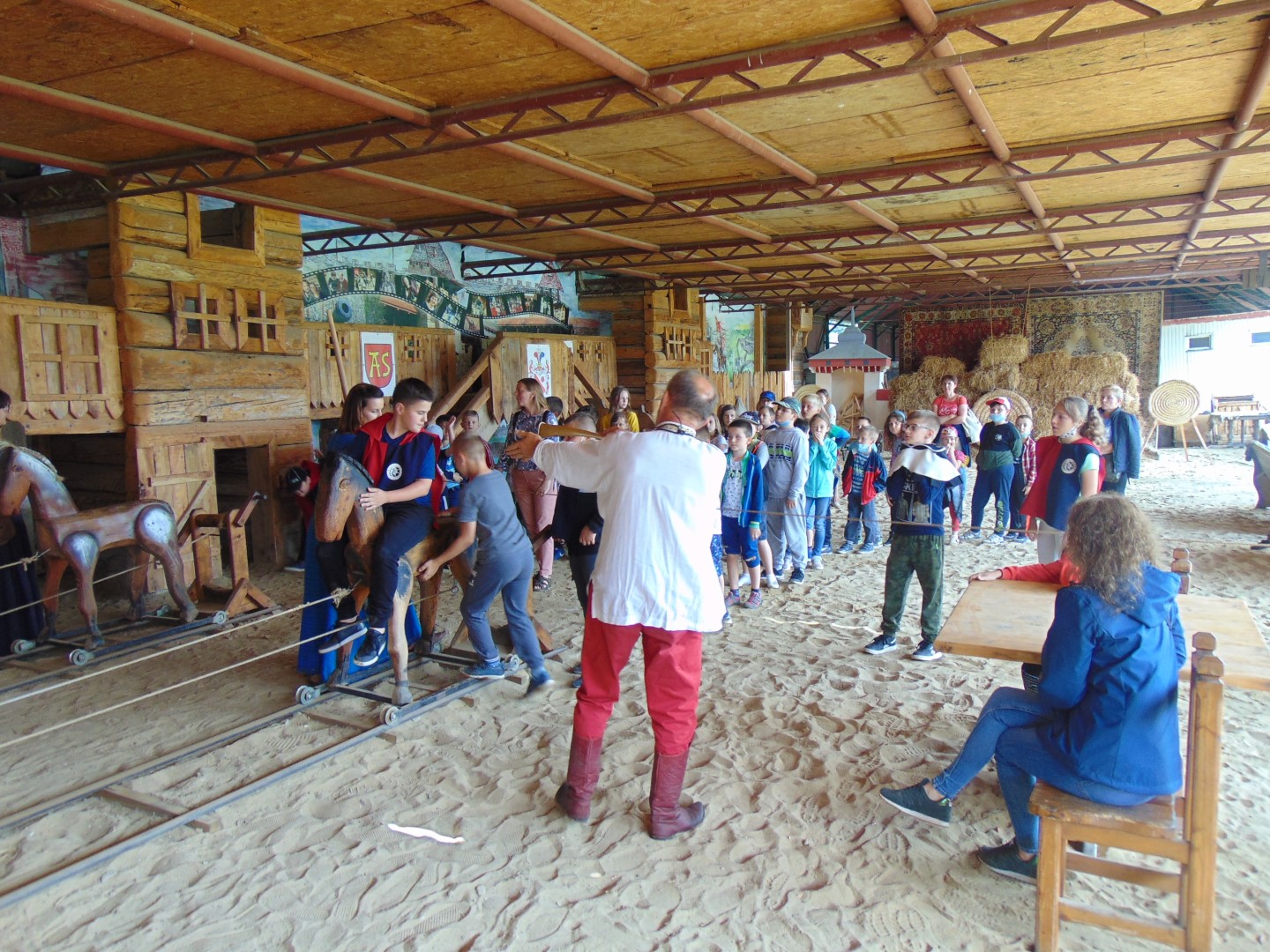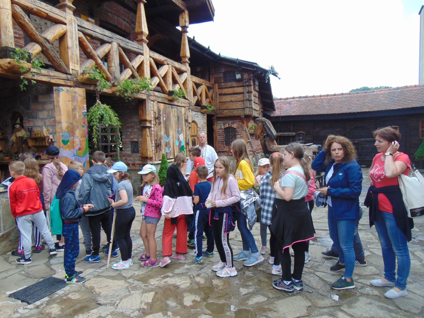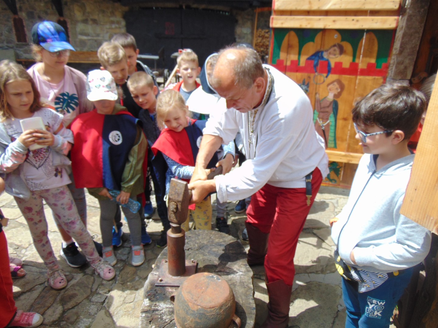 Kolejny wyjazdowy dzień na półkolonii zaprowadził nas 1 lipca do urokliwego miejsca. Zamek Stara Baśń w Grybowie to zbudowany niedawno prywatny zamek. Ubrane w starodawne stroje niewiasty oraz pan Kasztelan – właściciel zamku – przez 2 godziny nie tylko oprowadzali nas po zamku, ale snuli bardzo ciekawe opowieści. Niektórzy uczestnicy przebrani w stroje królowej, pazia, rycerzy, giermków, szpiegów – asystowali w tym wydarzeniu. Na początek wysłuchaliśmy fascynującej opowieści o najazdach tatarskich na nasze okolice. Królowa Elżbieta i jej ojciec dzielnie walczyli z najeźdzcami. Wsłuchiwaliśmy się z dźwięki dopływające z lochów pod zamkiem. W baszcie wysłuchaliśmy licznych wspomnień z wydarzeń związanych z Białą Damą. Niektórym naszym dzieciom pokazywała się ona przez kolejnych kilka dni. Potem wszyscy mogli przymierzyć kolczugę, włożyć piękne stroje, potrzymać autentyczne miecze, topory i inne oręże. Chętni oprócz kupienia sobie pamiątek mogli wybić własną monetę. Pobyt na zamku zwięczył prawdziwy turniej rycerski. Wycieczkę zakończyliśmy obiadem. Po tych wrażeniach jedzenie bardzo nam smakowało.