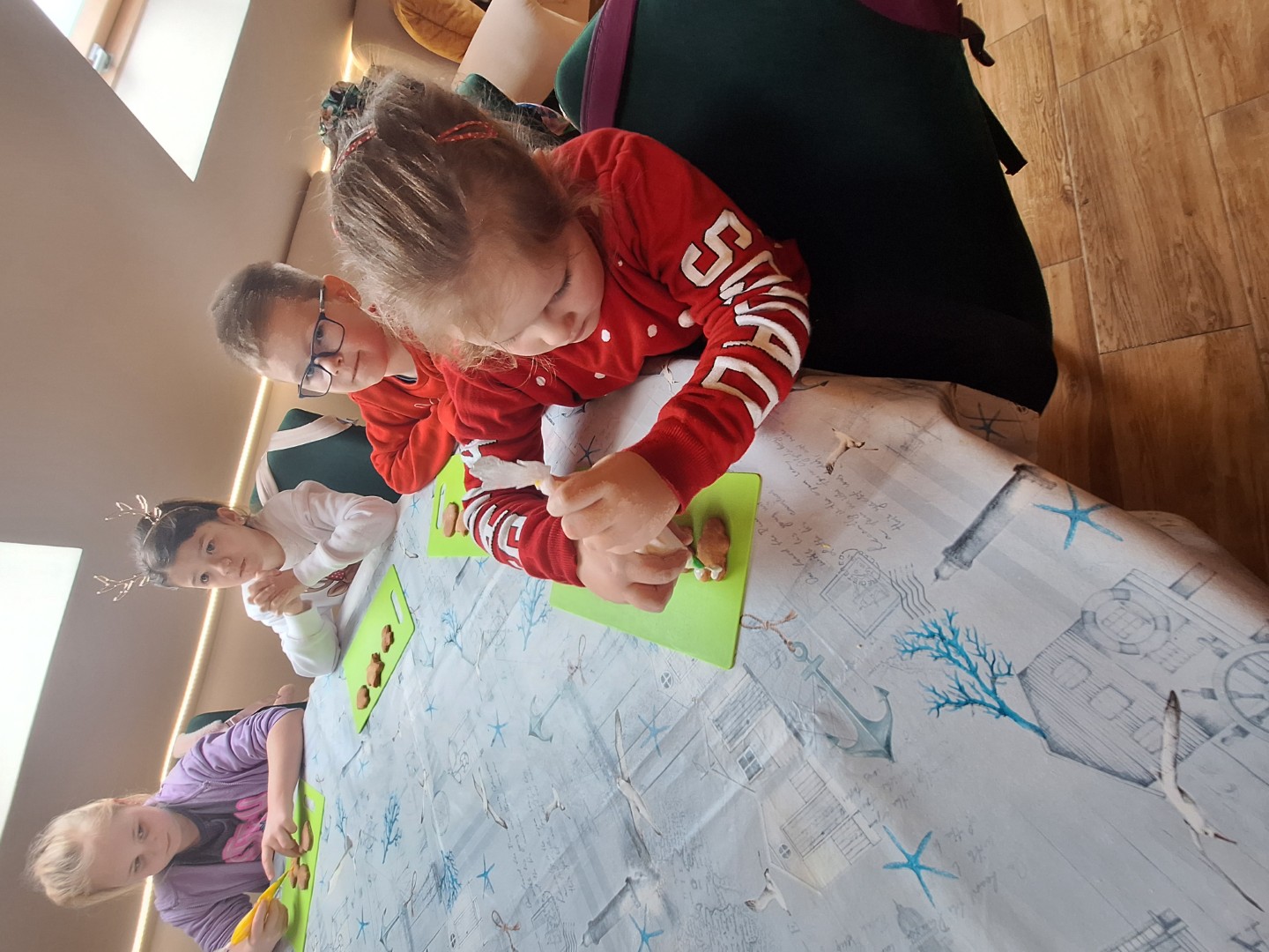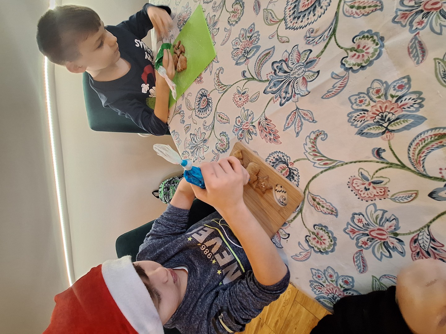 Dzieci z ogromnym zaangażowaniem wykonywały kartki świąteczne oraz ozdoby choinkowe. Pani prowadząca warsztaty opowiadała o dawnej tradycji strojenia podłaźniczek, którą uczniowie mogli zobaczyć na własne oczy. Następnie dzieci wałkowały ciasto piernikowe, wykrawały pierniczki i ozdabiały je lukrem. W czasie, gdy pierniczki się piekły, wspólnie śpiewaliśmy znane polskie kolędy.