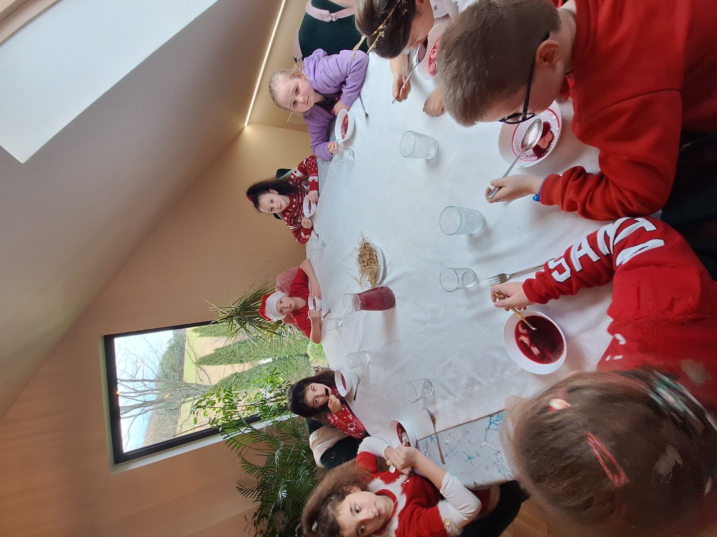 Kolejnym punktem programu było strojenie żywej choinki, a następnie wspólne nakrywanie stołów białym obrusem i układanie sianka, zgodnie z wigilijną tradycją. Na zakończenie wszyscy zasiedli do stołu, aby skosztować tradycyjnego barszczu z uszkami, wigilijnych pierogów oraz kompotu z owoców.