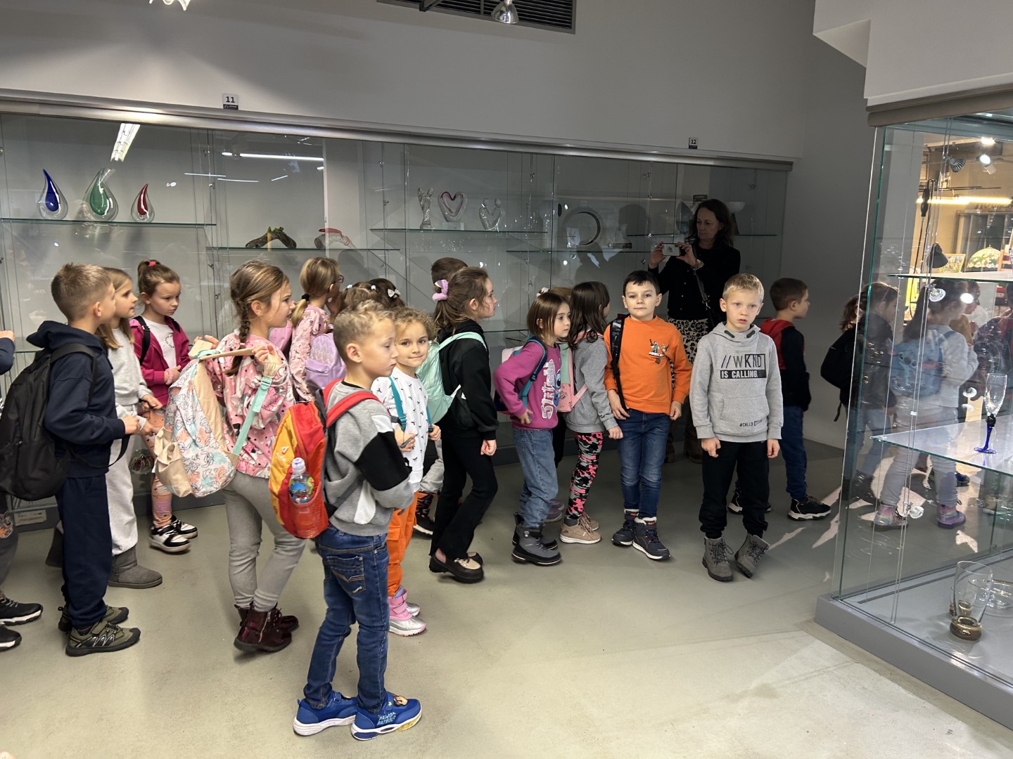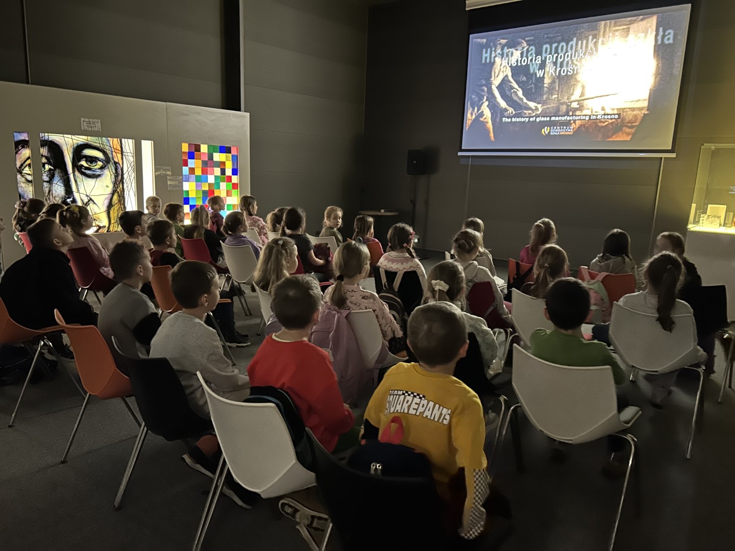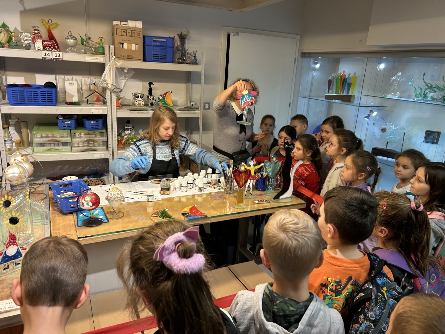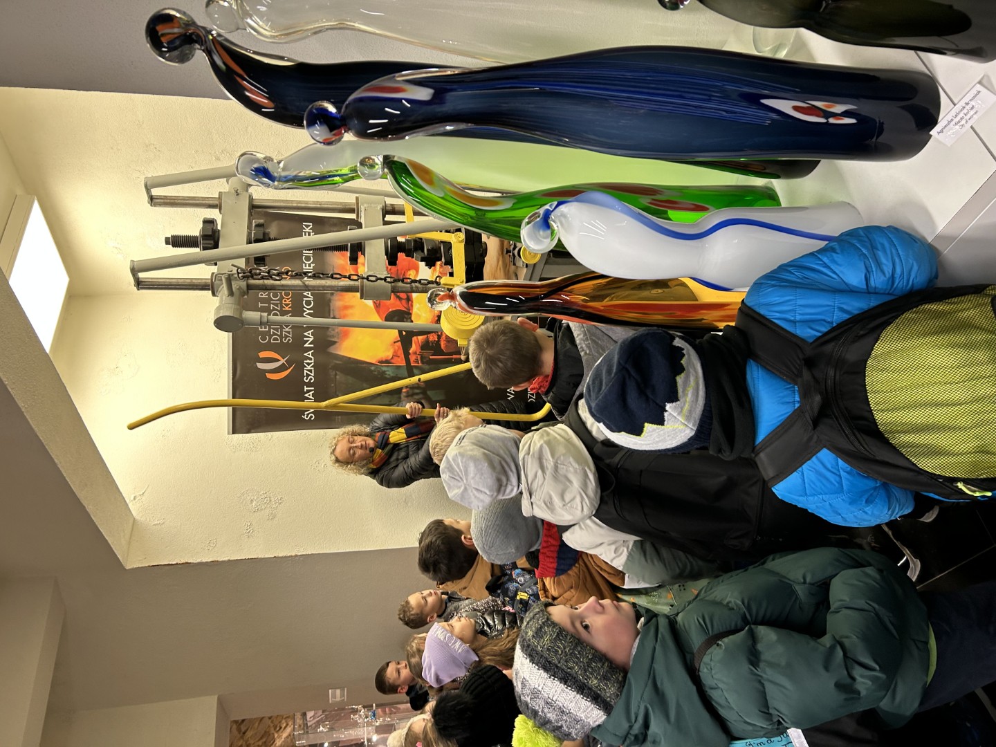 Drugim punktem wyjazdu było Centrum Dziedzictwa Szkła w Krośnie. W czasie wizyty w Centrum, uczniowie podziwiali wystawę pięknych i nowoczesnych szklanych wyrobów oraz oglądali liczne eksponaty w muzeum. Podczas zajęć edukacyjnych dzieci dowiedziały się, jak wygląda proces barwienia i szlifowania szkła, malowania na szkle oraz tworzenia witraży. Zobaczyły jak w rozgrzanym piecu wyrabia się szklane przedmioty mając możliwość obserwacji pracy hutnika na żywo. Z wielkim zainteresowaniem odciskały monety stemplem w płynnym szkle. Na zakończenie wszystkie dzieci uczestniczyły w warsztatach malowania bombek choinkowych, podczas których wykazały się ogromną kreatywnością.