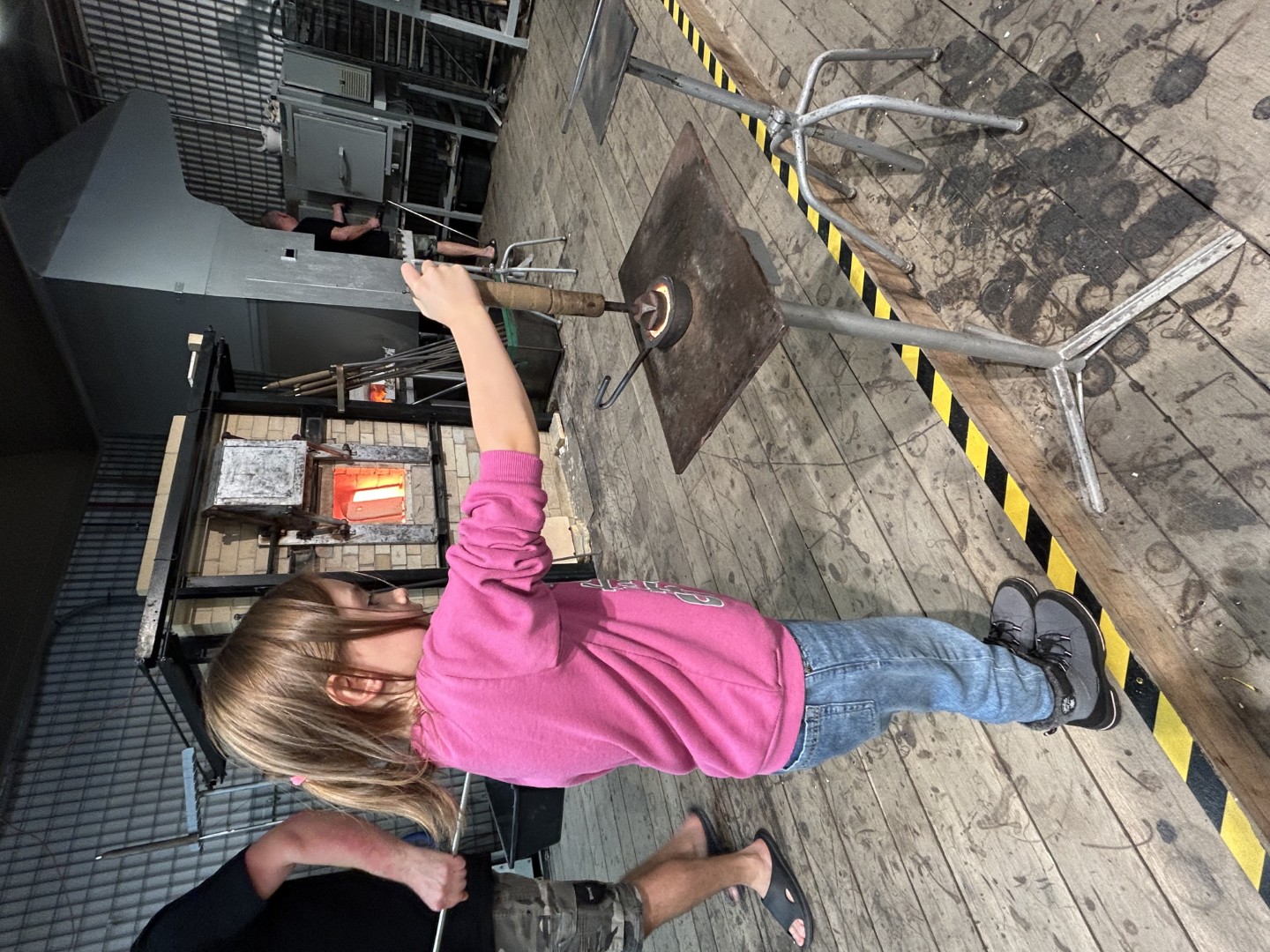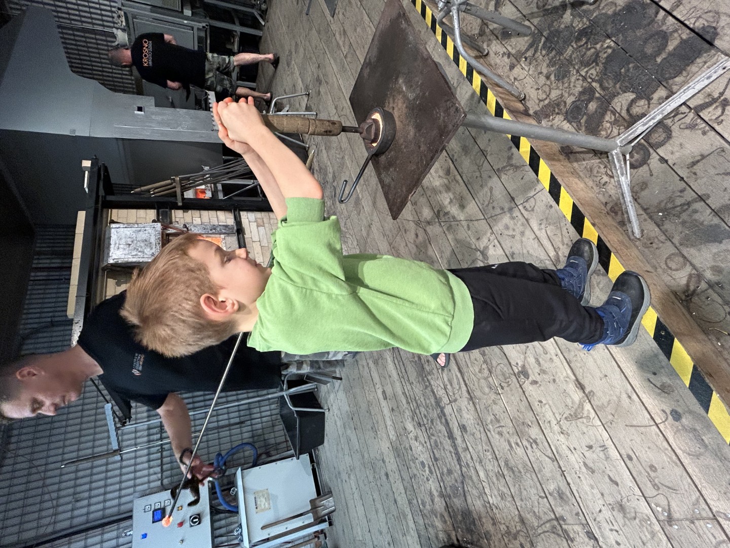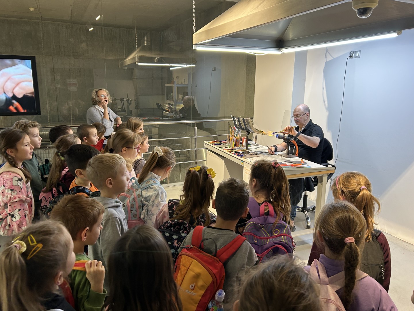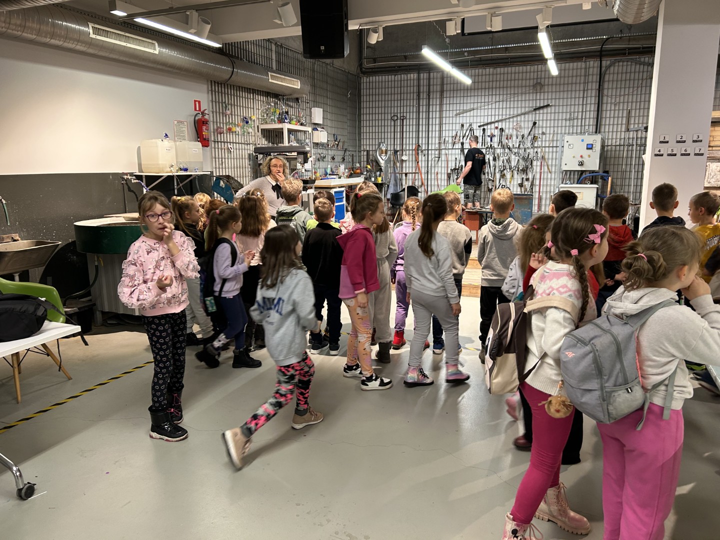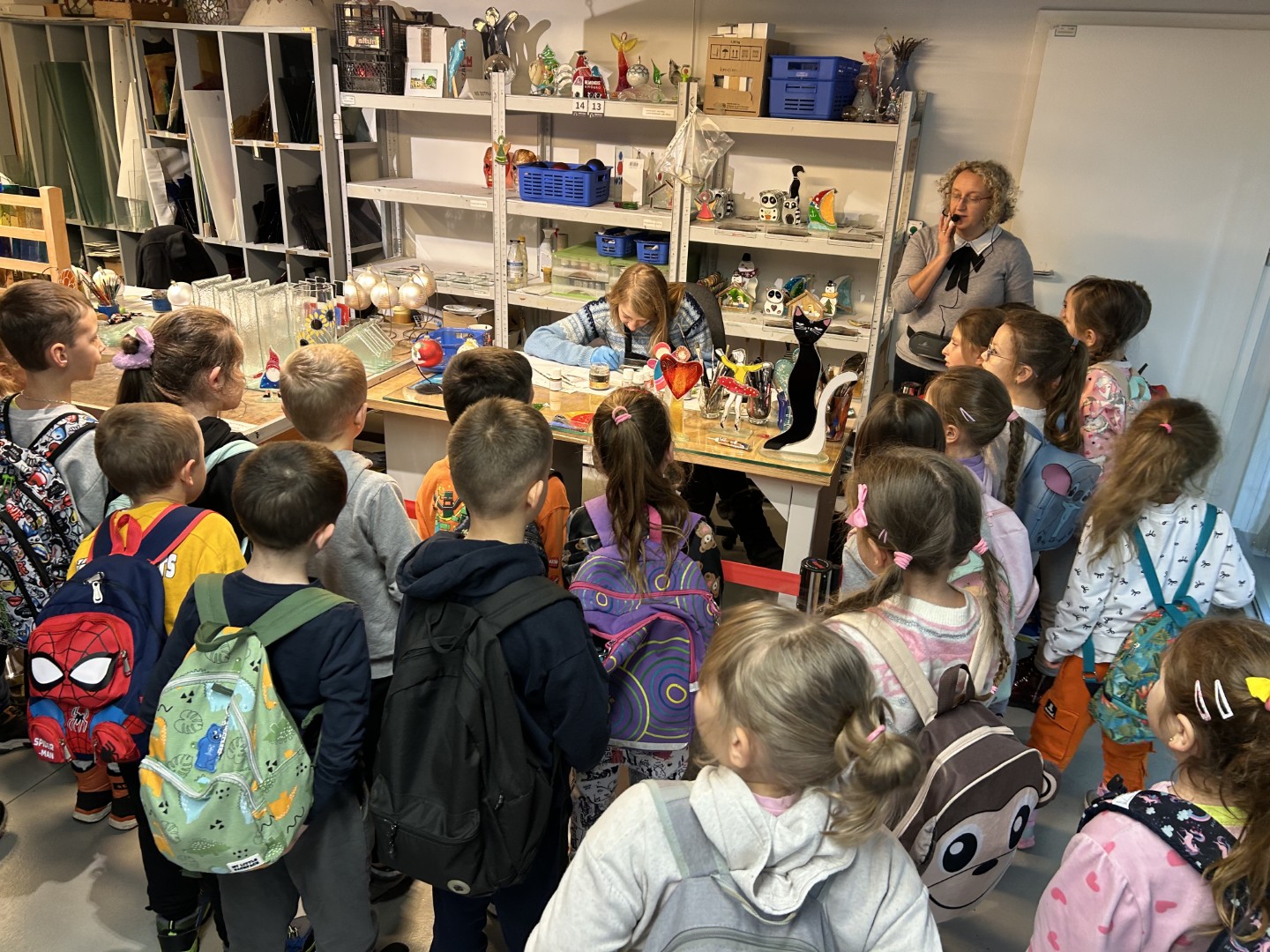 Drugim punktem wyjazdu było Centrum Dziedzictwa Szkła w Krośnie. W czasie wizyty w Centrum, uczniowie podziwiali wystawę pięknych i nowoczesnych szklanych wyrobów oraz oglądali liczne eksponaty w muzeum. Podczas zajęć edukacyjnych dzieci dowiedziały się, jak wygląda proces barwienia i szlifowania szkła, malowania na szkle oraz tworzenia witraży. Zobaczyły jak w rozgrzanym piecu wyrabia się szklane przedmioty mając możliwość obserwacji pracy hutnika na żywo. Z wielkim zainteresowaniem odciskały monety stemplem w płynnym szkle. Na zakończenie wszystkie dzieci uczestniczyły w warsztatach malowania bombek choinkowych, podczas których wykazały się ogromną kreatywnością.