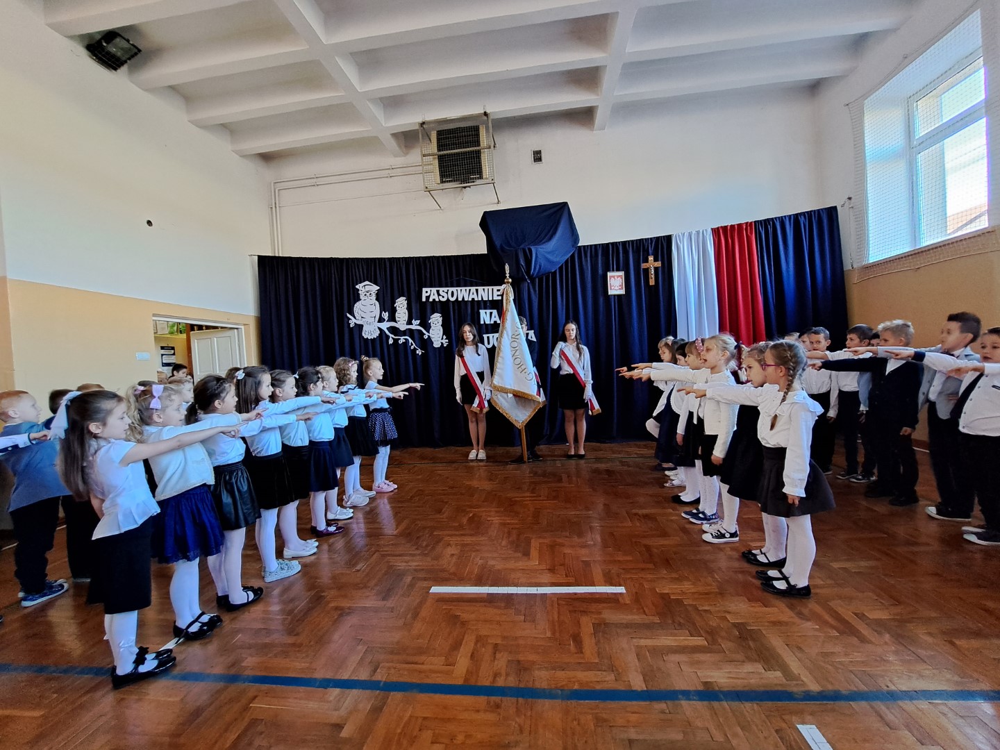 Dnia 27 października 2022 roku odbyło się w naszej szkole uroczyste pasowanie na ucznia i czytelnika. W uroczystości wzięli udział rodzice uczniów klas pierwszych, dyrektor szkoły Witold Bogdan oraz pani bibliotekarka Dorota Kozioł. Dzieci pod kierunkiem wychowawców: pani Anety Niemiec i pani Magdaleny Zielińskiej zaprezentowały się w przygotowanej części artystycznej. Powitały zgromadzonych na sali gości uroczystym i dostojnym krokiem Poloneza, recytowały wiersze, śpiewały piosenki, tańczyły i wykazały się zdobytą już do tej pory wiedzą i umiejętnościami. W trakcie uroczystości 35 pierwszoklasistów zostało pasowanych przez dyrektora szkoły Witolda Bogdana na uczniów Szkoły Podstawowej im. Bronisława Wanata a następnie przez panią Dorotę Kozioł na czytelnika. Na pamiątkę pasowania dzieci otrzymały medale, dyplomy i książeczki, zostały też obdarowane przez rodziców kubeczkami.