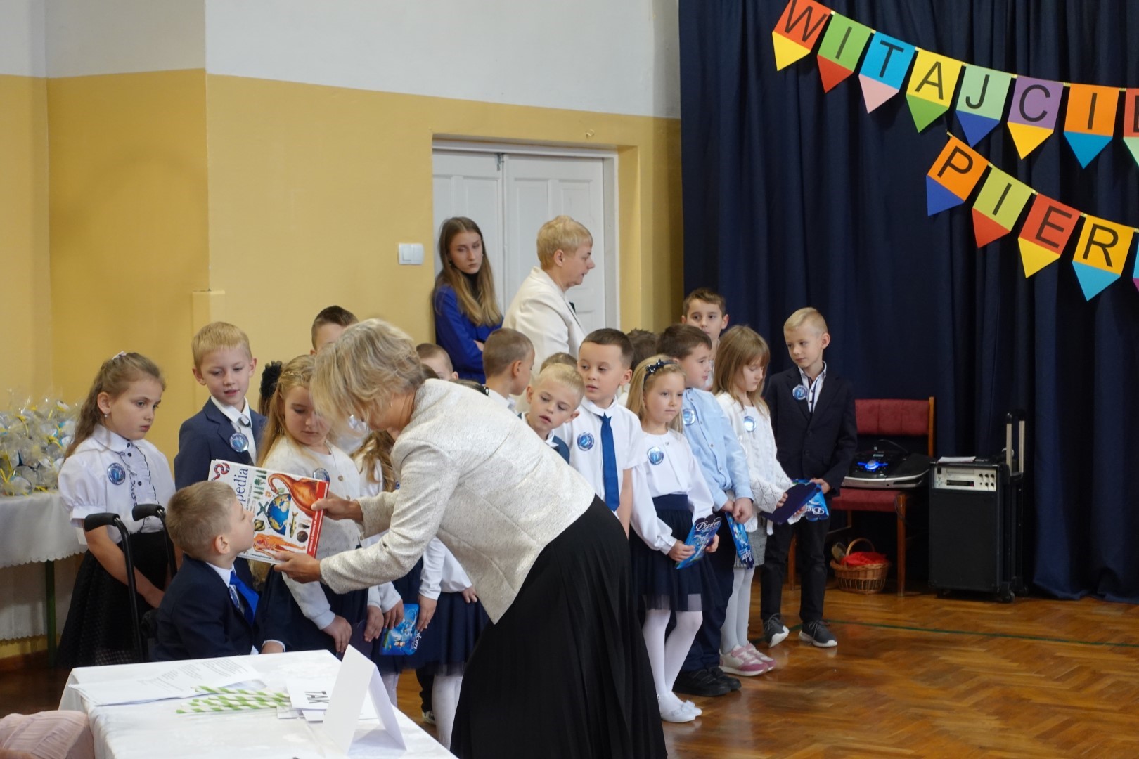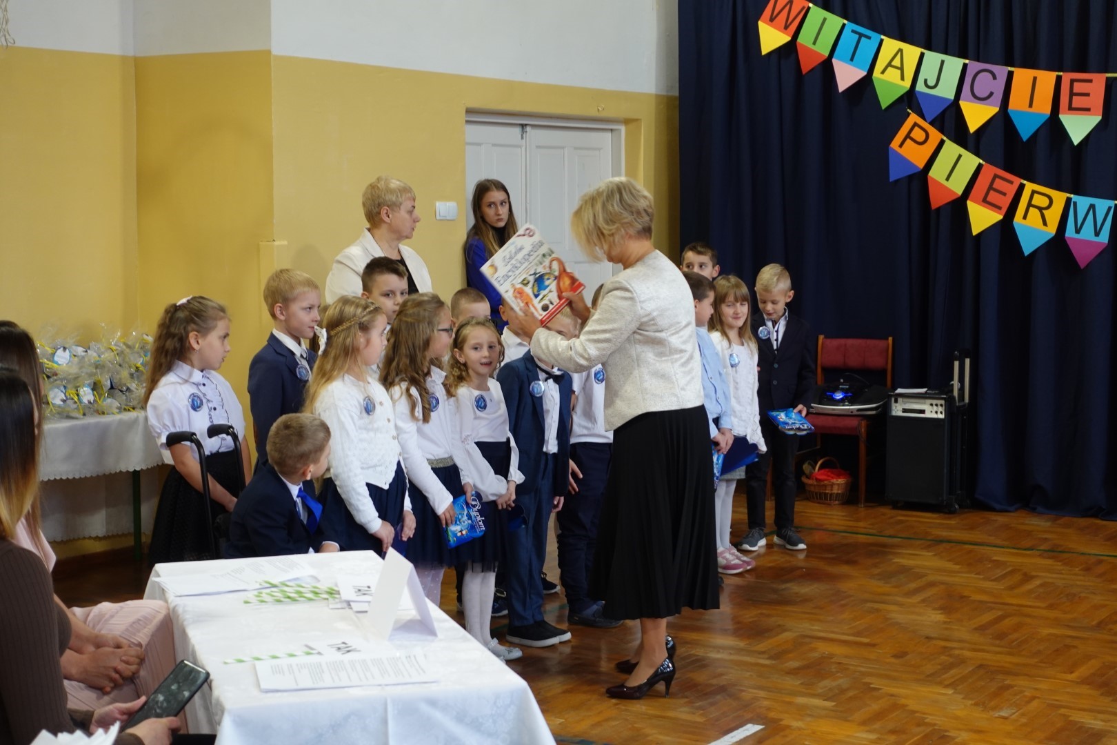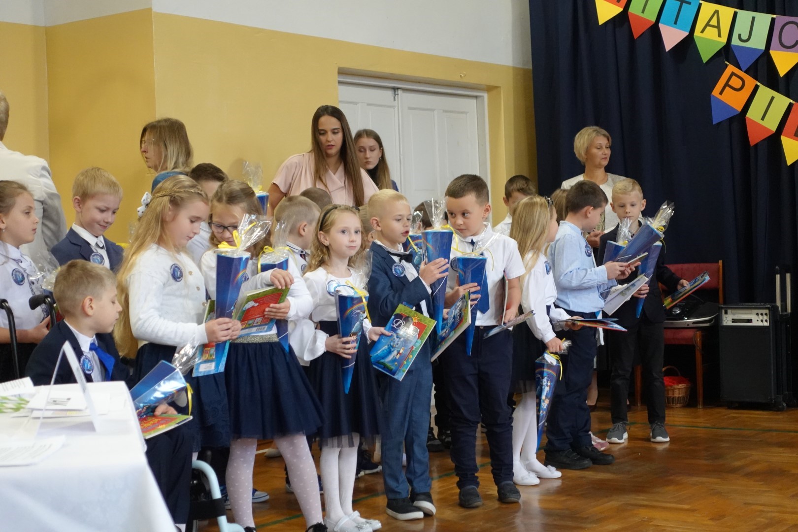 Dzień 8 listopada 2023r zapadł głęboko w pamięci pierwszoklasistów i ich rodziców. W tym bowiem dniu odbyło się Pasowanie na ucznia i czytelnika. Na uroczystość licznie przybyli zaproszeni goście. Występ uświetniła część artystyczna którą przedstawiły pierwszaki pod kierunkiem wychowawczyń; p. Janiny Szczerby i p. Krystyny Tarsa, a do której przygotowywały się od pierwszych dni pobytu w szkole. Dzieci zaprezentowały montaż słowno-muzyczny; śpiewały piosenki, recytowały wiersze o różnej tematyce, rozwiązywały zagadki. Nie zabrakło również zadań matematycznych. Pierwszaki spisały się na medal. Kulminacyjnym punktem całej uroczystości był akt Pasowania na ucznia i czytelnika. Każde dziecko otrzymało dyplom, plakietkę i książeczkę oraz słodki dodatek. Na zakończenie rodzice przygotowali słodki poczęstunek.