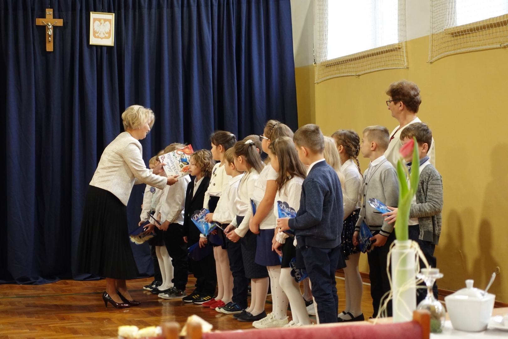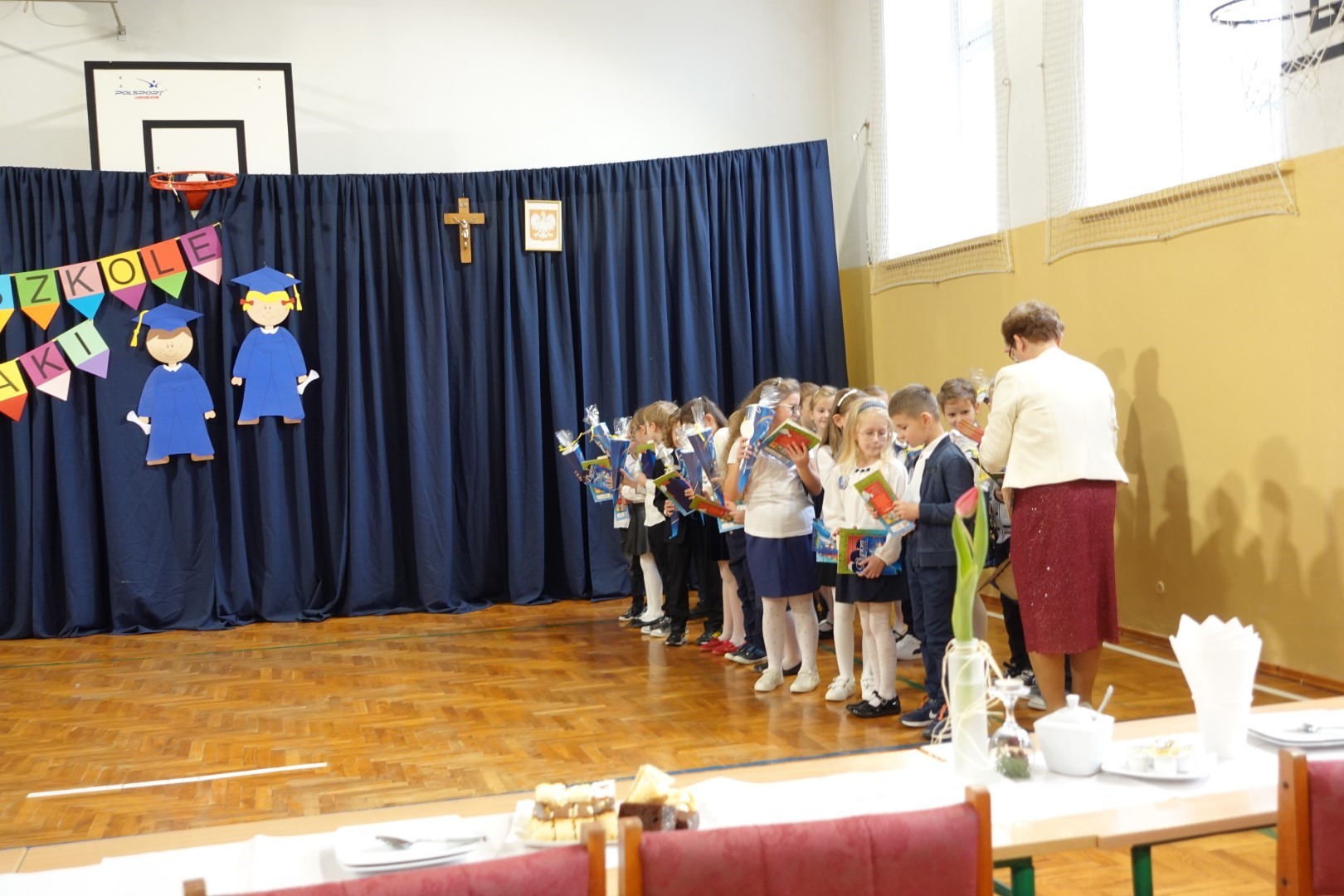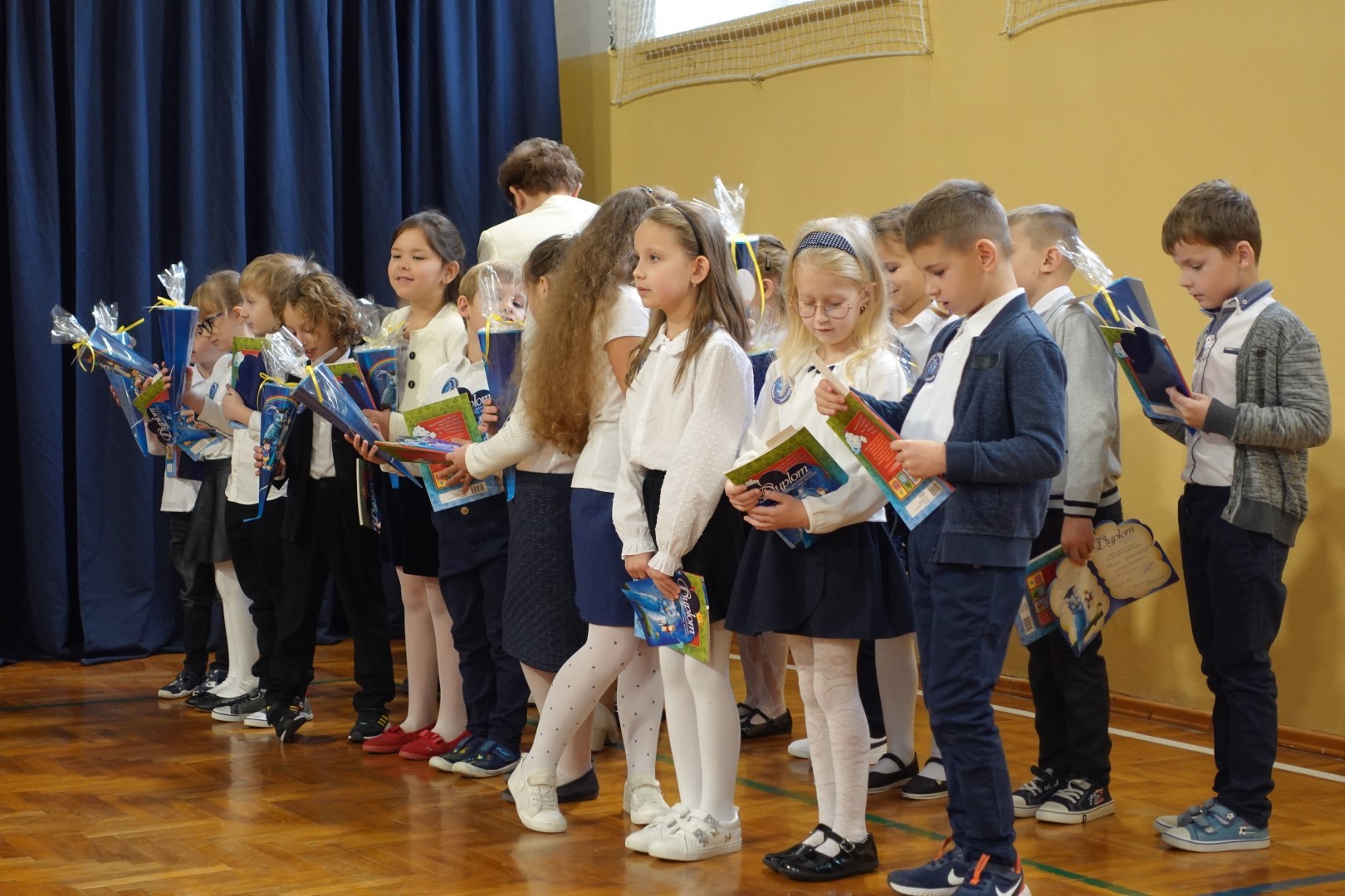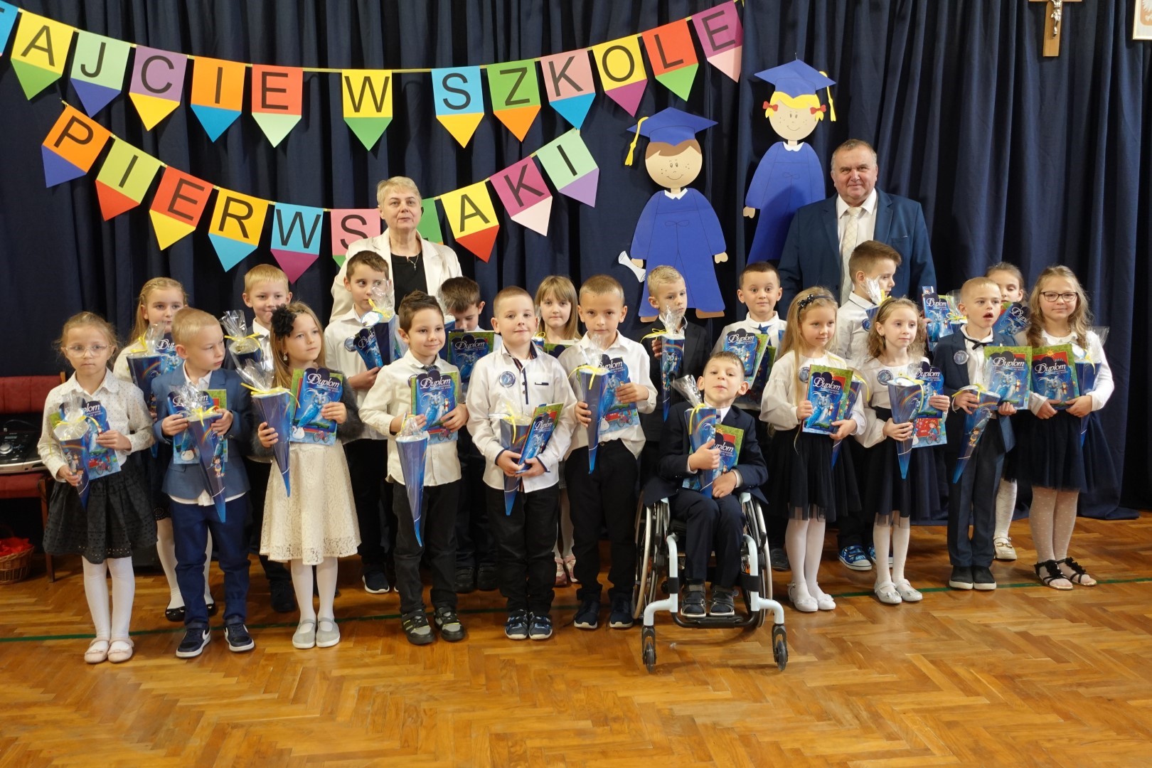 Dzień 8 listopada 2023r zapadł głęboko w pamięci pierwszoklasistów i ich rodziców. W tym bowiem dniu odbyło się Pasowanie na ucznia i czytelnika. Na uroczystość licznie przybyli zaproszeni goście. Występ uświetniła część artystyczna którą przedstawiły pierwszaki pod kierunkiem wychowawczyń; p. Janiny Szczerby i p. Krystyny Tarsa, a do której przygotowywały się od pierwszych dni pobytu w szkole. Dzieci zaprezentowały montaż słowno-muzyczny; śpiewały piosenki, recytowały wiersze o różnej tematyce, rozwiązywały zagadki. Nie zabrakło również zadań matematycznych. Pierwszaki spisały się na medal. Kulminacyjnym punktem całej uroczystości był akt Pasowania na ucznia i czytelnika. Każde dziecko otrzymało dyplom, plakietkę i książeczkę oraz słodki dodatek. Na zakończenie rodzice przygotowali słodki poczęstunek.