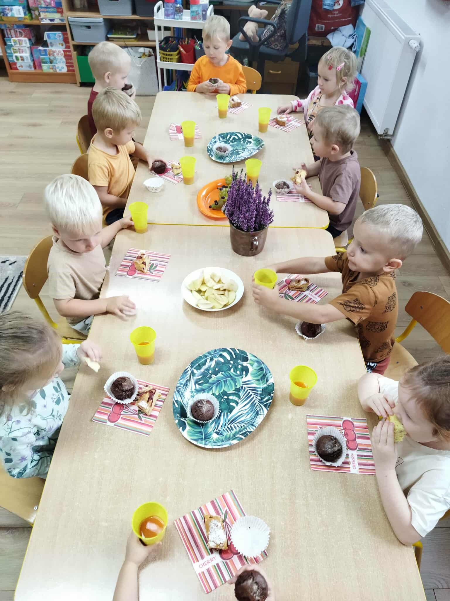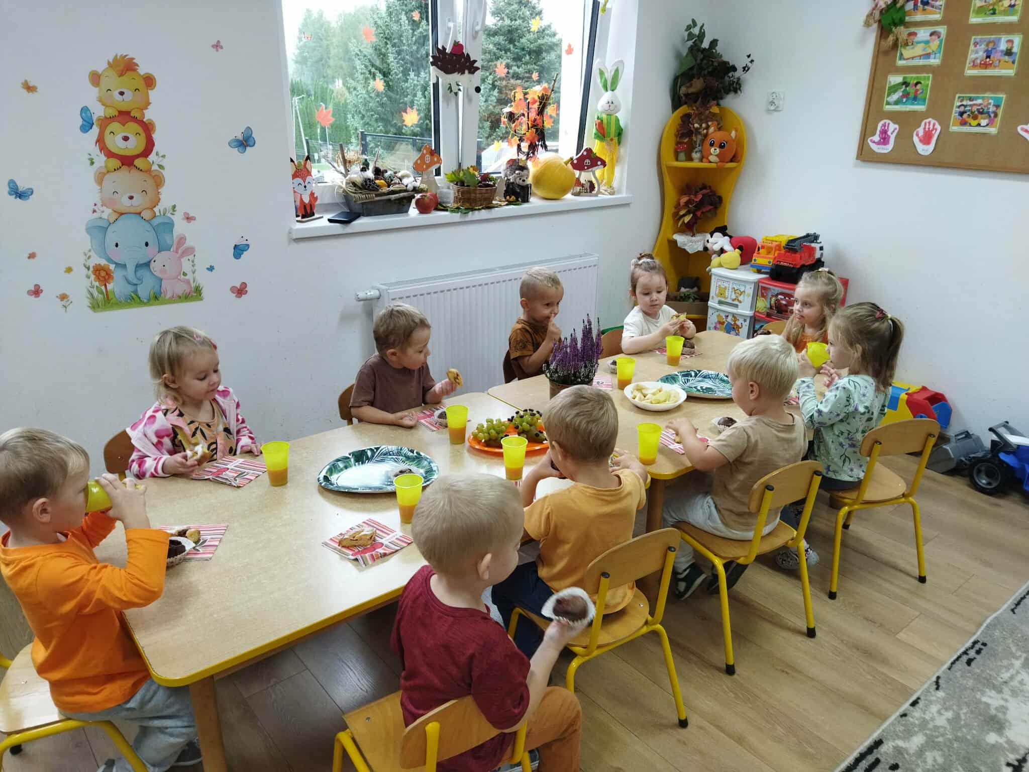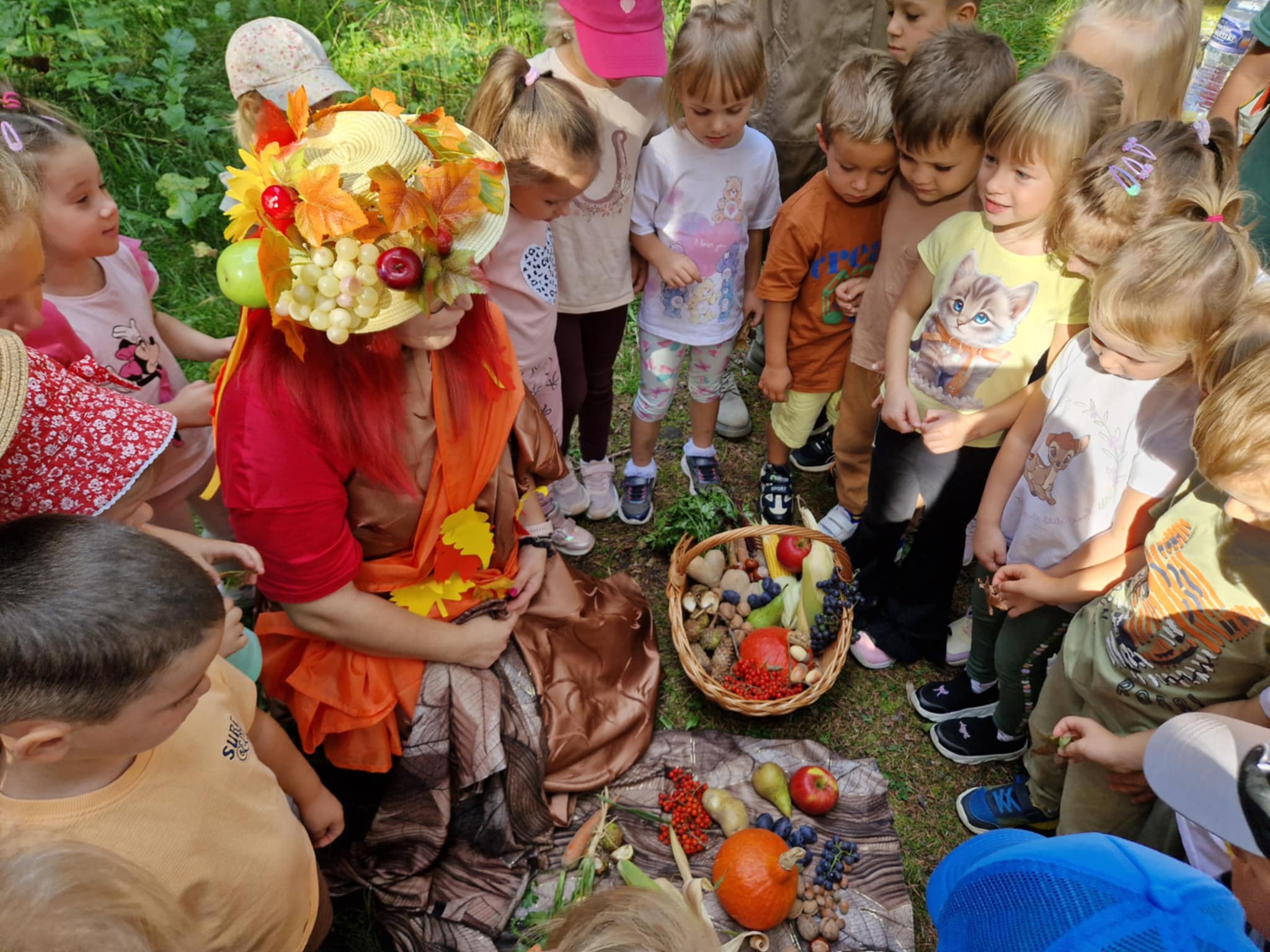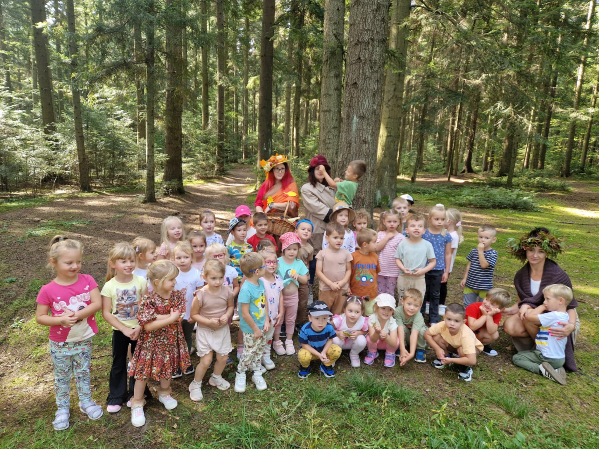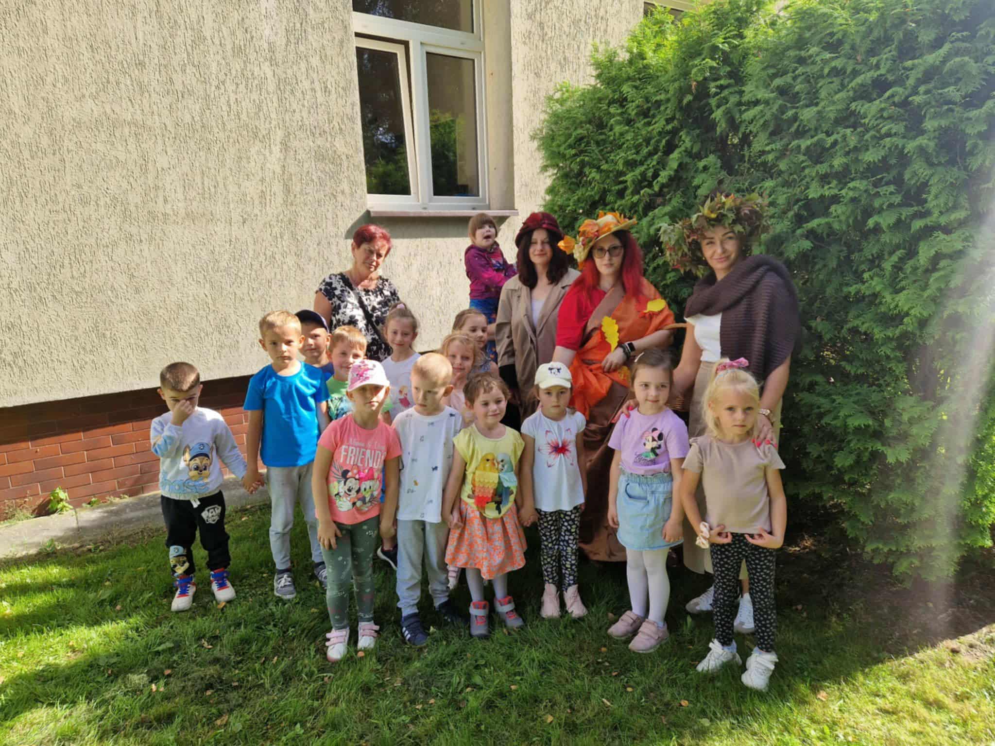 W piękny jesienny poranek 22 września przedszkolaki z grup II i III wybrały się do lasu, aby odszukać Panią Jesień. Przy wejściu do lasu spotkaliśmy jej pomocników i znaleźliśmy list z zadaniami. To nas upewniło…. Pani Jesień już tu była. Z zapałem wykonaliśmy wszystkie zadania i wtedy pojawiła się Ona – Pani Jesień, która spacerowała po lesie. Przywitała się z dziećmi i ujawniła co skrywa w swoim koszu. Po poczęstunku przygotowanym przez jej pomocników ruszyliśmy w drogę powrotną do przedszkola gdzie Pani Jesień odwiedziła pozostałe grupy.