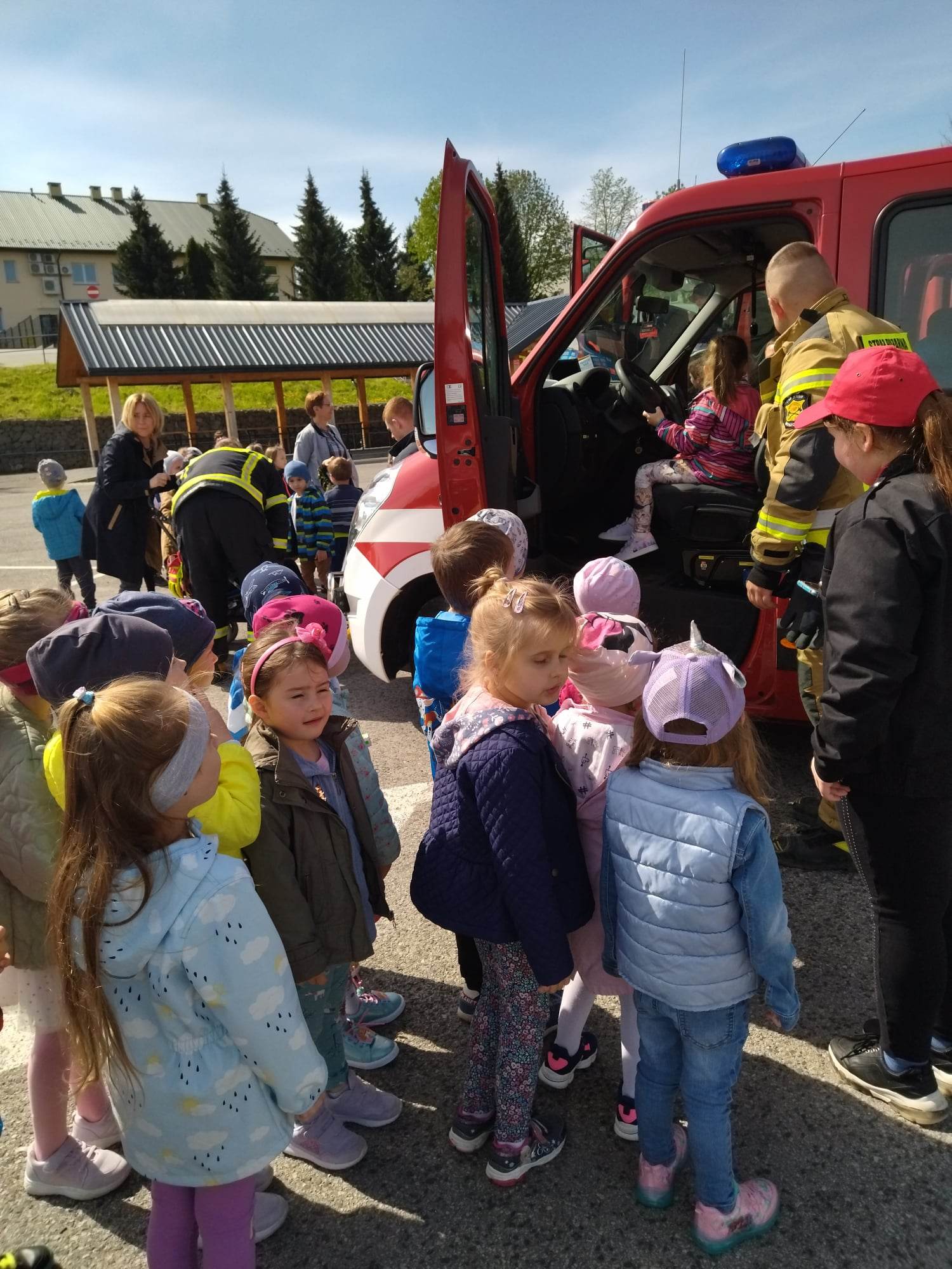 Dnia 05 maja br. strażacy z Ochotniczej Straży Pożarnej w Moszczenicy przyjechali do naszego przedszkola. Podczas spotkania na placu targowym, w którym uczestniczyły dzieci z wszystkich grup przedszkolnych, nasi wychowankowie dowiedzieli się, iż praca strażaków polega nie tylko na gaszeniu pożarów, ale również na udzielaniu pomocy ludziom podczas powodzi i wypadków samochodowych. Największe zainteresowanie wzbudził wóz strażacki, którym przyjechali nasi goście. Strażacy zademonstrowali wykorzystywaną w akcjach aparaturę oraz wyposażenie wozu strażackiego, między innymi: gaśnice, węże oraz sprzęt służący do pomocy podczas wypadków. Pod czujnym okiem strażaków, dzieci mogły samodzielnie przekonać się, jak działa prądownica wodna. Ogromną atrakcją było wejście do wozu strażackiego i możliwość przymierzenia kasku. Dla wszystkich była to naprawdę wspaniała przygoda, podczas której wiele się nauczyliśmy.