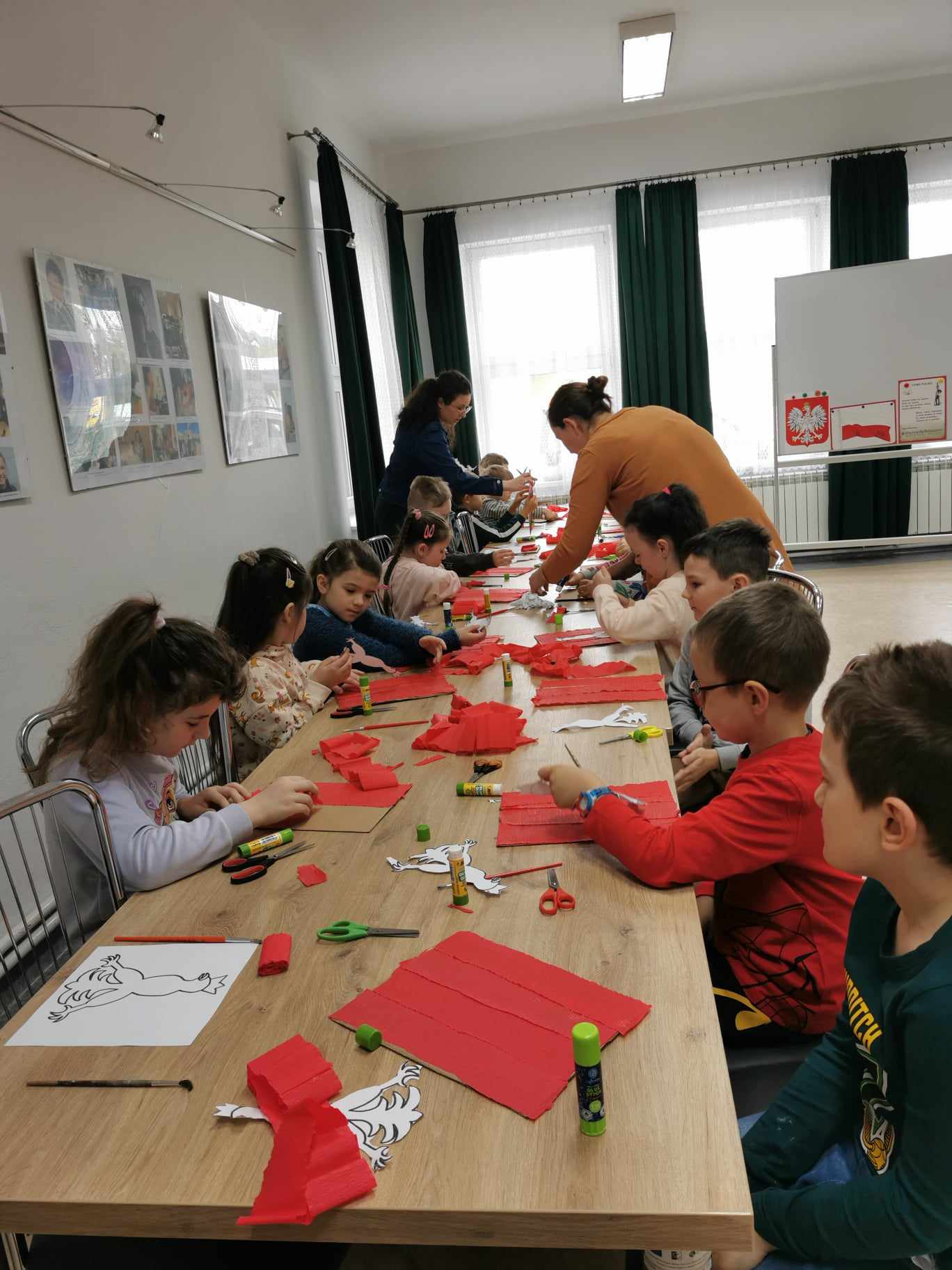 Tuż przed „świętami majowymi” przedszkolaki ze starszych grup wzięły udział w zajęciach w OKiB w Moszczenicy o tematyce patriotycznej pod nazwą „Moje symbole narodowe”. Przedszkolaki miały okazję utrwalić wygląd i nazwy polskich symboli narodowych – jaki należy mieć do nich szacunek, co oznacza pojęcie patriotyzm i patriota. W postawie stojącej, odśpiewały hymn narodowy przy akompaniamencie pianina. Na zakończenie warsztatów wykonały pracę plastyczna przedstawiającą Orła Białego. Za uczestnictwo w warsztatach każdy przedszkolak otrzymał małą flagę Polski.