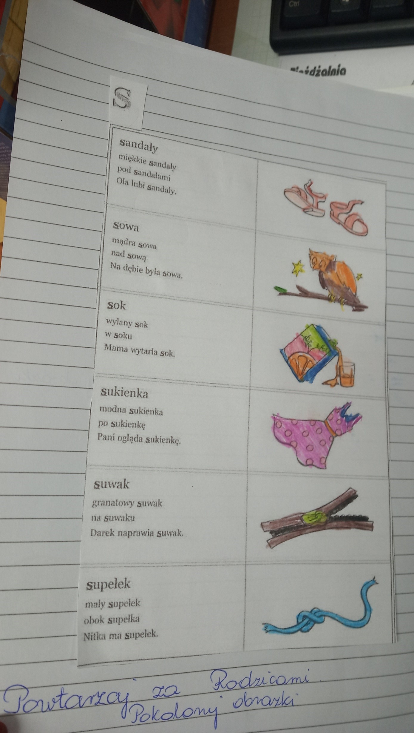 Po każdych zajęciach uczniowie otrzymują materiał do utrwalania w domu. Wszyscy mają założone zeszyty, gdzie wklejają wyjaśnione ćwiczenia oraz podawane są wskazówki do pracy z rodzicami.