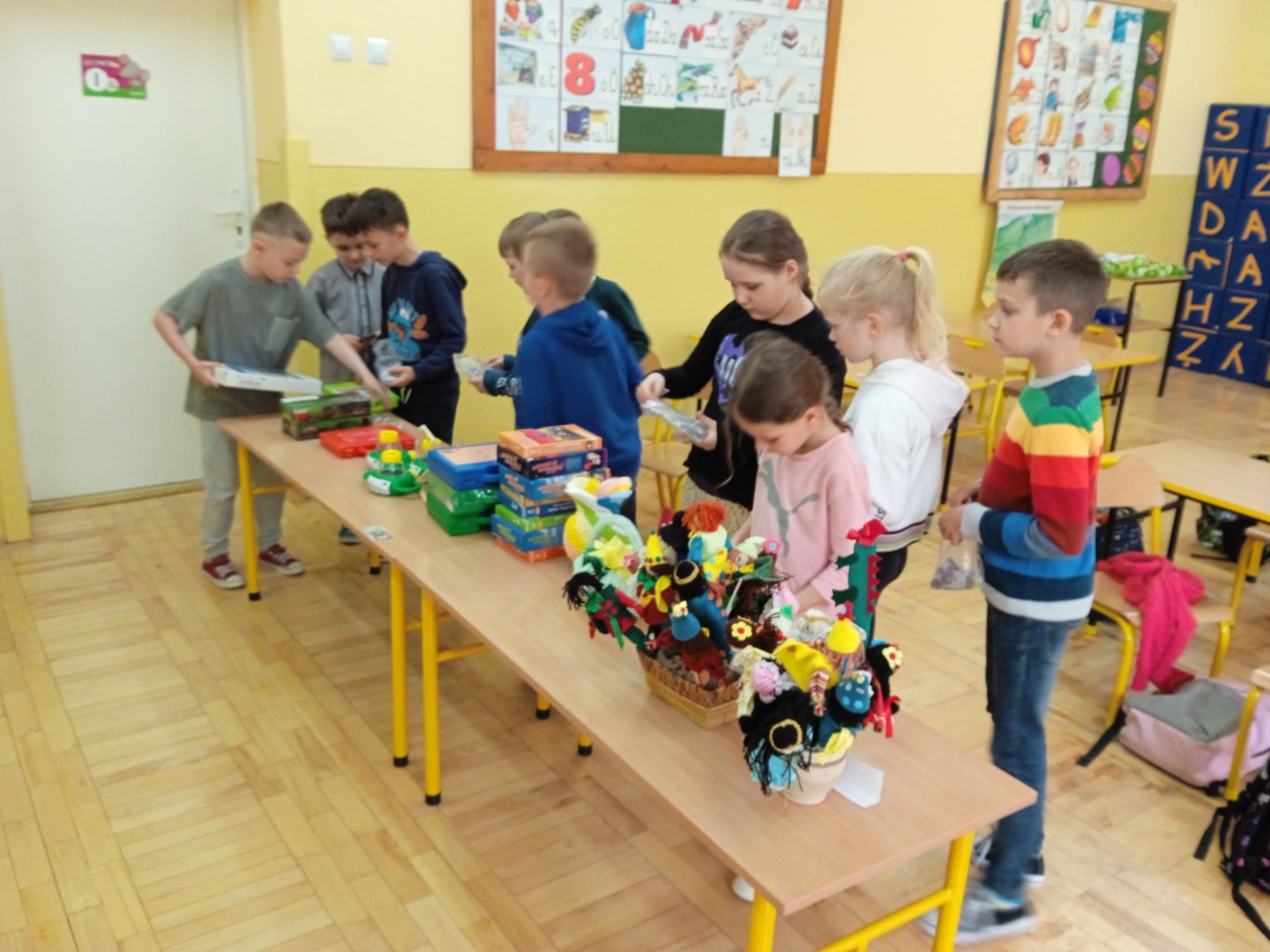 Uczniowie klas pierwszych w ramach zajęć z języka angielskiego w drugiej połowie marca oraz w kwietniu poznali nazwy: produktów spożywczych oraz grup żywności. Wyrażali swoje upodobania żywieniowe oraz poznali nazwy symboli związanych ze Świętami Wielkanocnymi. Uczniowie zostali zapoznani z nazwami przyborów szkolnych, wyposażenia klasy oraz nazwami czynności wykonywanych w klasie. Utrwalali słownictwo poprzez gry i zabawy językowe, rymowanki, piosenki oraz gry interaktywne. Wykonali plakat: „Food” oraz nagrali piosenkę: „Sweet house”.
