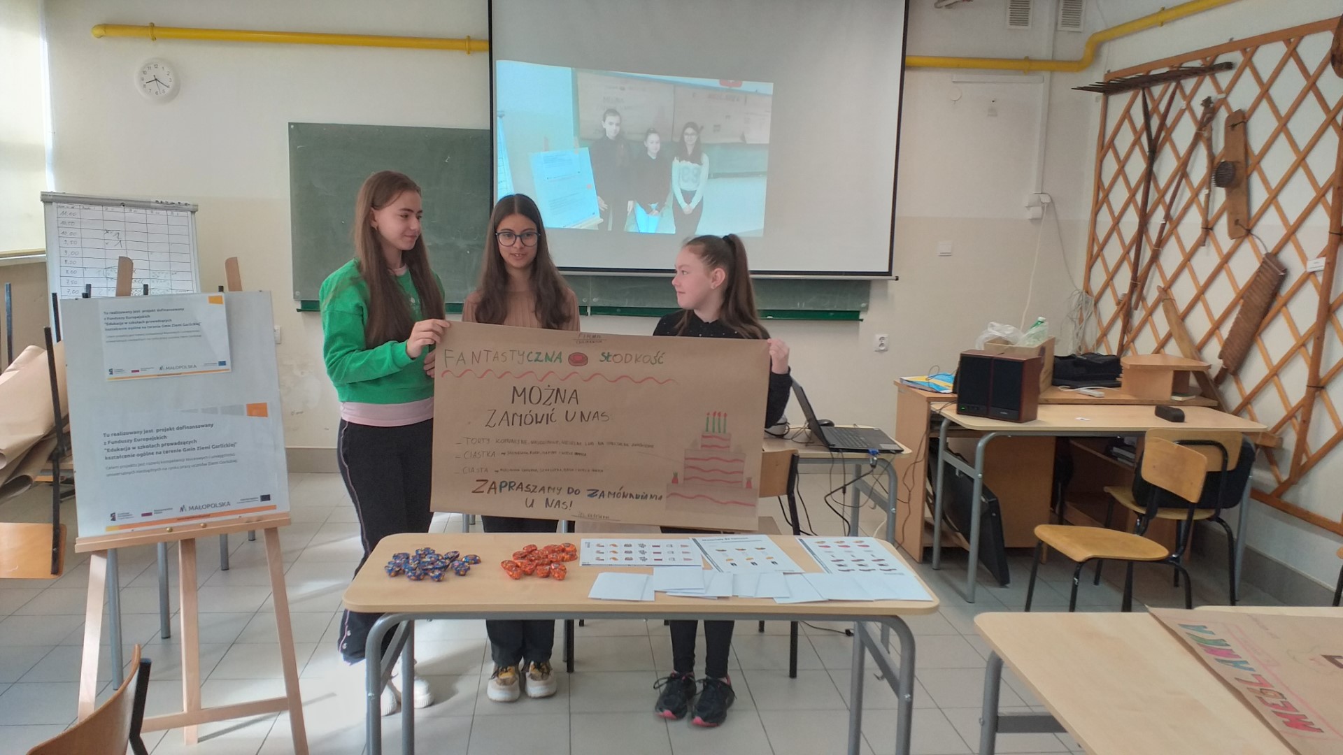 W sobotę 9 kwietnia spotkaliśmy się w projekcie ,,Edukacja w szkołach prowadzących kształcenie ogólne na terenie Gmin Ziemi Gorlickiej” na zajęciach z zakresu „Inicjatywność i przedsiębiorczość”. W czasie spotkania tradycyjnie pracowaliśmy w grupach. Każda z trzech grup wylosowała jedno z haseł: handel, usługi, produkcja. W pierwszej części zajęć uczestnicy w swoich kategoriach wypisywali firmy działające w Moszczenicy. Okazuje się, ze nawet z pomocą Internetu nie jest to łatwe zadanie. Spacer w okolicy szkoły wykazał, że sporo reklam, które codziennie widzimy, nie zawsze trafia do naszej świadomości. Wspólna analiza na koniec tej części zajęć nagle uświadamiała uczestnikom, że nie pamiętali nawet o firmie, której właścicielem jest ciocia, czy wujek. W drugiej części zajęć każda grupa w swojej kategorii miała wymyśleć nową firmę, która bardzo sprawdzi się na naszym rynku. Należało wybrać rodzaj działalności, nazwę, znaleźć siedzibę. Później trzeba było zrobić wstępny biznesplan, ocenić, czy działalność przyniesie zyski. Na koniec firmy tworzyły swoją reklamę wizualną oraz scenkę reklamową – tradycyjnie nagrywaną, by ją później ocenić. Tym razem na zakończenie zajęć były tradycyjnie nagrody – słodkie wafelki.