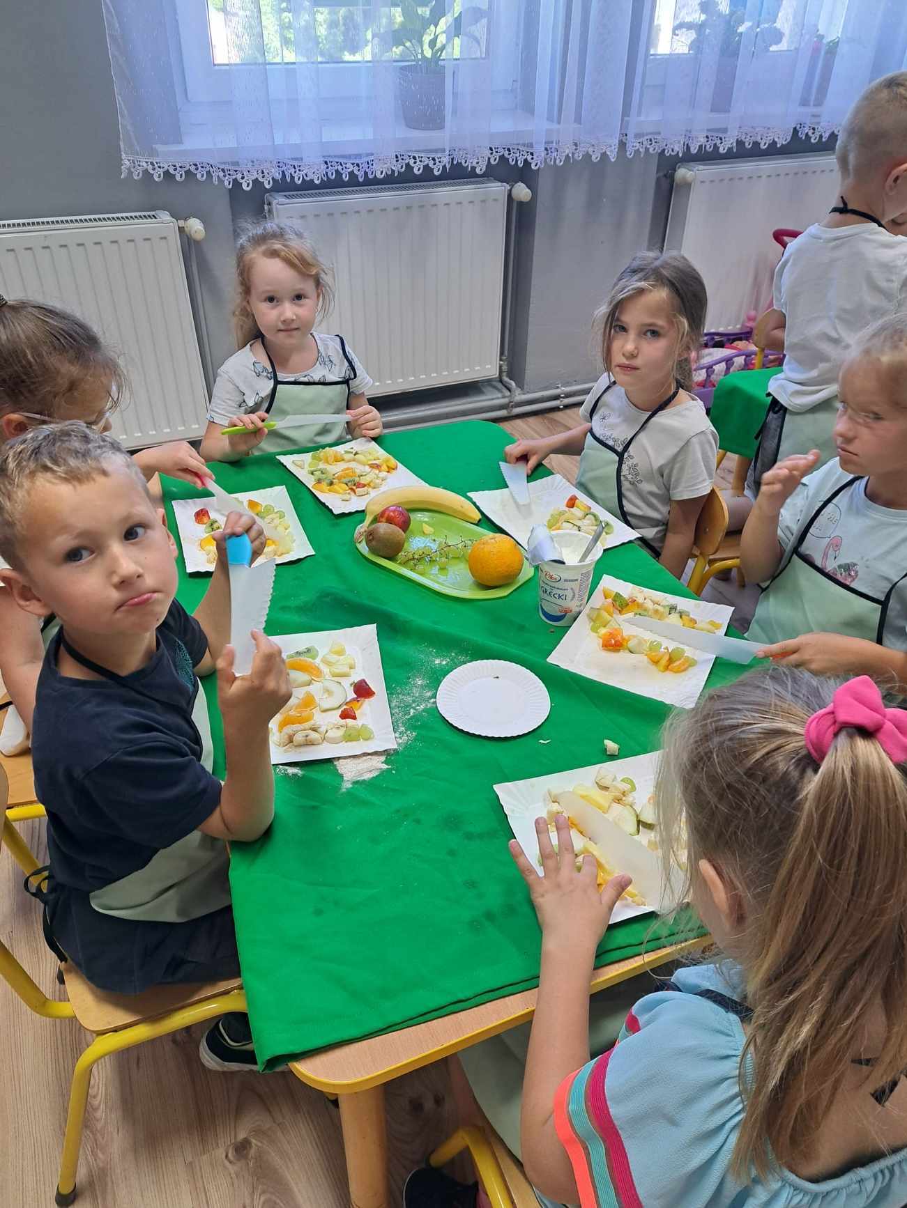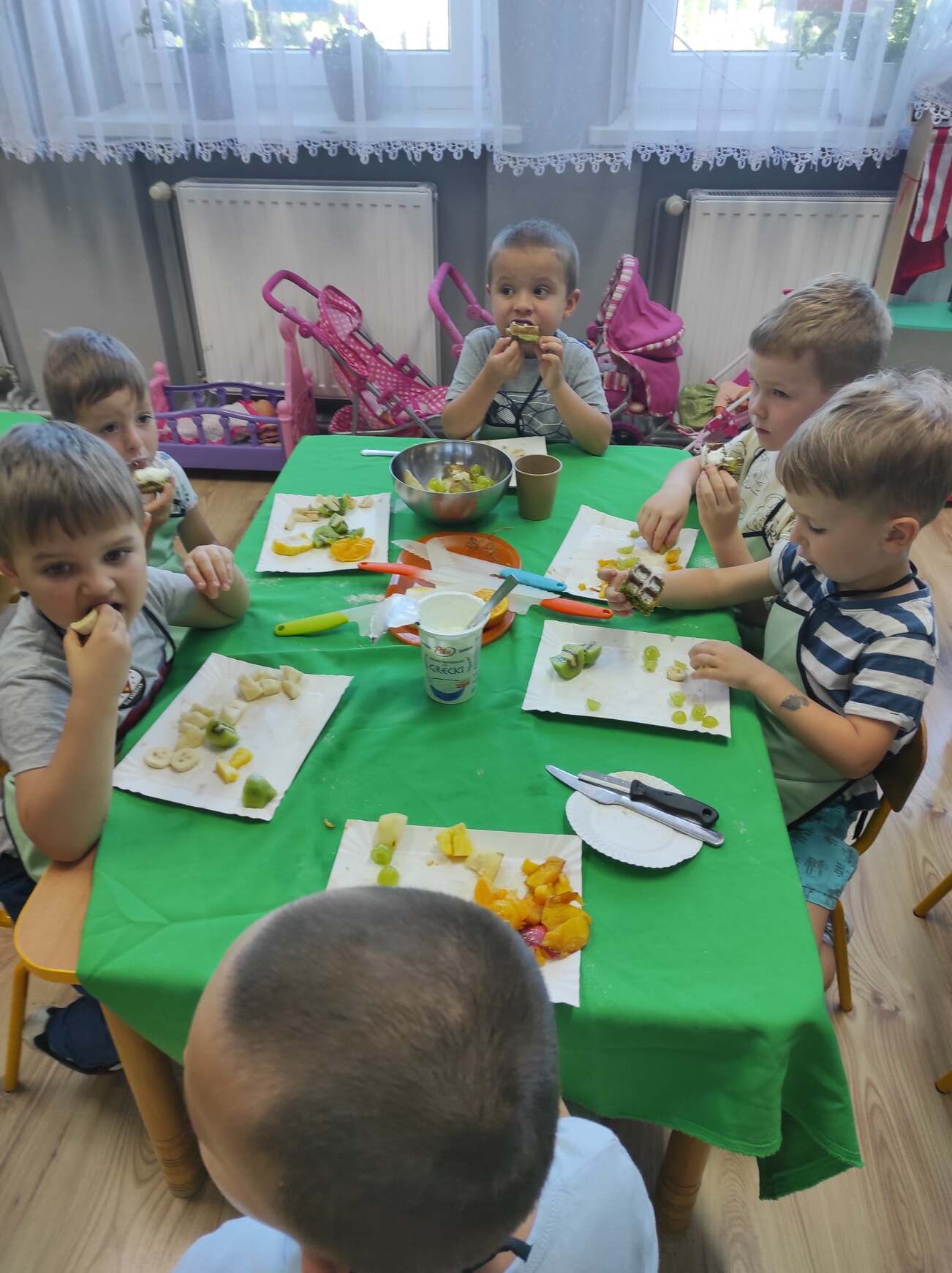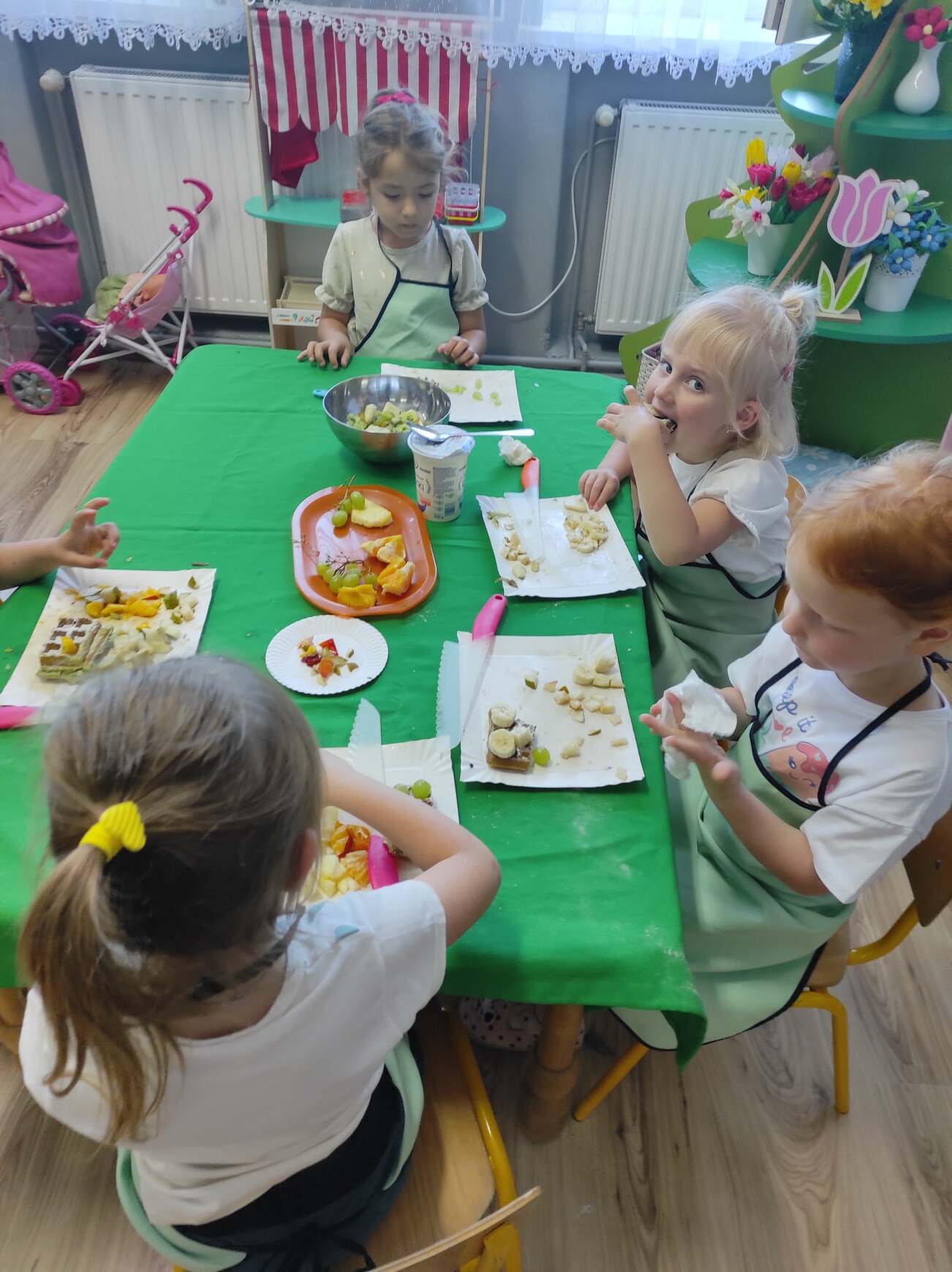 17 czerwca w naszym przedszkolu mieliśmy okazję gościć panią dietetyk z firmy Kreator Zdrowia. Bohaterem zajęć były produkty zbożowe. Dowiedzieliśmy się dlaczego warto je jeść i wybierać szczególnie te pełnoziarniste. Poznaliśmy różne produkty zbożowe. Po krótkiej pogadance zabraliśmy się do pieczenia pełnoziarnistych, zielonych gofrów. Każdy przedszkolak miał okazję spróbować swoich sił kulinarnych. Wspólne przygotowywanie ciasta i krojenie owoców było przyjemną zabawą, a jeszcze przyjemniejsza była degustacja tego, co sami upiekliśmy. To kolejne nowe doświadczenie naszych dzieci, które pokazało, iż w naszym przedszkolu nie ma czasu na nudę.