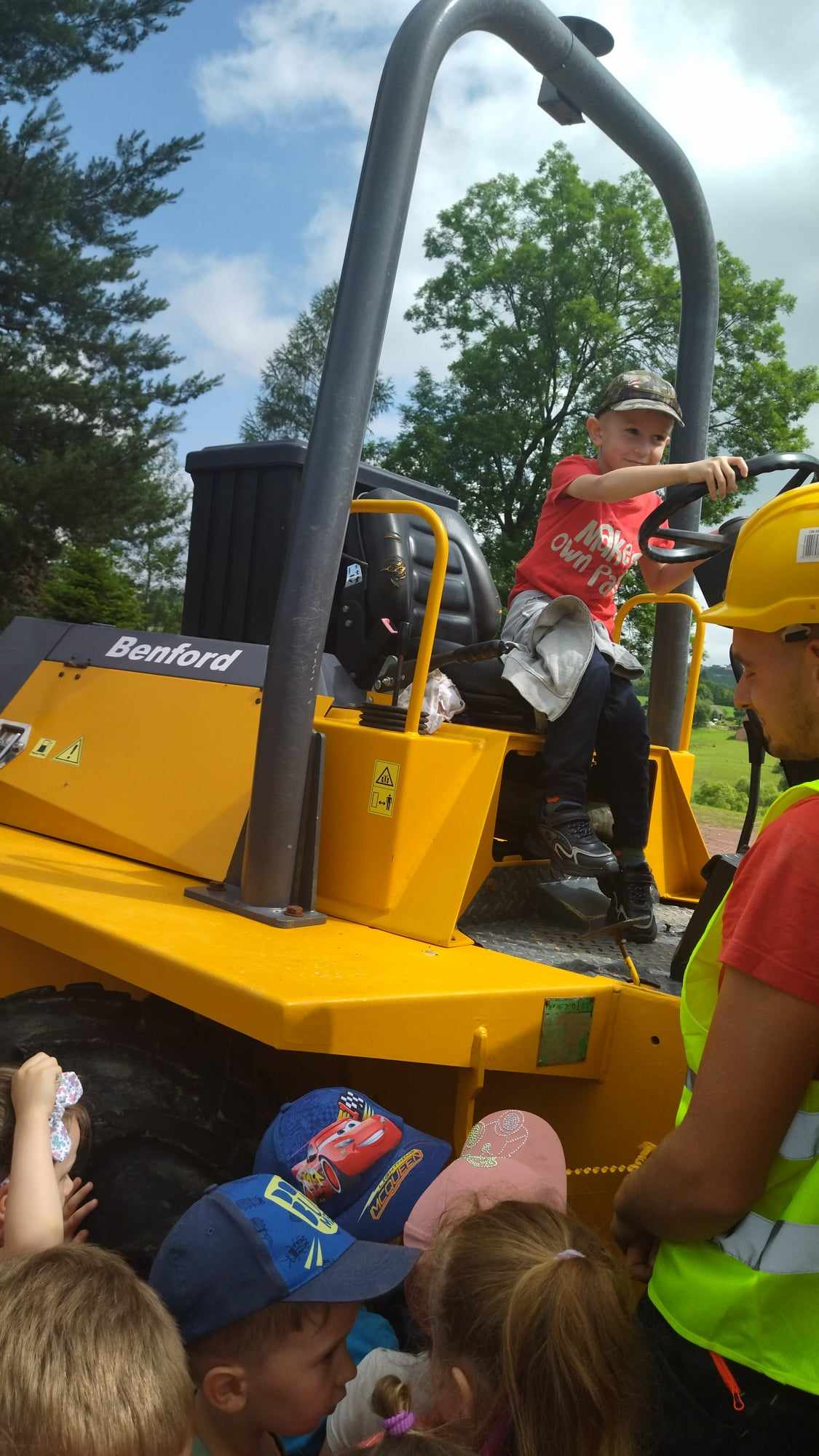 Dnia 5 czerwca dzieci odwiedziła firma budowlana So-Bud Sebastian Olszewski zajmująca się usługami budowlanymi. Na wstępie dzieci poprzez krótkie opowiadanie zostały zapoznane z charakterystyką zawodu, poznały pojazdy budowlane, odpowiednie narzędzia. Ależ to była niesamowita zabawa! Każdy chciał przymierzyć kask, kamizelkę oraz usiąść za kierownicą koparki. Dla wielu przedszkolaków było to pierwsze zetknięcie z tego typu sprzętami. Satysfakcja i duma rozpierała dzieci.
