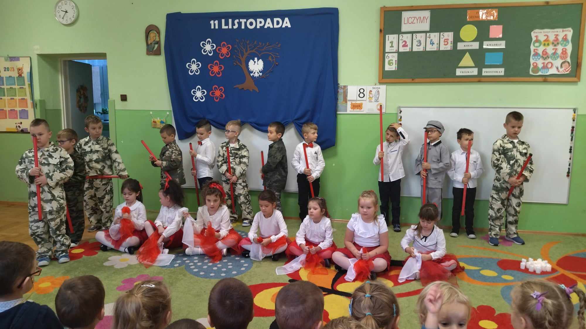 Dzień 11 listopada został uczczony w naszym przedszkolu bardzo uroczyście. Dnia 9 listopada dzieci z najstarszej grupy pod kierownictwem pani Edyty Kotowicz przygotowały występ upamiętniający Dzień Niepodległości. W krótkim spektaklu zostały ujęte najważniejsze fakty. Przedszkolaki w ogromnym skupieniu wysłuchały opowieści, którą pięknie zaprezentowały nam Starszaki. Na koniec występu dumnie, przyjmując postawę „na baczność” wszystkie przedszkolaki wraz z zaproszonymi Gośćmi odśpiewały hymn Polski „Mazurek Dąbrowskiego”. Wszystkie dzieci tego dnia wyglądały odświętnie i uroczyście a na ich piersi widniały kotyliony w barwach narodowych. Dzień Niepodległości był bardzo radosnym dniem w naszym przedszkolu i mamy nadzieję, że zapadnie on w pamięci naszych „Małych Polaków”.
