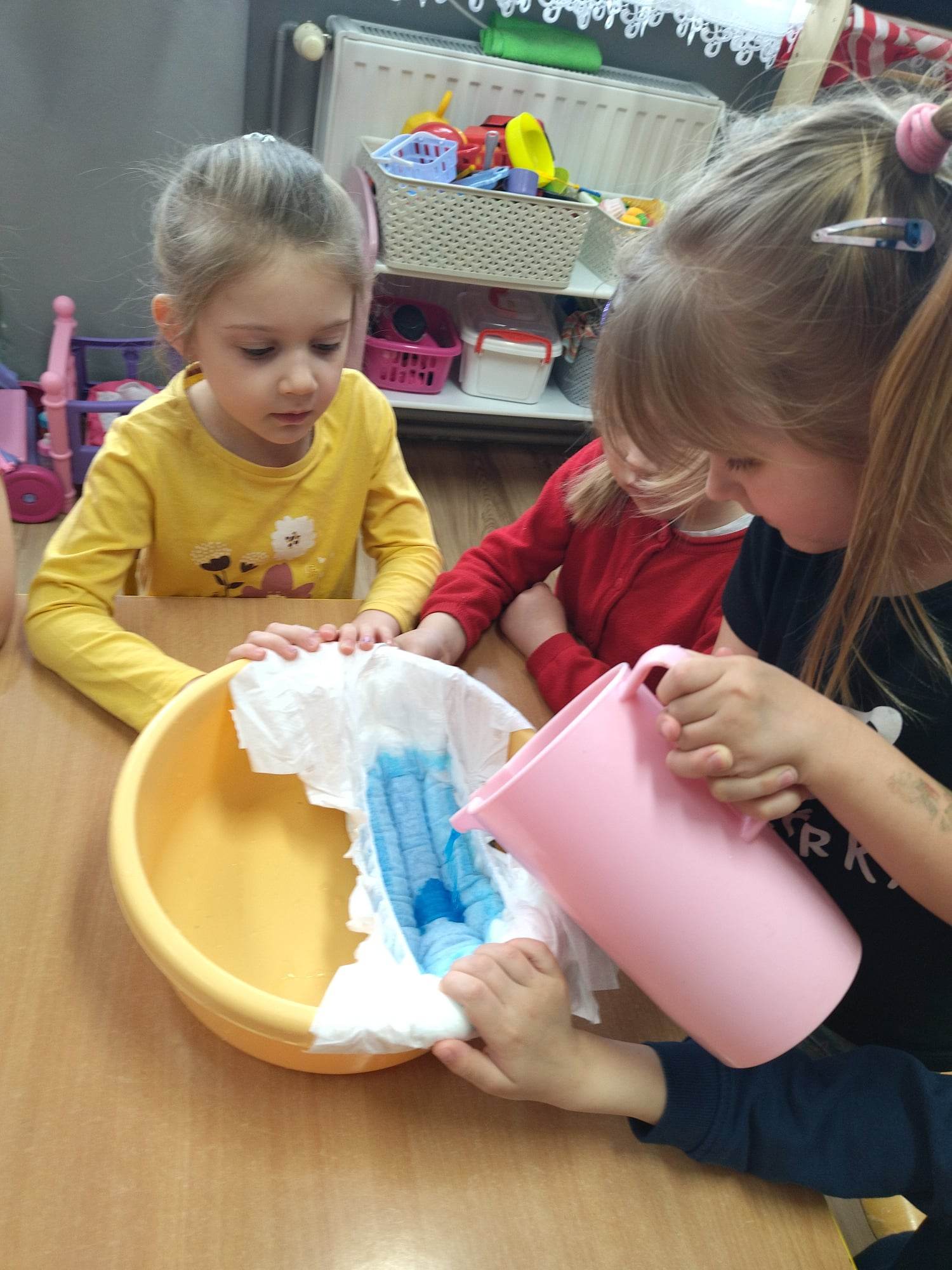 22 marca w naszym przedszkolu odbył się Dzień Wody. W tym dniu wspólnie odkrywaliśmy tajemnice wody i jej znaczenie dla życia ludzi, zwierząt i roślin. Postanowiliśmy połączyć zajęcia edukacyjne ze świetną zabawą. Dzieci poznały wędrówkę kropel wody i dowiedziały się skąd się bierze deszcz. Przedszkolaki wysłuchały opowiadania „Wróżka z Kryształowego Jeziora” - dowiedziały się jak oszczędzać wodę i dlaczego jest to ważne dla naszego środowiska. W czasie zabaw badawczych bliżej przyjrzeliśmy się wodzie. Badaliśmy rozpuszczalność różnych substancji w wodzie oraz jakie materiały pochłania woda, a jakie nie. Bawiliśmy się piaskiem hydrofobowym i porównywaliśmy go ze zwykłym piaskiem. Liczyliśmy, ile kostek cukru znajduje się w poszczególnych napojach oraz tworzyliśmy tęczę z połączenia cukierków Skittles z wodą. Po tych ciekawych zajęciach dzieci wiedzą, jak ważną rolę odgrywa woda w życiu człowieka i rozumieją, dlaczego i w jaki sposób należy oszczędzać wodę.