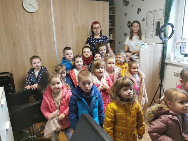 Dnia 09 marca dzieci z młodszych grup przedszkolnych wybrały się na wycieczkę do pobliskiego salonu kosmetycznego "Secret Beauty" oraz salonu fryzjerskiego "ChangeMe". W salonie kosmetycznym przedszkolaki oglądały pomieszczenia, poznały wyposażenie oraz przyrządy potrzebne do pracy kosmetyczce. Podczas pobytu miały możliwość zapoznać się z pracą kosmetyczki - dowiedziały się jakie zabiegi kosmetyczne i zdrowotne wykonuje kosmetyczka. Dziewczynki mogły poczuć się jak prawdziwe klientki, poddały się zabiegowi malowania paznokci kolorowymi lakierami.
