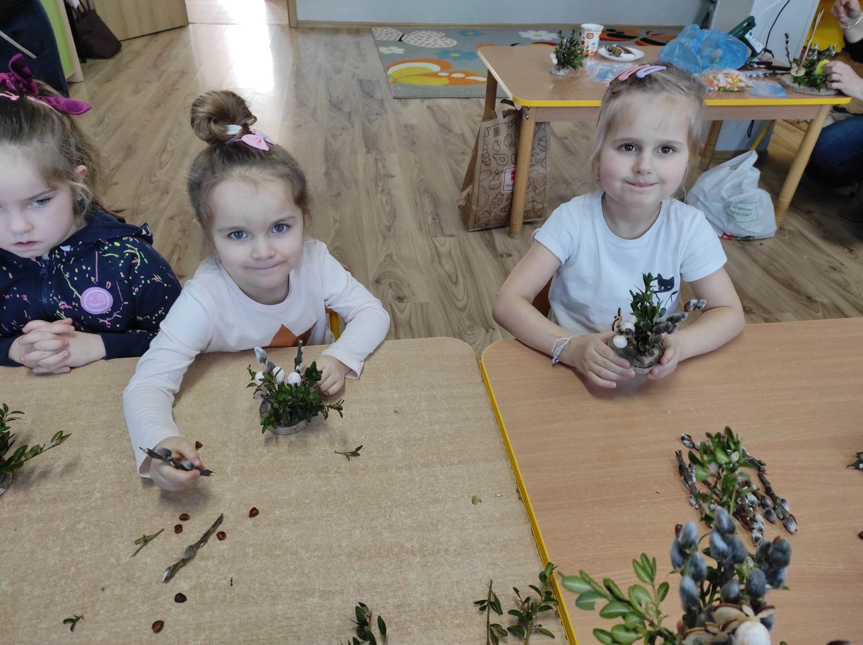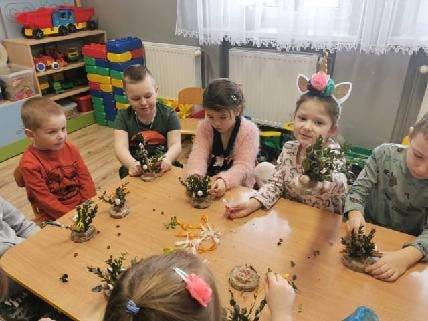 Warsztaty florystyczne bardzo zaangażowały dzieci do działań. Podczas tworzenia bukiecików przedszkolaki rozwijały zmysł wzroku, doskonaliły motorykę rąk oraz precyzję i dokładność.