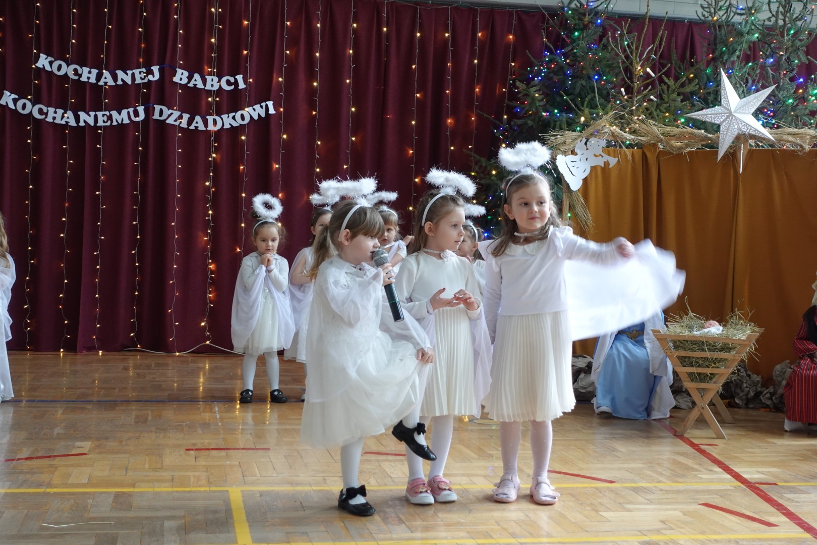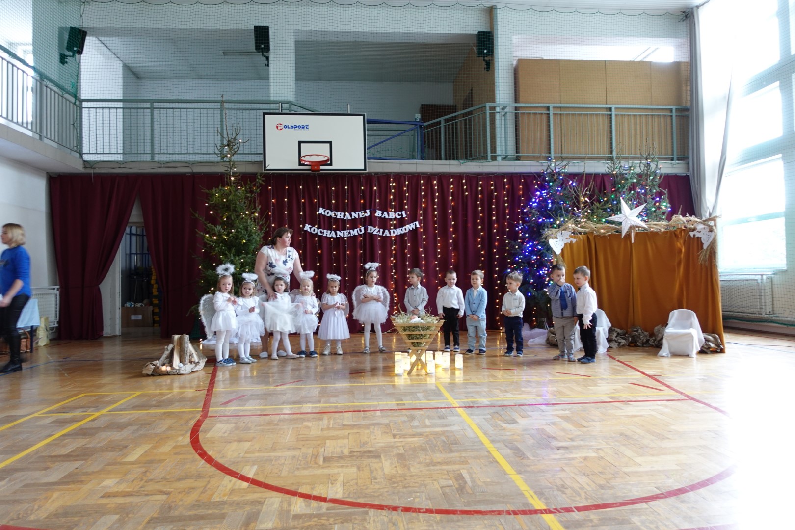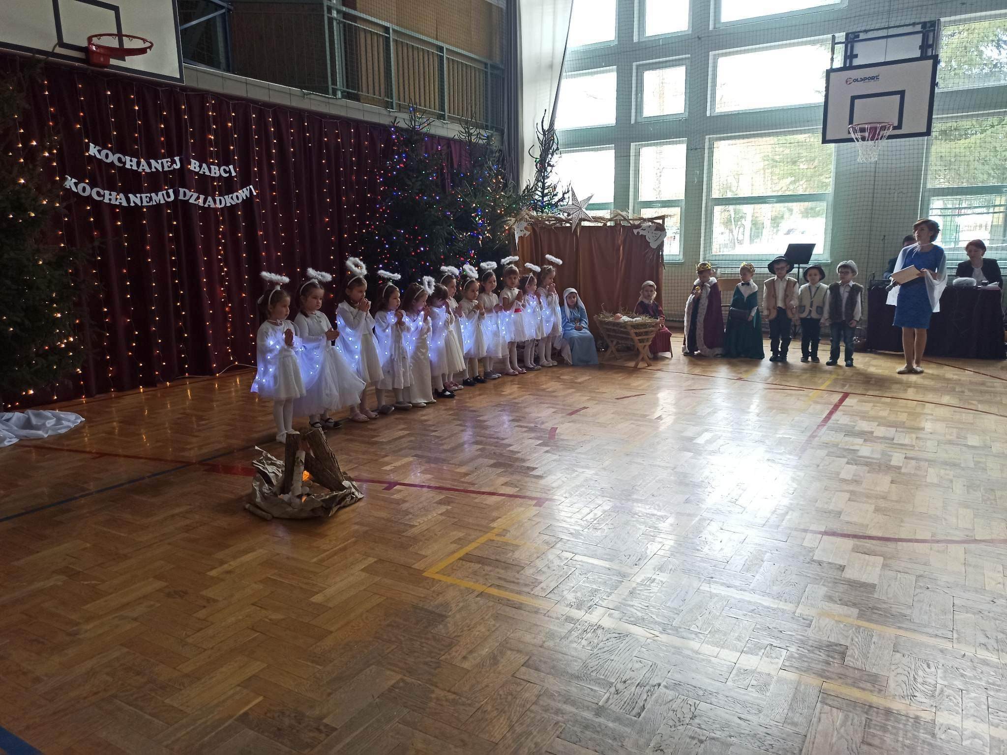 Takimi słowami rozpoczęło się przedstawienie jasełkowe, które z okazji "Dnia Babci i Dziadka" przygotowały przedszkolaki z grup Śmieszki i Wesołki .Przedstawienie odbyło się 30.01.2023r. na sali gimnastycznej w szkole podstawowej. Mali artyści z wielkim przejęciem i zaangażowaniem odgrywali swoje role: Józefa, Maryi, aniołków, królów, pasterzy i krakowiaków. Śpiewane przez dzieci kolędy i recytowane role przeniosły nas w czas Świąt Bożego Narodzenia, napełniły radością, ale też odrobiną zadumy. Babcie i dziadkowie byli bardzo dumni ze swoich wnucząt i nagrodzili ich występ dużymi brawami. Na koniec występu przedszkolaki złożyły życzenia swoim dziadkom i wręczyły własnoręcznie wykonane upominki. Rodzice przygotowali dla wszystkich pyszny poczęstunek. Było ciasto, ciasteczka, kawa i herbata.