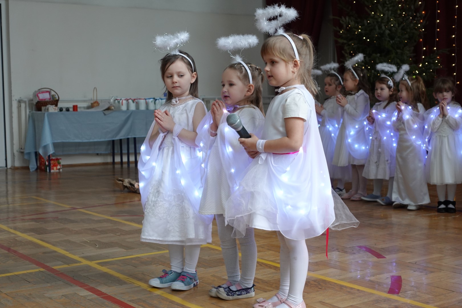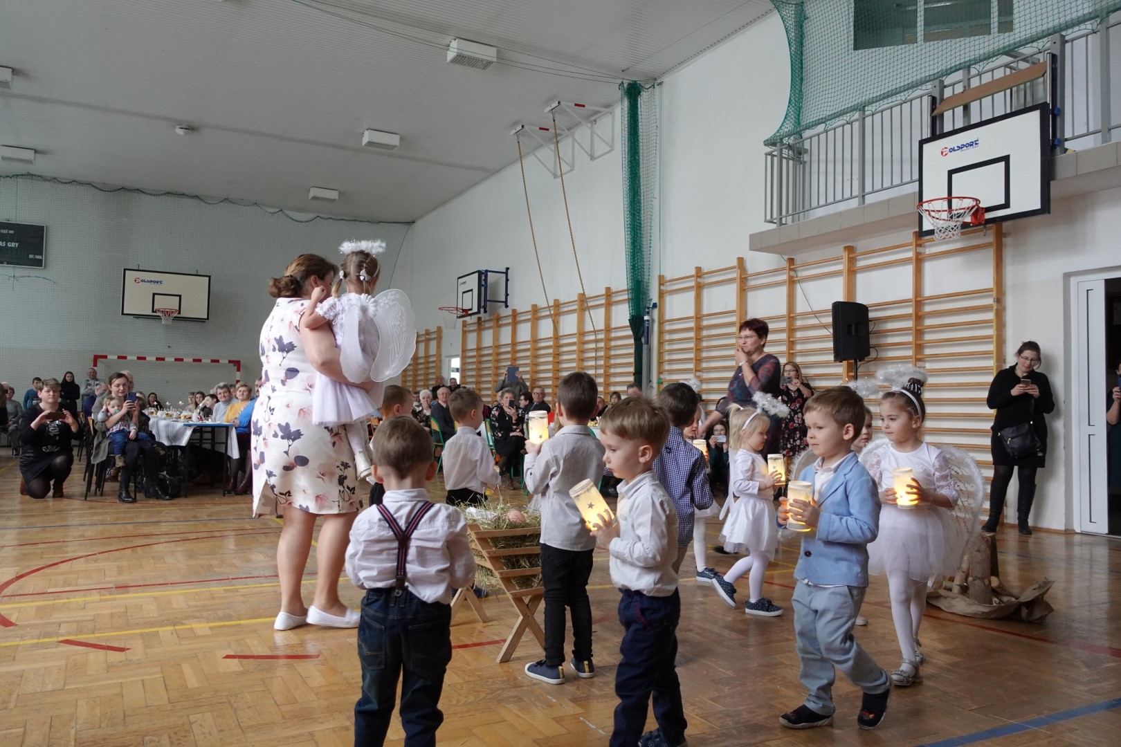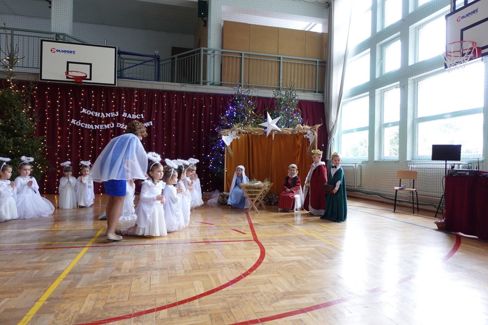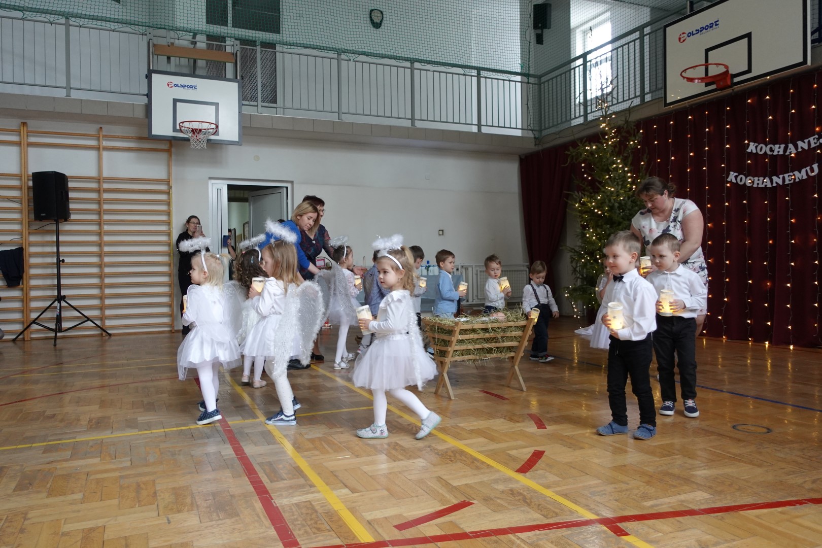 Takimi słowami rozpoczęło się przedstawienie jasełkowe, które z okazji "Dnia Babci i Dziadka" przygotowały przedszkolaki z grup Śmieszki i Wesołki .Przedstawienie odbyło się 30.01.2023r. na sali gimnastycznej w szkole podstawowej. Mali artyści z wielkim przejęciem i zaangażowaniem odgrywali swoje role: Józefa, Maryi, aniołków, królów, pasterzy i krakowiaków. Śpiewane przez dzieci kolędy i recytowane role przeniosły nas w czas Świąt Bożego Narodzenia, napełniły radością, ale też odrobiną zadumy. Babcie i dziadkowie byli bardzo dumni ze swoich wnucząt i nagrodzili ich występ dużymi brawami. Na koniec występu przedszkolaki złożyły życzenia swoim dziadkom i wręczyły własnoręcznie wykonane upominki. Rodzice przygotowali dla wszystkich pyszny poczęstunek. Było ciasto, ciasteczka, kawa i herbata.