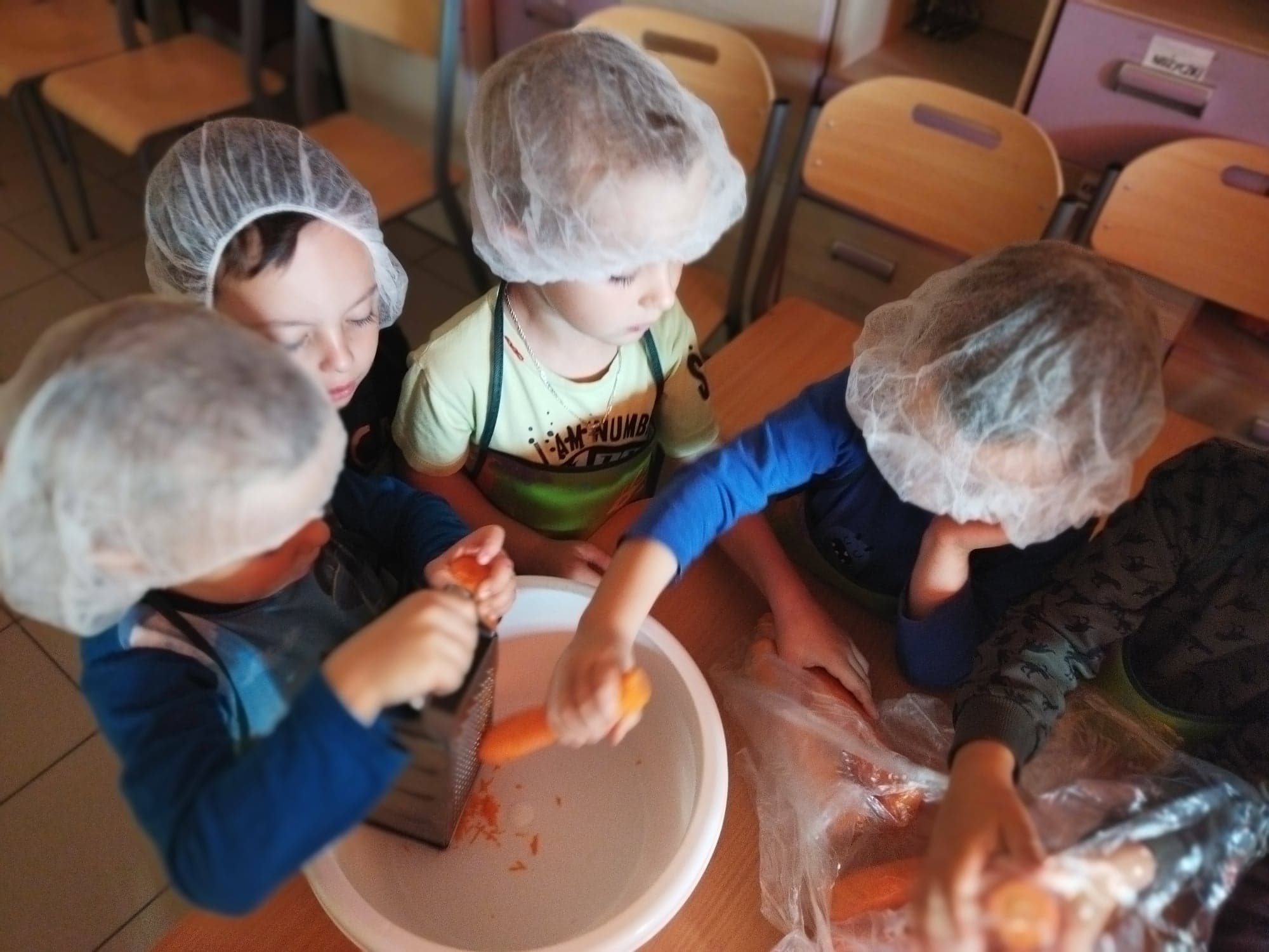 Dnia 24 października dzieci z grupy Wesołki razem ze swoją wychowawczynią panią Krysią upiekły pyszne i zdrowe ciasto marchewkowe. Jak się okazało, pieczenie ciasta, to nie taka trudna sprawa. Szczególnie, gdy do pomocy jest tyle małych i zdolnych rąk. Tak urozmaicone zajęcia zawsze przynoszą wiele radości, a własnoręcznie upieczone ciasto zjadły nawet największe niejadki.
