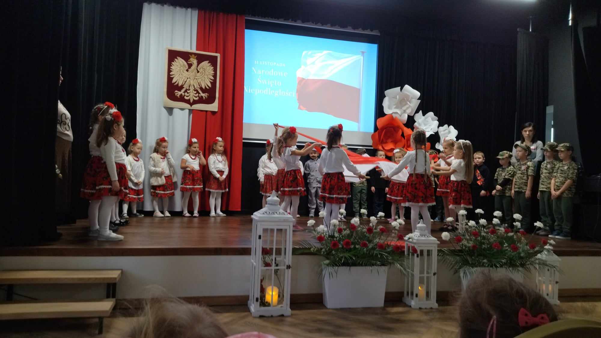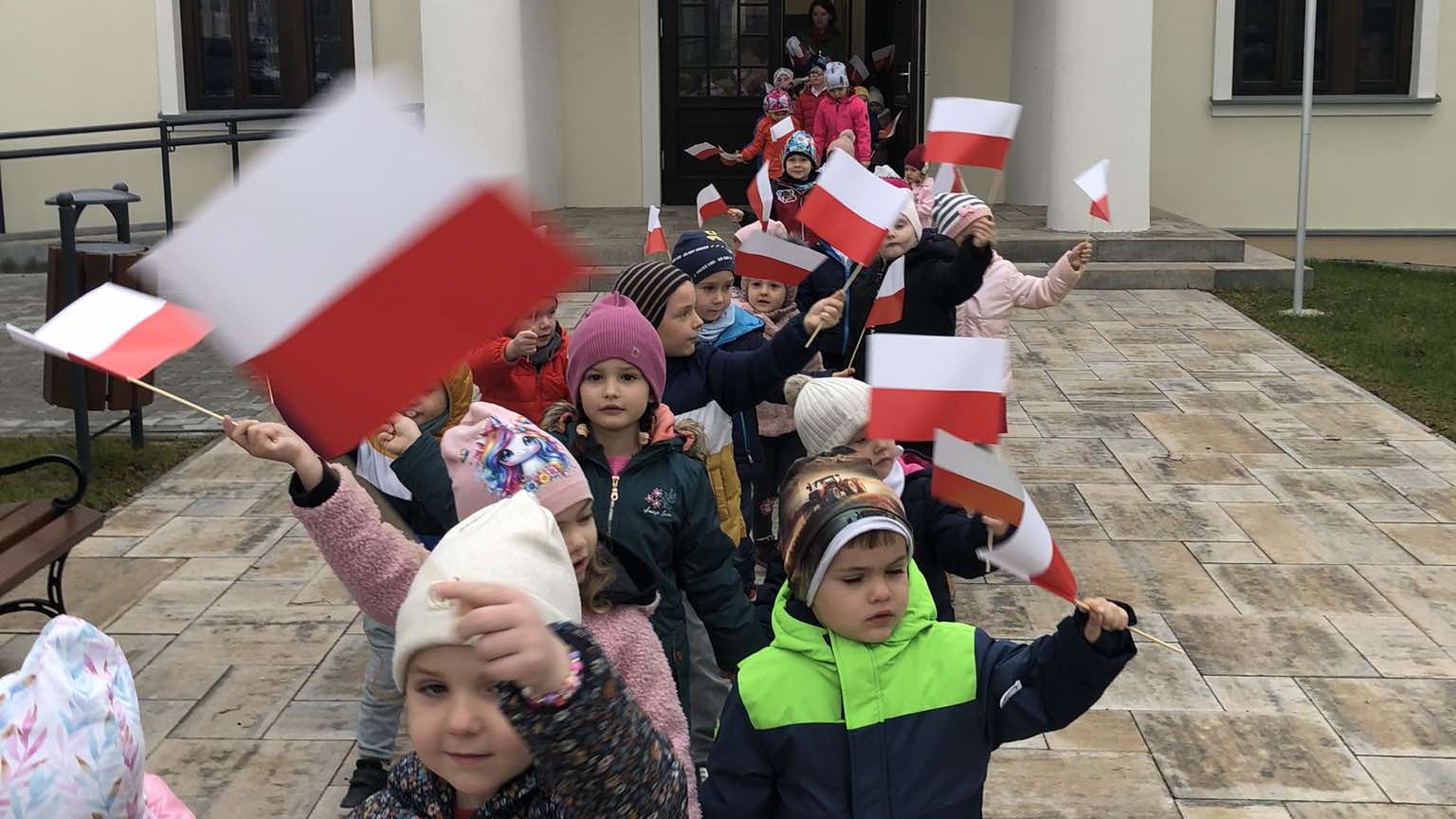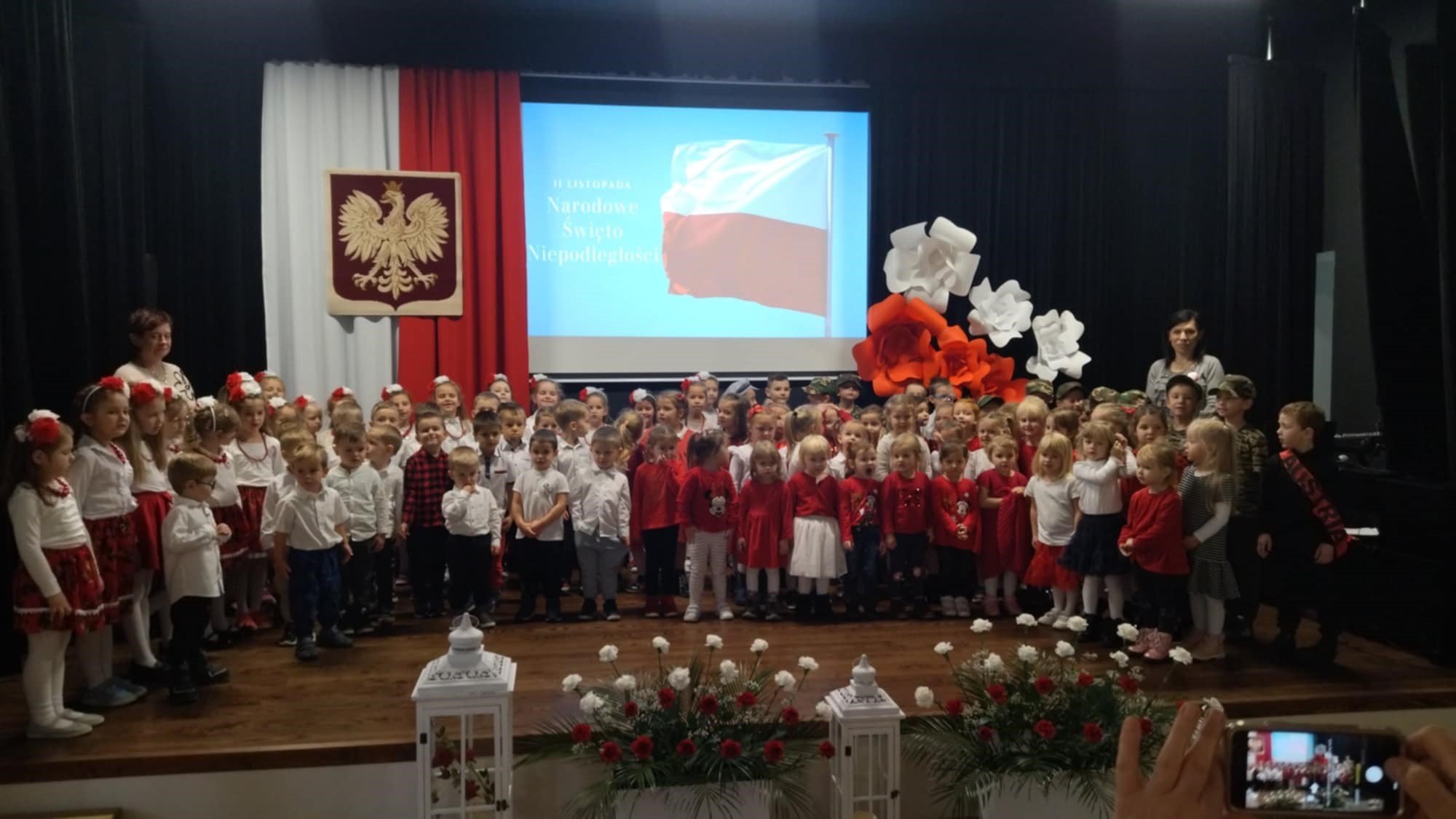 Dnia 8 listopada w naszym przedszkolu świętowaliśmy Narodowe Święto Niepodległości. To wyjątkowy czas dla każdej Polki i Polaka. Z tej okazji dzieci z wszystkich grup oraz pracownicy przedszkola zebrali się w sali widowiskowej Domu Młodzieży im. abpa. L. Wałęgi, aby uroczyście świętować ten wyjątkowy dla Polaków czas. Wszyscy z powagą i w dużym skupieniu oglądali program artystyczny przygotowany przez dzieci ze starszych grup przedszkolnych. W ramach akcji „Szkoła do hymnu” wspólnie odśpiewaliśmy Mazurka Dąbrowskiego i powróciliśmy do przedszkola trzymając biało-czerwone flagi. Dzieci z młodszych grup przedszkolnych w ramach projektu „Postaw na Wartości” przedstawiły flagę naszego kraju w kreatywny sposób, a mianowicie układając swoje ciała w kolor biało-czerwony.