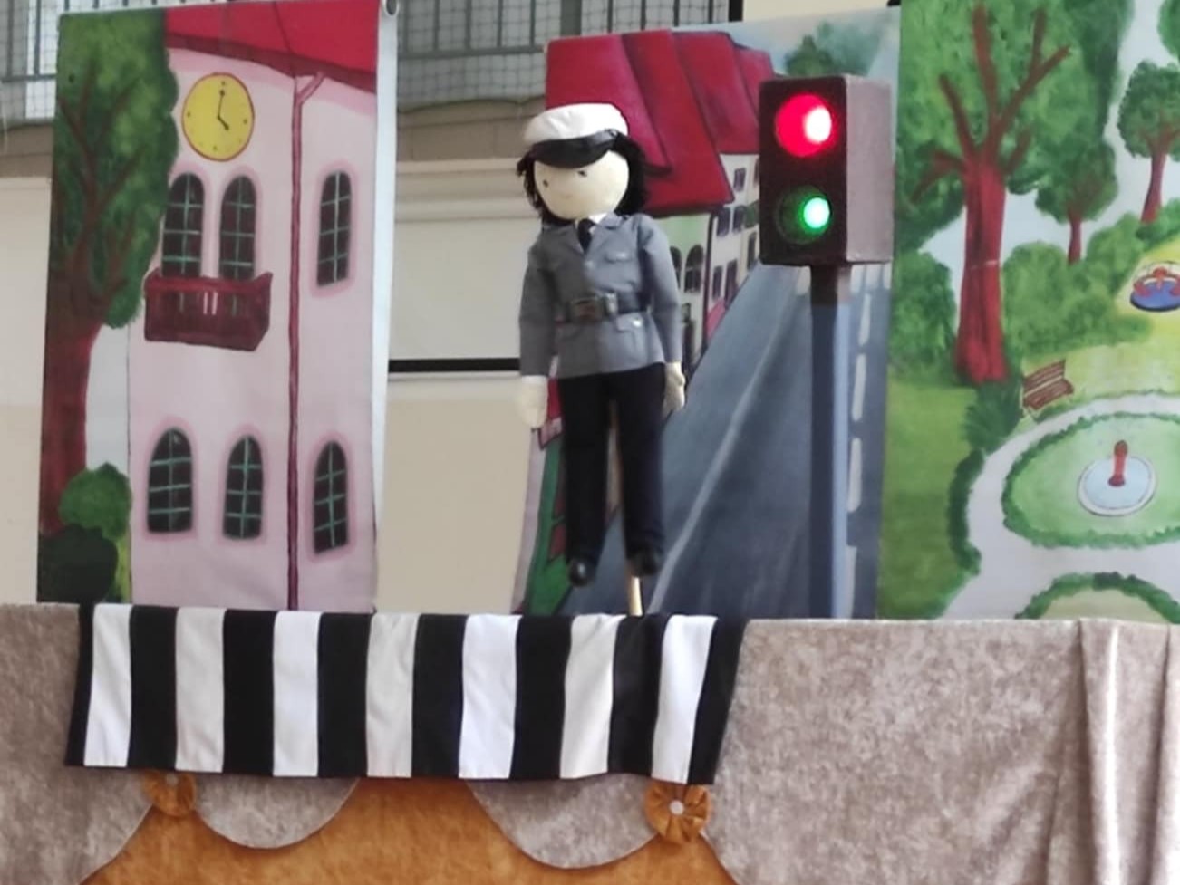Spektakl kukiełkowy w wykonaniu aktorów teatru " Bajka" oglądały wszystkie dzieci z naszego przedszkola. W odsłonie trzech krótkich bajeczek: "Wilk i koźlątka", "Czerwony Kapturek" oraz "Na ruchliwej ulicy" dzieci otrzymały dużą dawkę cennych rad. Celem spektaklu było ukazanie jak unikać zagrożeń na ulicy, czyli dlaczego należy przestrzegać zasad ruchu drogowego oraz gdzie szukać pomocy, jeśli brak obok rodziców lub opiekunów. Ukazał również, aby nie ufać obcym, nie nawiązywać z nimi znajomości, nie przyjmować od nich prezentów.