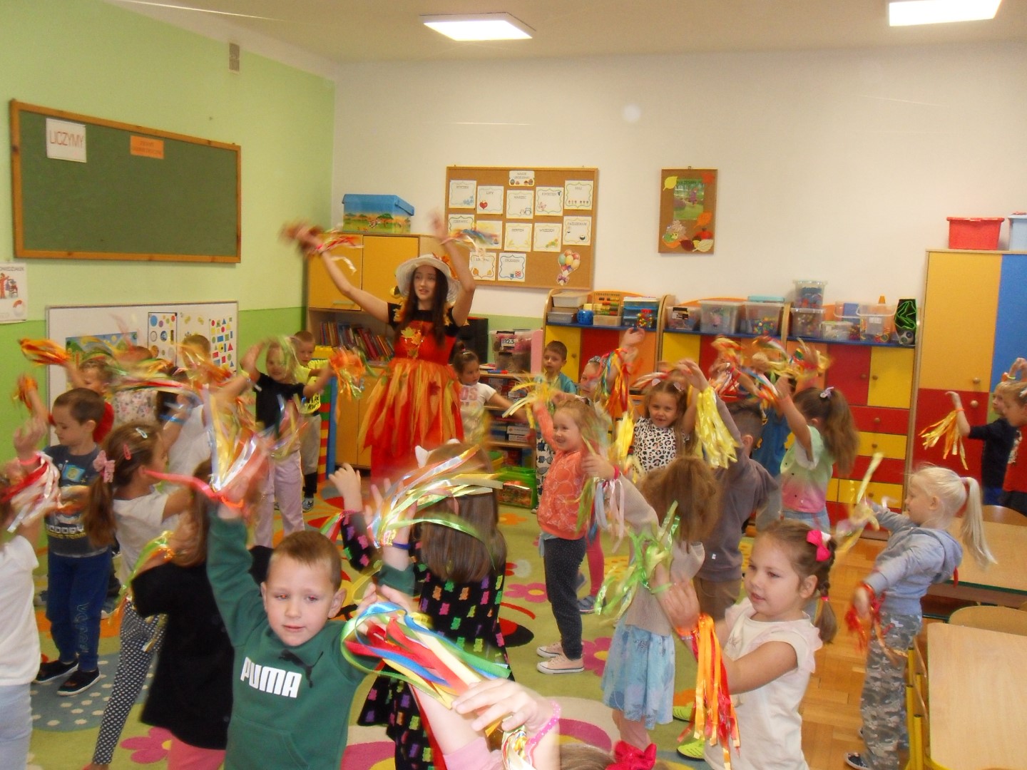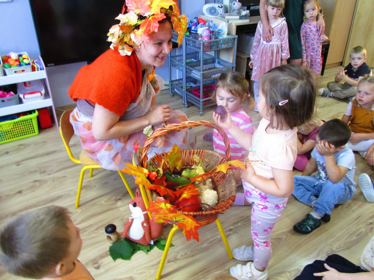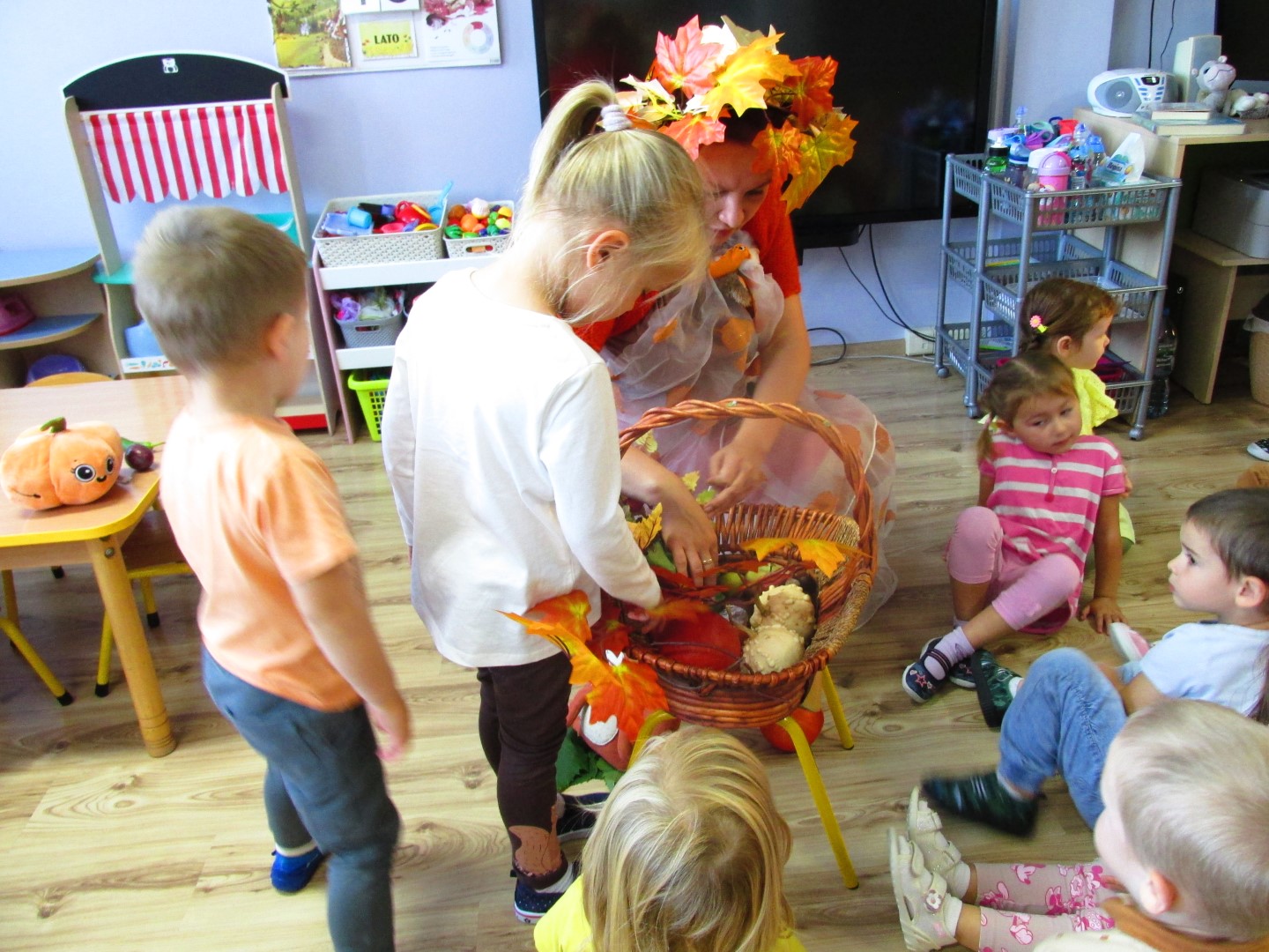 Wrzesień to czas uroczystego powitania nowej pory roku - jesieni. Przedszkolaki skrupulatnie przygotowały się do tej uroczystości- obserwowały pogodę za oknem, zmiany zachodzące w przyrodzie, zbierały kasztany, oglądały zdjęcia jesiennych krajobrazów, owoców jesieni. W końcu do nas przyszła – piękna, w kolorowej sukni, kapeluszu na głowie i koszyku w ręce. Grupa Jagódki widziała Panią Jesień podczas wyjścia do lasu, przemykającą pomiędzy drzewami, natomiast pozostałe grupy miały okazję zobaczyć ją w przedszkolu, zatańczyć z nią jesienny taniec i poznając dary jesieni jakie miała w swoim koszu.