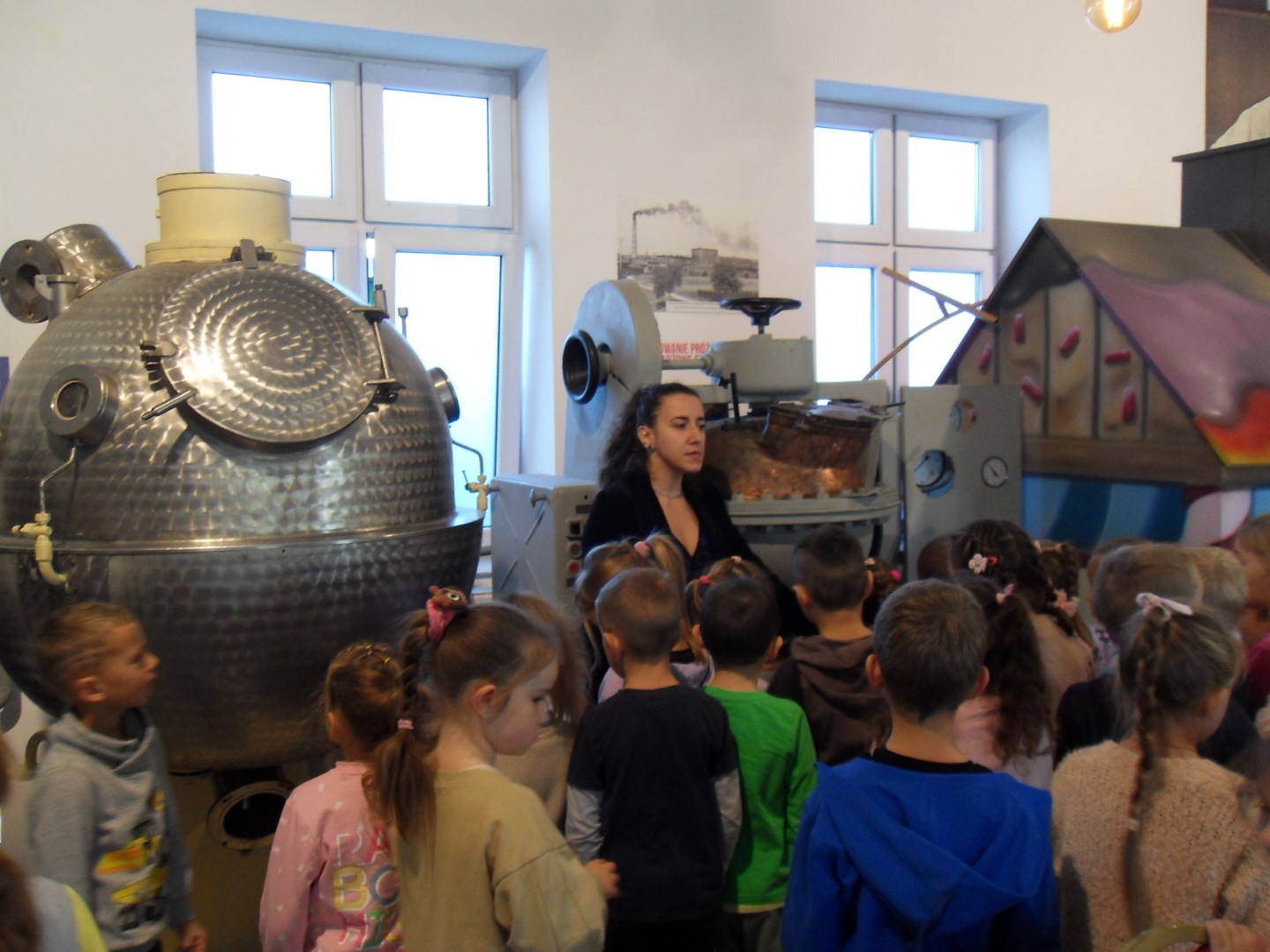 18 października 2024 roku dzieci z grup: Skrzaty i Wesołki wybrały się na wycieczkę do Muzeum Lizaka w Jaśle. Zwiedzanie muzeum zaczęliśmy od sklepiku ze słodkościami, gdzie dzieci mogły oglądać różne kolorowe lizaki. Pani przewodnik w ciekawy sposób opowiedziała o początkach powstawania lizaków oraz jak wyglądała ich produkcja na przestrzeni lat. Zapoznaliśmy się z zawodem cukiernika i karmelarza. Poznaliśmy również proces tworzenia karmelu, barwienia, łączenia w różne kolory. Największą atrakcją dla wszystkich przedszkolaków była możliwość własnoręcznego zrobienia lizaka z przygotowanej masy. W muzeum mogliśmy również posmakować cukrów, z których produkuje się lizaki i powąchać aromatów dodawanych do karmelu, aby nadać mu różne smaki. Potem udaliśmy się na warsztaty robienia pizzy, gdzie bliżej poznaliśmy zawód kucharza. Po wysłuchaniu krótkiej historii o włoskiej pizzy i po dokładnym umyciu rąk każdy otrzymał porcję swojego ciasta i po rozwałkowaniu mógł przyozdobić swoje ciasto sosem pomidorowym, szynką, salami, kukurydzą i serem według własnych pomysłów i smaków. Następnie wszystkie pizze zostały upieczone, a na koniec każdy z apetytem zjadł swoją. Dzieci pełne wrażeń i z uśmiechem na twarzy wróciły do przedszkola.