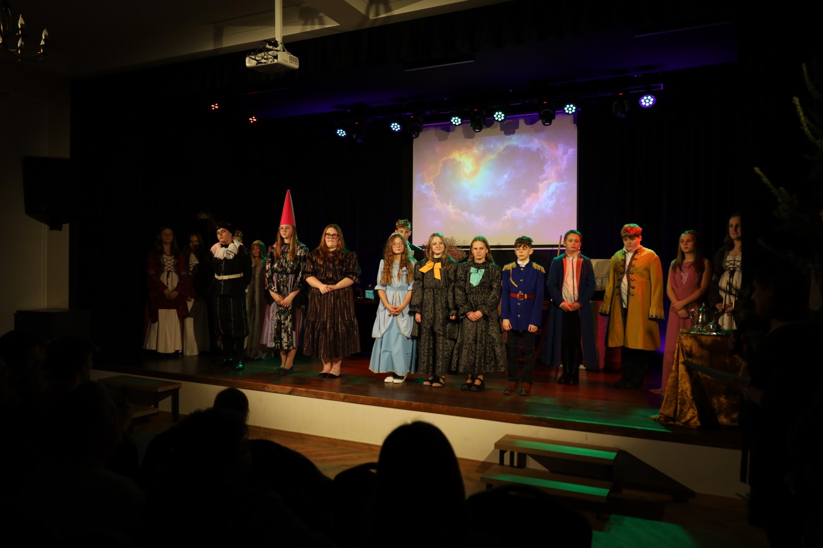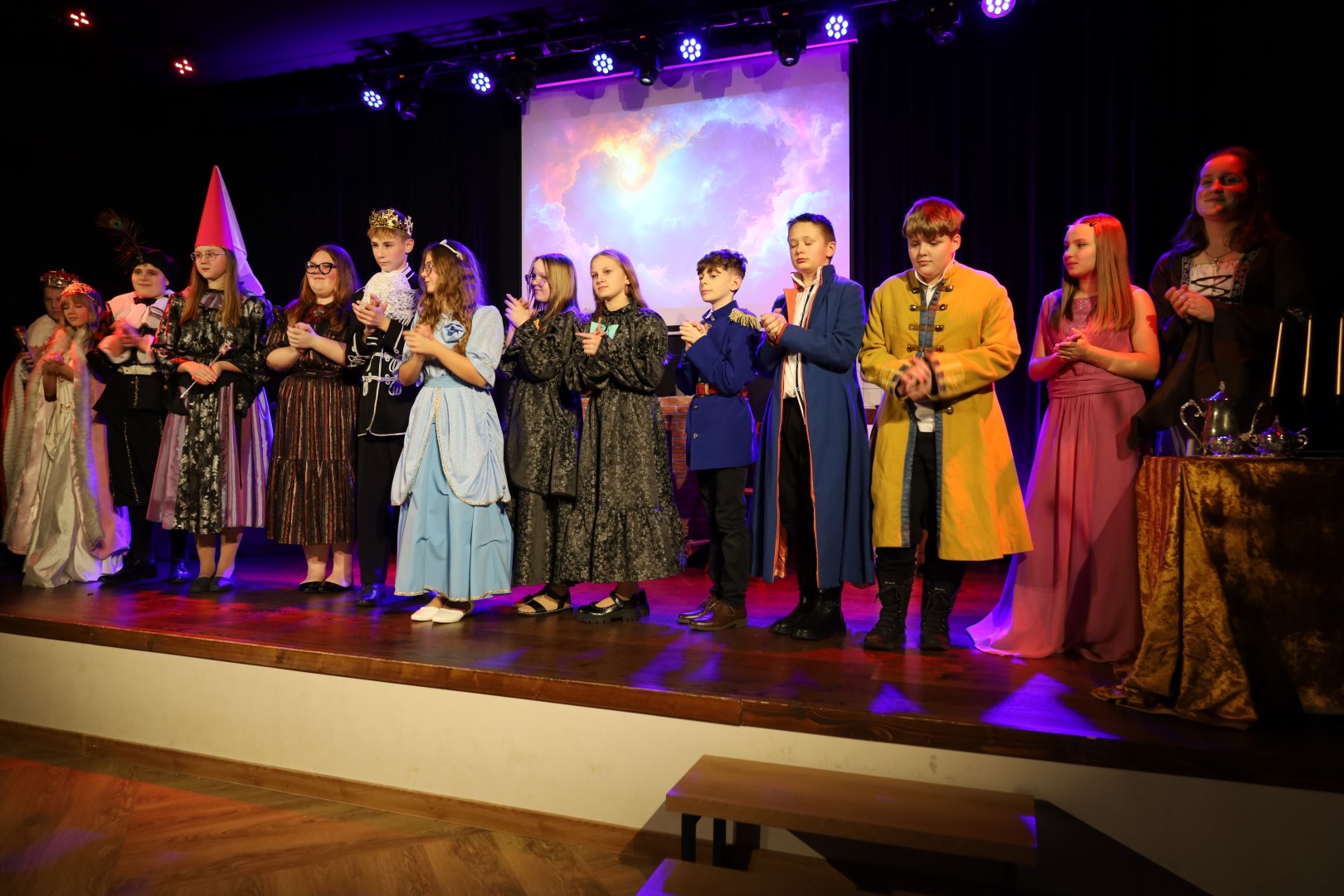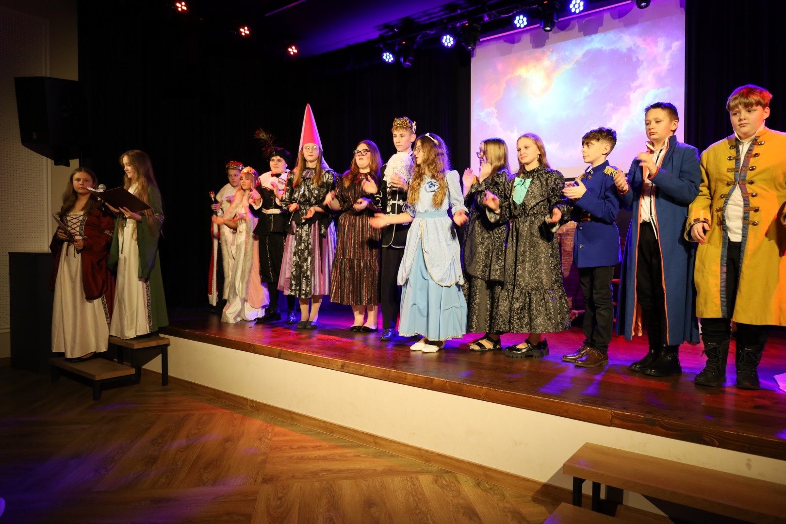 Dzięki uprzejmości p. Dyrektor OKiB w Moszczenicy spektakl mógł zostać zaprezentowany w Domu Młodzieży na scenie z kurtyną. Światła i inne efekty specjalne pozwoliły na to, by przedstawienie było jeszcze bardziej widowiskowe. Uczniowie (uczestnicy zajęć teatralnych) mogli poczuć się jak prawdziwi aktorzy.