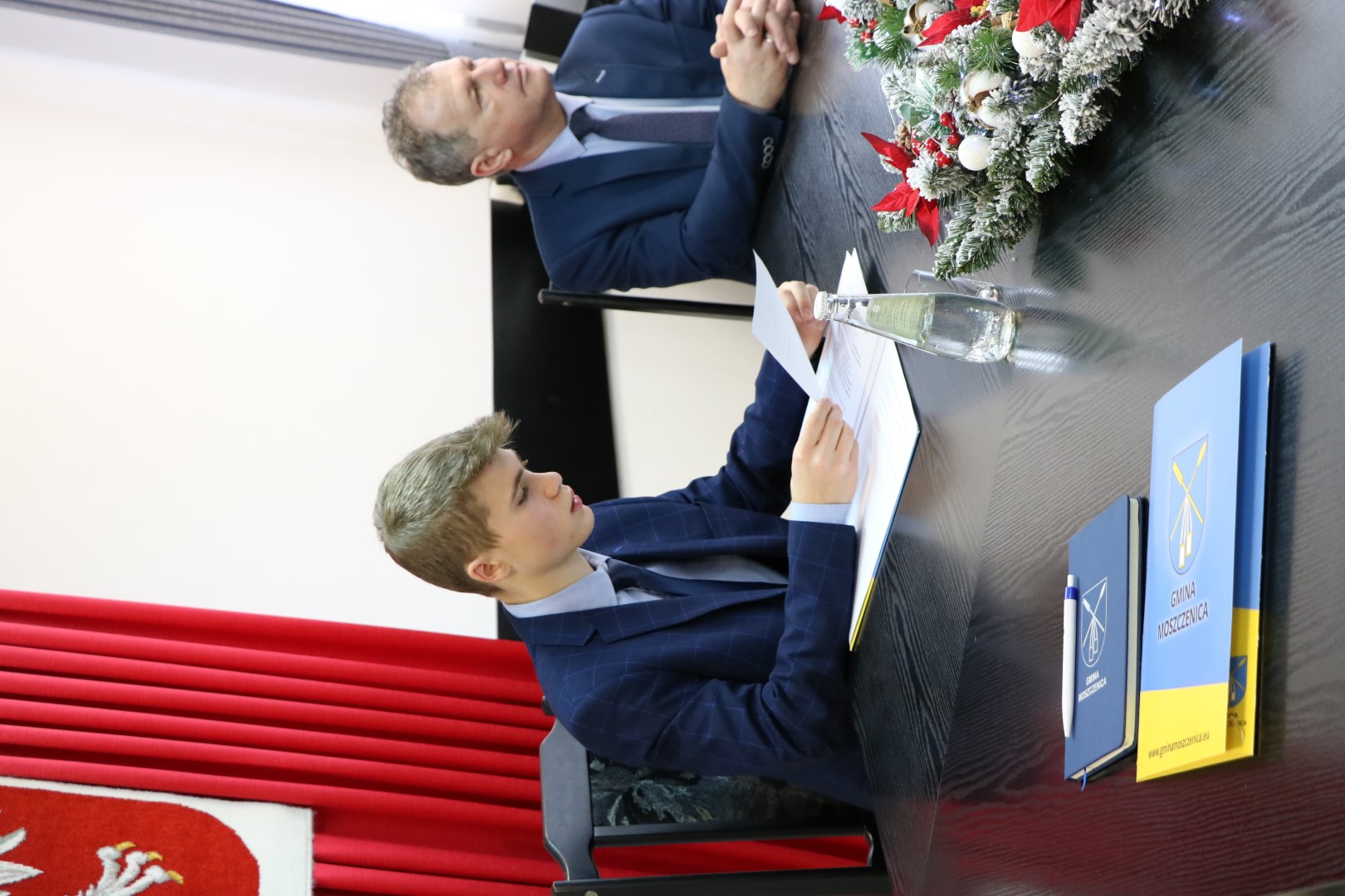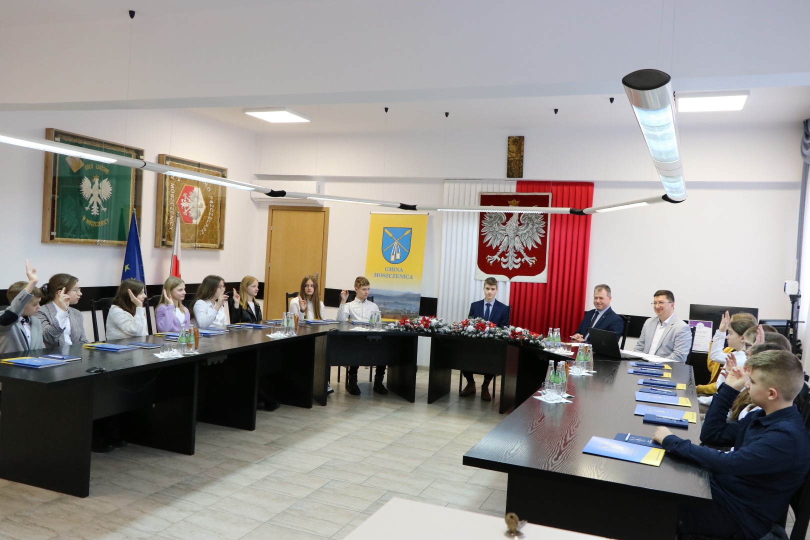 Podczas sesji radni odebrali zaświadczenia z rąk Wójta Gminy Moszczenica i Przewodniczącej Rady Gminy. Następnie złożyli ślubowanie. Pan Wójt Jerzy Wałęga w swoim wystąpieniu przypomniał zebranym historię powstania Młodzieżowej Rady Gminy Moszczenica oraz funkcje i zadania jakie pełni w społeczności lokalnej.