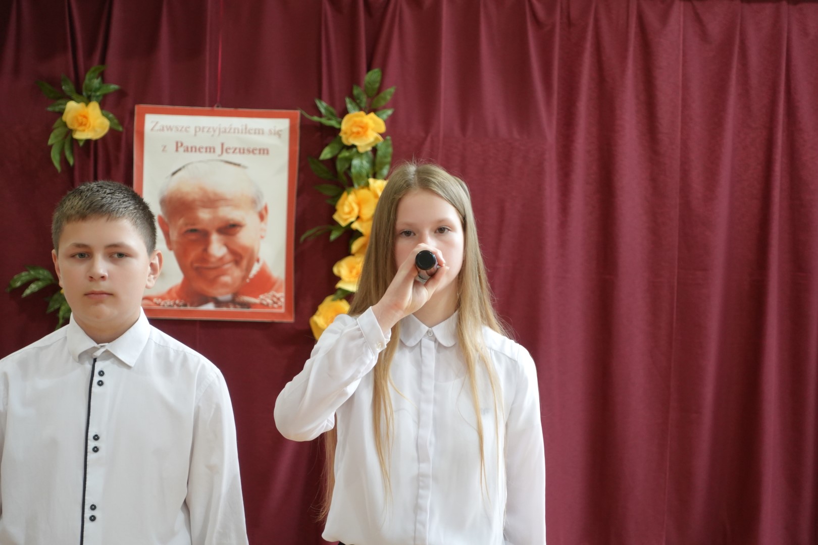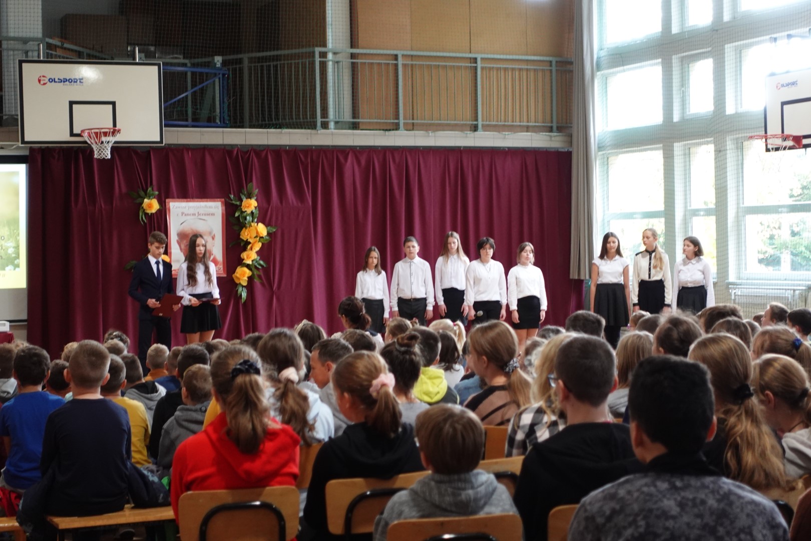 Dnia 19 października odbyła się w naszej szkole uroczysta akademia z okazji Dnia Papieskiego. Mottem uroczystości stały się słowa ,,Ocalić od zapomnienia’’. Uroczystość przygotowali uczniowie klas VIII pod opieką p. Anny Potok oraz p. Jadwigi Gryga. Uroczystość uświetniły piosenki śpiewane przez szkolny chór pod kierunkiem p. Mirosława Potoka.