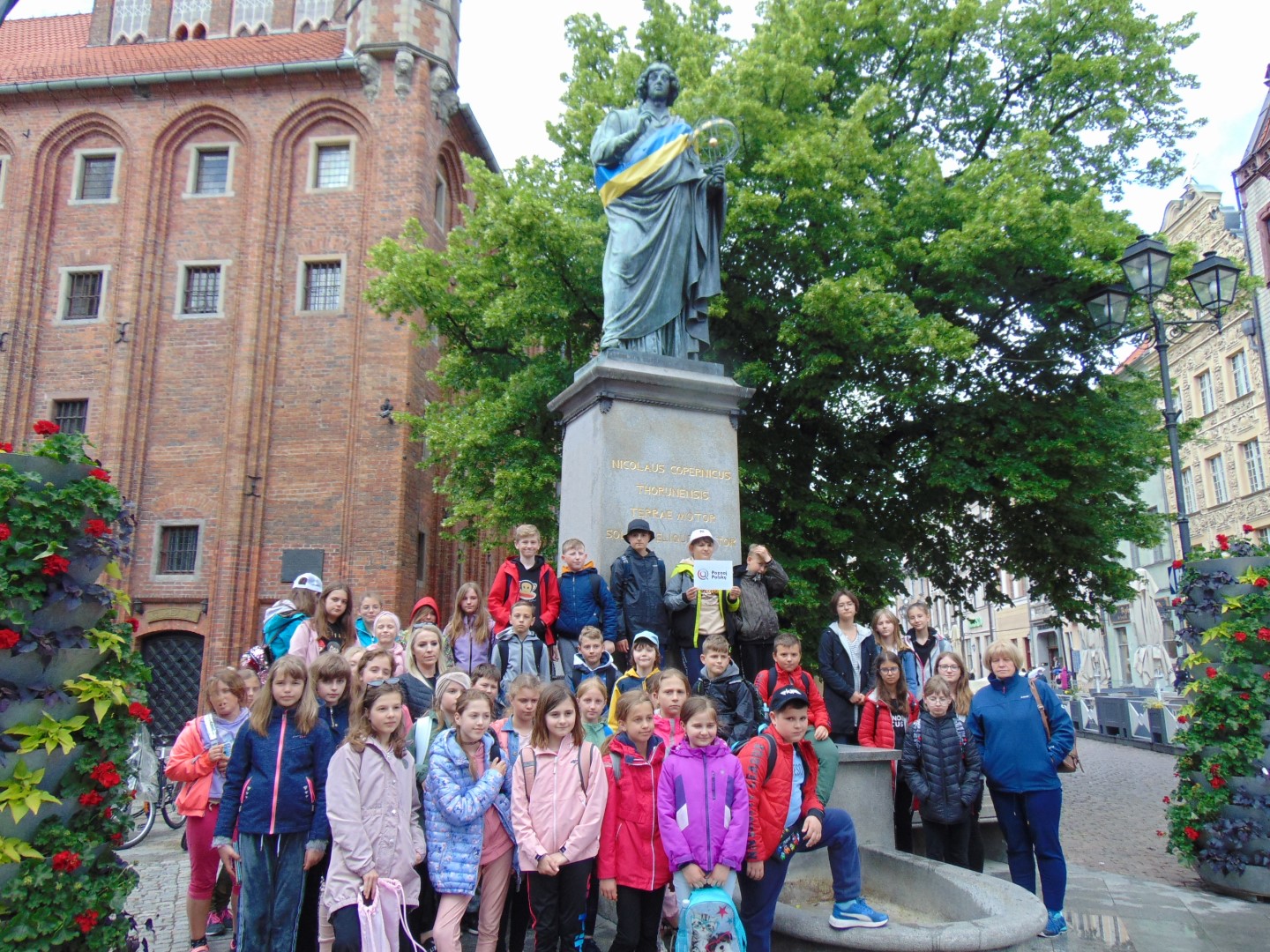 W sobotę 28 maja musieliśmy pożegnać się z morzem i rozpoczęliśmy podróż do domu. Kilka godzin poświęciliśmy na zwiedzanie pięknego Torunia. Na początek podziwialiśmy Kolorowy Kosmos – widowisko w toruńskim Planetarium. Później pani przewodnik poprowadziła nas po najciekawszych miejscach w Toruniu. Nawet deszcz i zimno nie powstrzymało nas przez zobaczeniem toruńskiego Rynku z Ratuszem i fontanny flisaka z pomnikiem Mikołaja Kopernika. Pod Krzywą Wieżą sprawdzaliśmy swoje sumienia, byliśmy obok domu Kopernika. Zobaczyliśmy toruńskie kościoły i słynnego osiołka. Wysłuchaliśmy też kilku legend. Ale prawdziwa zabawa była w Domu Legend. Tam nie tylko ich wysłuchiwaliśmy, ale czynnie w nich braliśmy udział. Po obiedzie i zakupie toruńskich pierników wyruszyliśmy w długą drogę do domu. Ośmiodniowy wyjazd nie byłby możliwy bez dofinansowania z projektu Poznaj Polskę oraz dofinansowania w kwocie 5 tys. zł. z Gminy Moszczenica. Dziękujemy za wsparcie, które pozwoliło nam na wspaniały wypoczynek i zwiedzenie tak wielu pięknych miejsc w odległej dla nas części naszego pięknego kraju.
