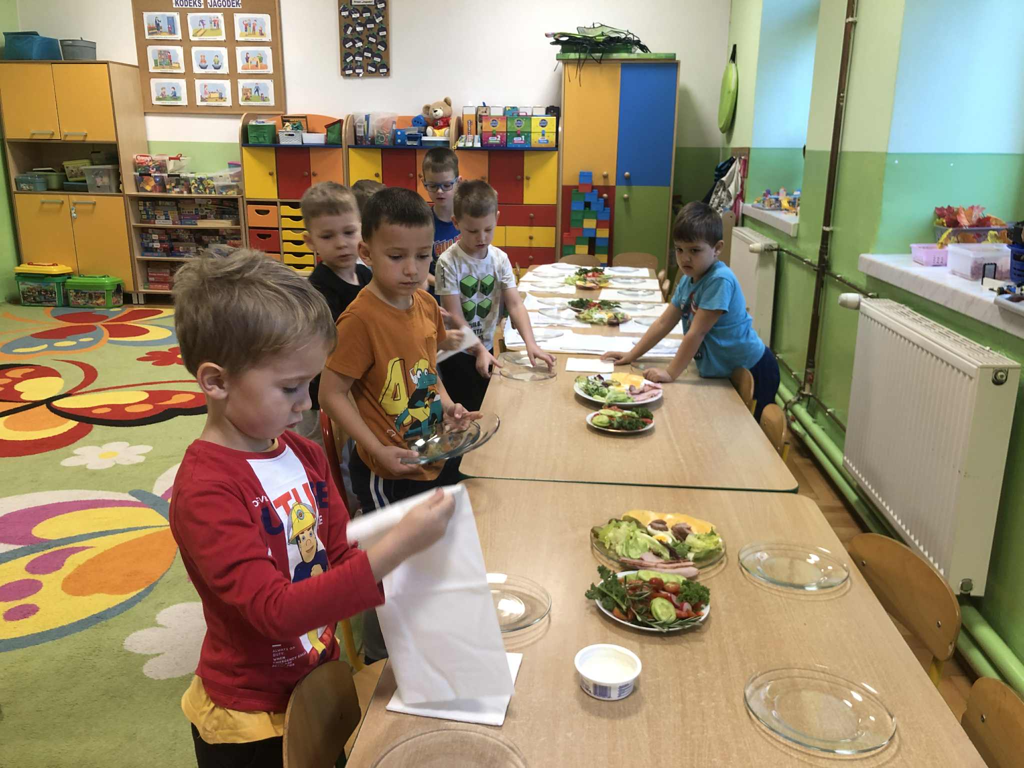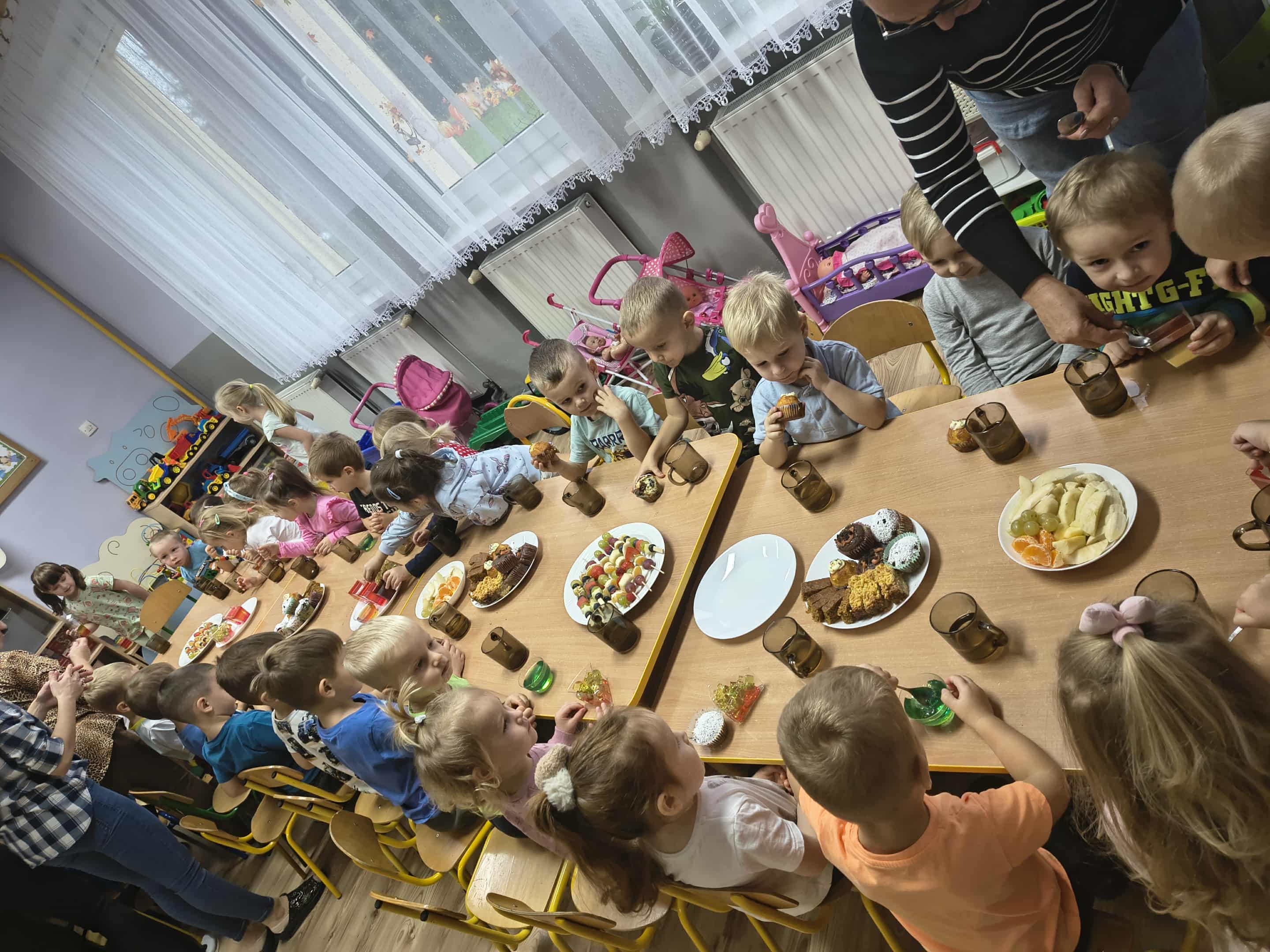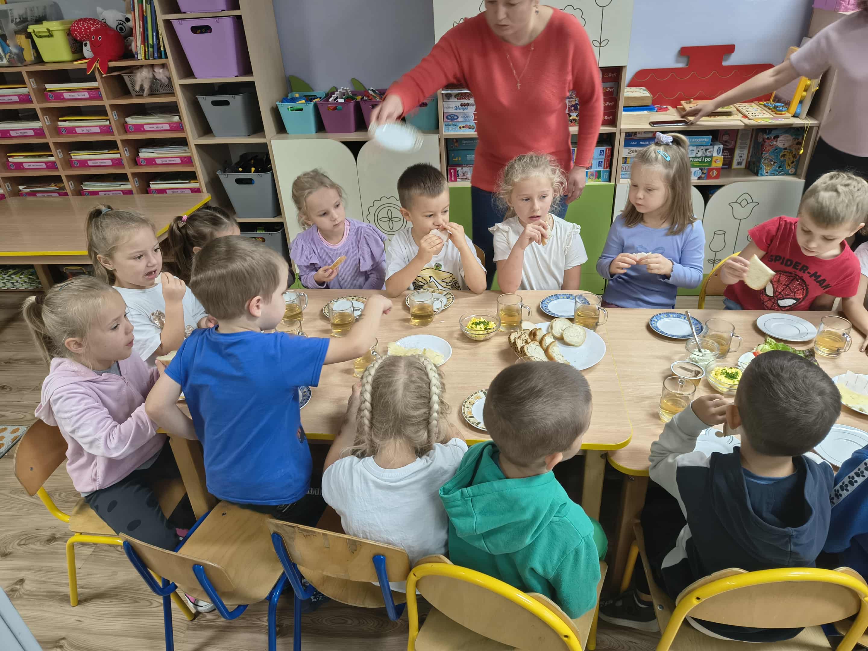 Tak jak w latach ubiegłych, przedszkolaki przyłączyły się do ogólnopolskiej akcji „Śniadanie daje moc”. Dzień rozpoczął się od przypomnienia zasad zdrowego odżywiania, uświadomienia jak ważne jest dla naszego organizmu śniadanie. Dzieci przyniosły potrzebne produkty, z których wykonały zdrowe, smaczne kanapki. Wszyscy z wielkim zaangażowaniem uczestniczyli w przygotowywaniu własnego śniadanka. Wspólny posiłek był dla nas świetną zabawą, a zarazem nauką o tym - jak ważne jest codzienne, zdrowe śniadanie.