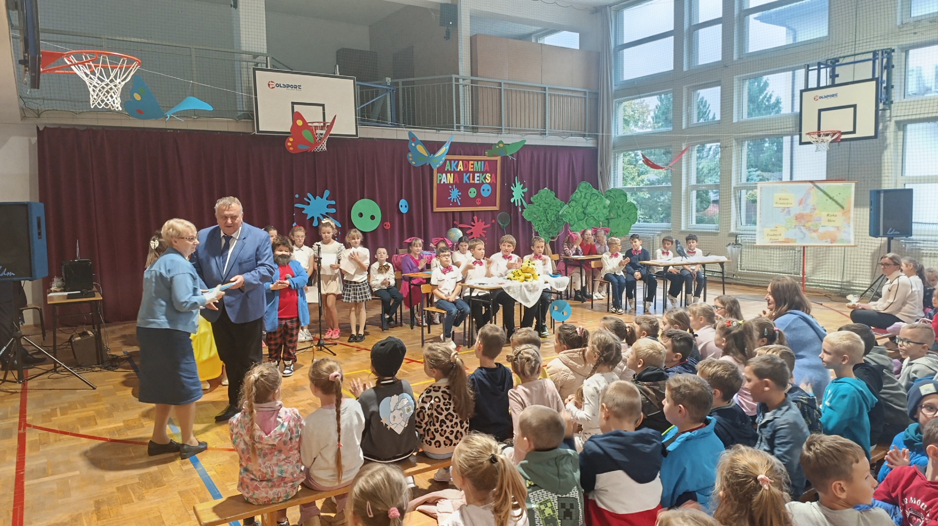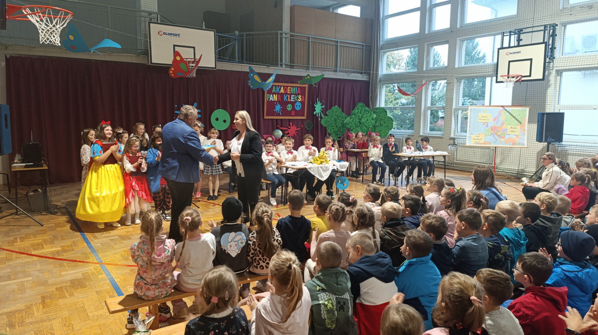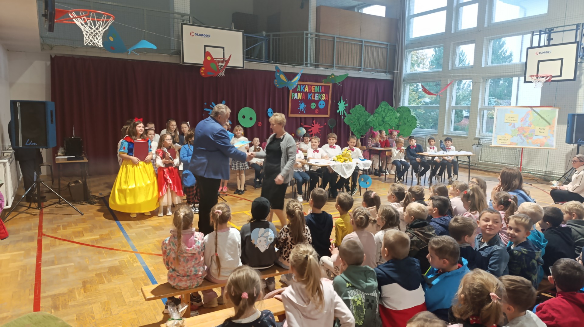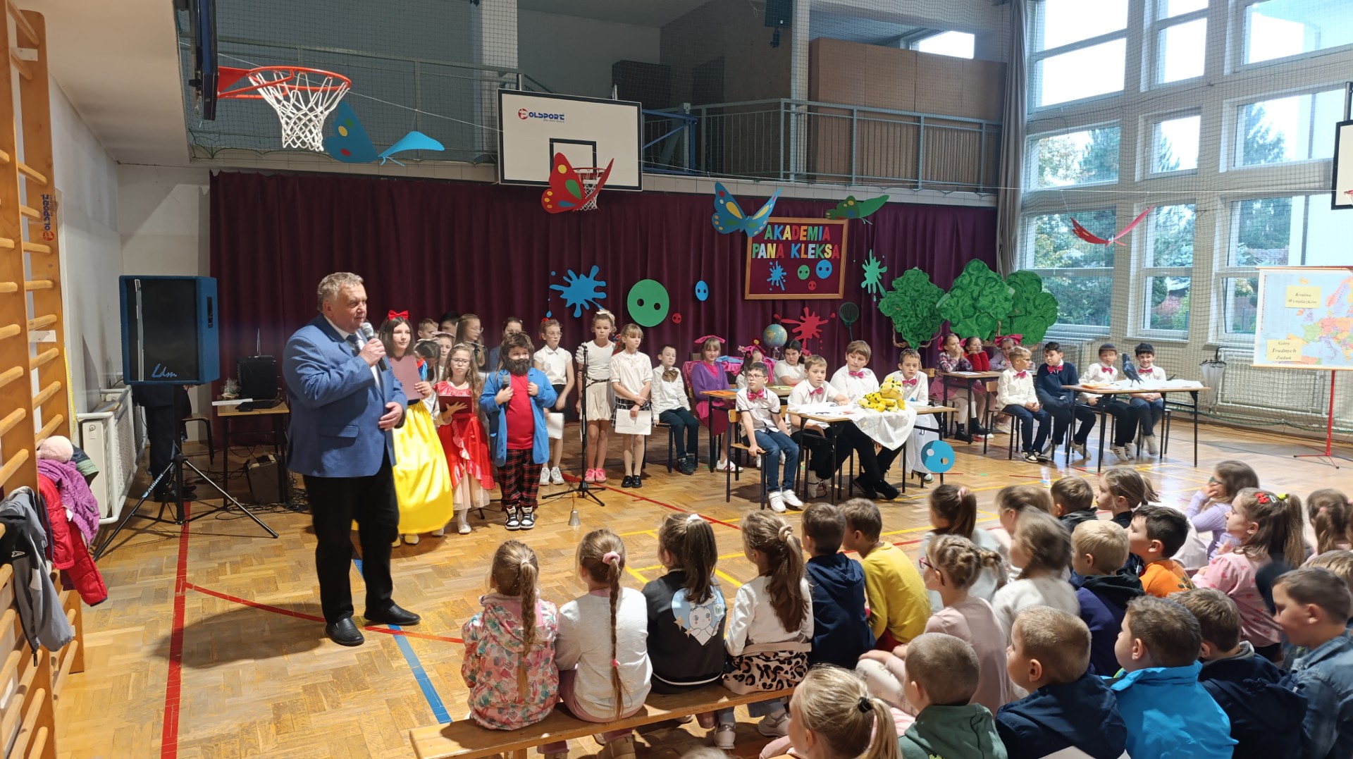 10 października spotykaliśmy się w sali gimnastycznej, by wspólnie świętować Dzień Edukacji Narodowej. Uczniowie klasy 4a i 4b pomogli nam przenieść się w świat niezwykłej szkoły, znanej z kart lektury Jana Brzechwy – „Akademia pana Kleksa”.