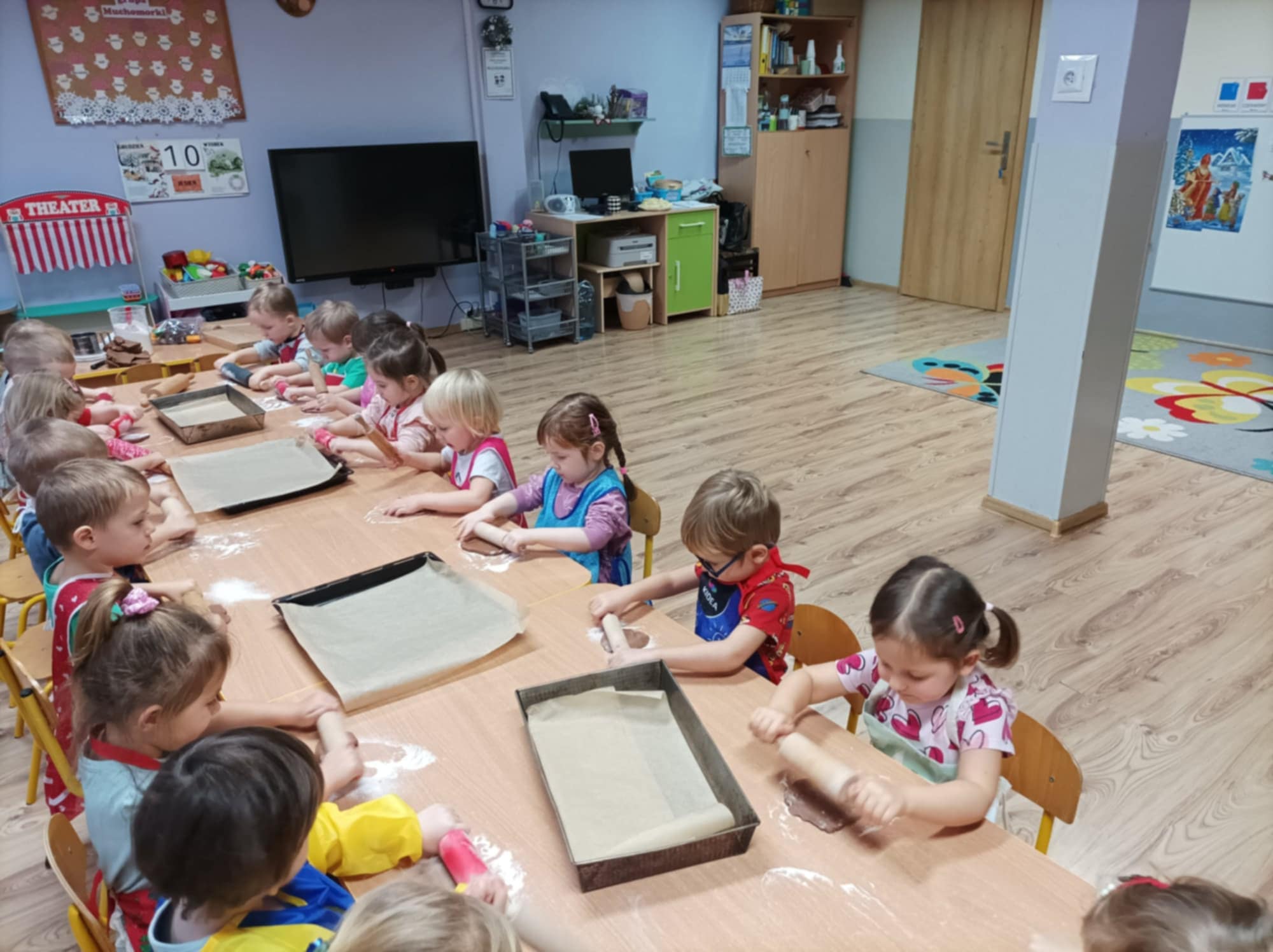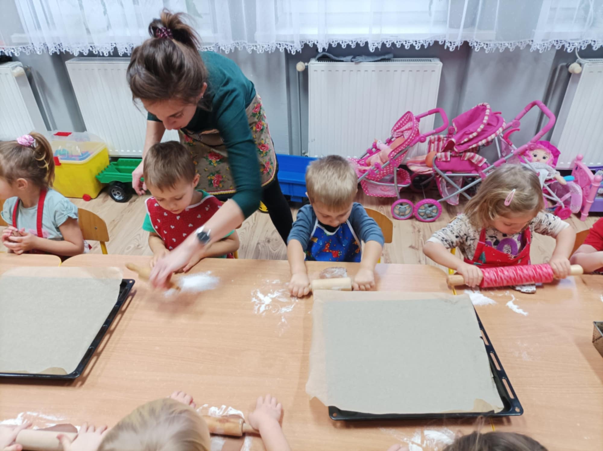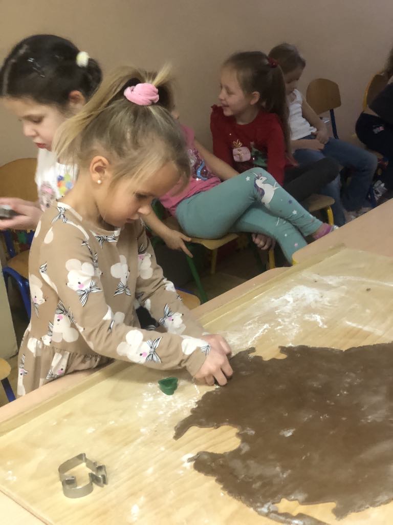 Zgodnie z przedświąteczną tradycją przedszkolaki upiekły pyszne świąteczne pierniczki. Z pomocą pań praca z przygotowaniem wypieków szła sprawnie i bez trudu. Dzieci wałkowały ciasto i wykrawały świąteczne kształty – choinki, gwiazdki, bałwanki, bombki, aniołki. Następnie słodkie ciasteczka piekły się w przedszkolnej kuchni. Po przedszkolu zaczął unosić się wspaniały zapach pieczonych pierniczków, który wprawił wszystkich w świąteczny nastrój.