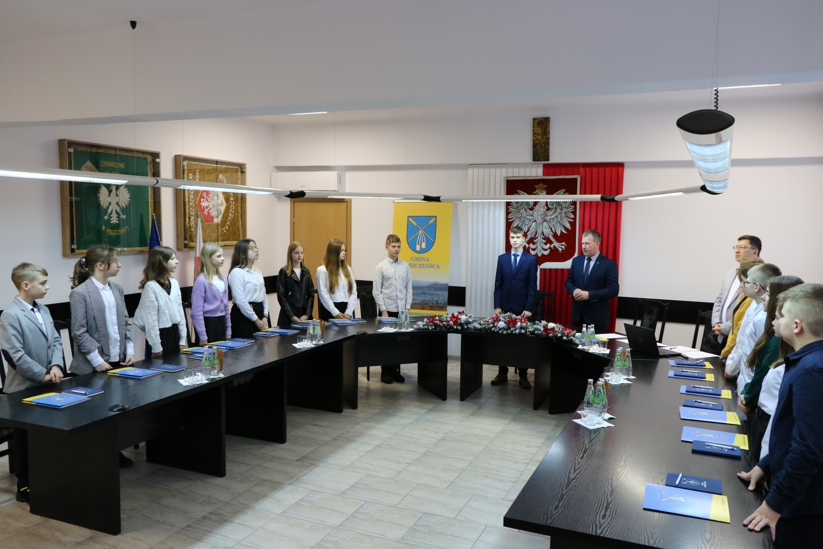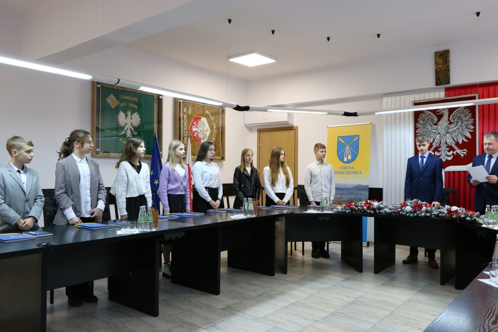 Podczas sesji radni odebrali zaświadczenia z rąk Wójta Gminy Moszczenica i Przewodniczącej Rady Gminy. Następnie złożyli ślubowanie. Pan Wójt Jerzy Wałęga w swoim wystąpieniu przypomniał zebranym historię powstania Młodzieżowej Rady Gminy Moszczenica oraz funkcje i zadania jakie pełni w społeczności lokalnej.