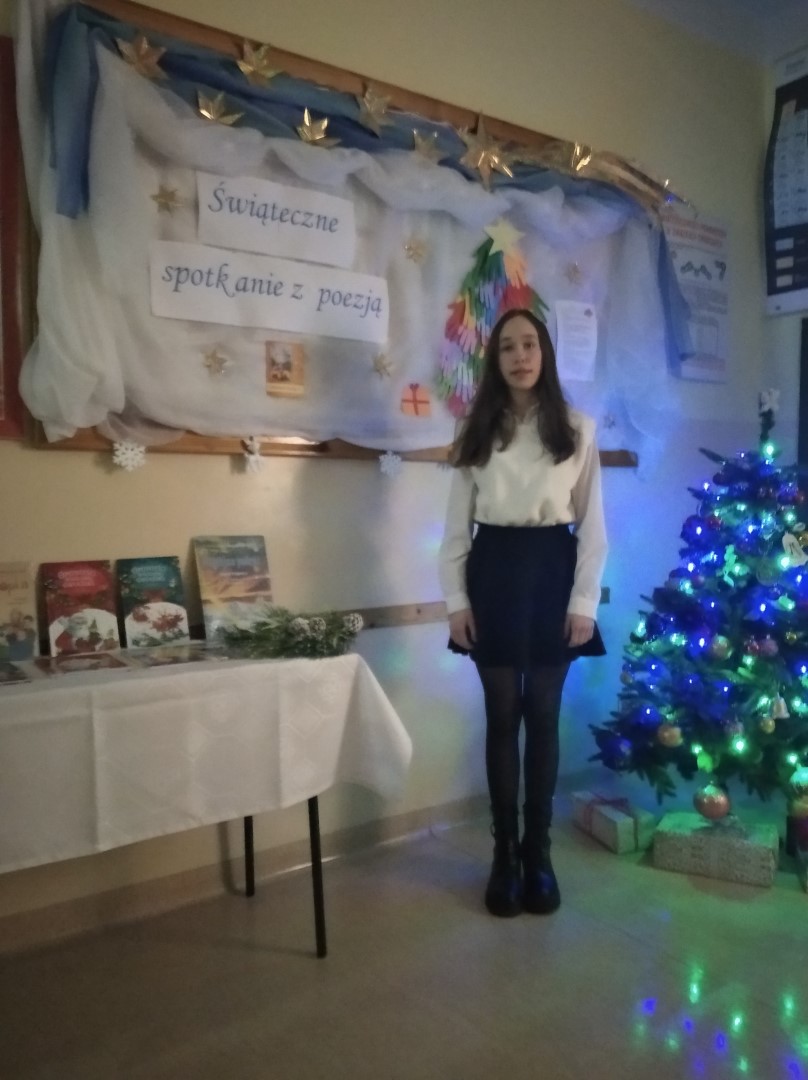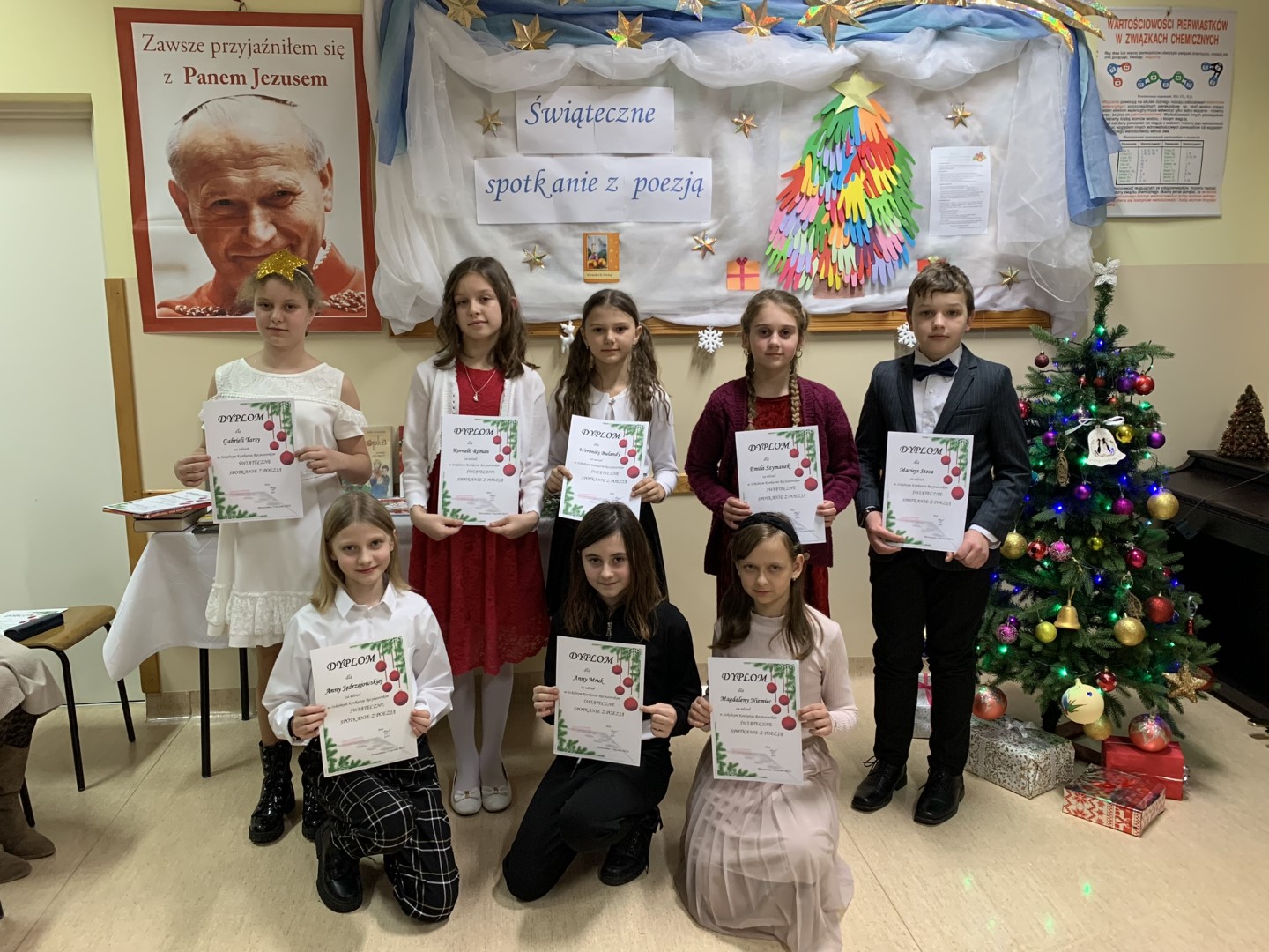 5 stycznia w godzinach popołudniowych w miłej świątecznej atmosferze odbył się Szkolny Konkurs Recytatorski pn. „Świąteczne spotkanie z poezją”. Zgłosiło się 23 uczestników, którzy przygotowali recytacje wierszy tematycznie związanych z Bożym Narodzeniem i Nowym Rokiem.