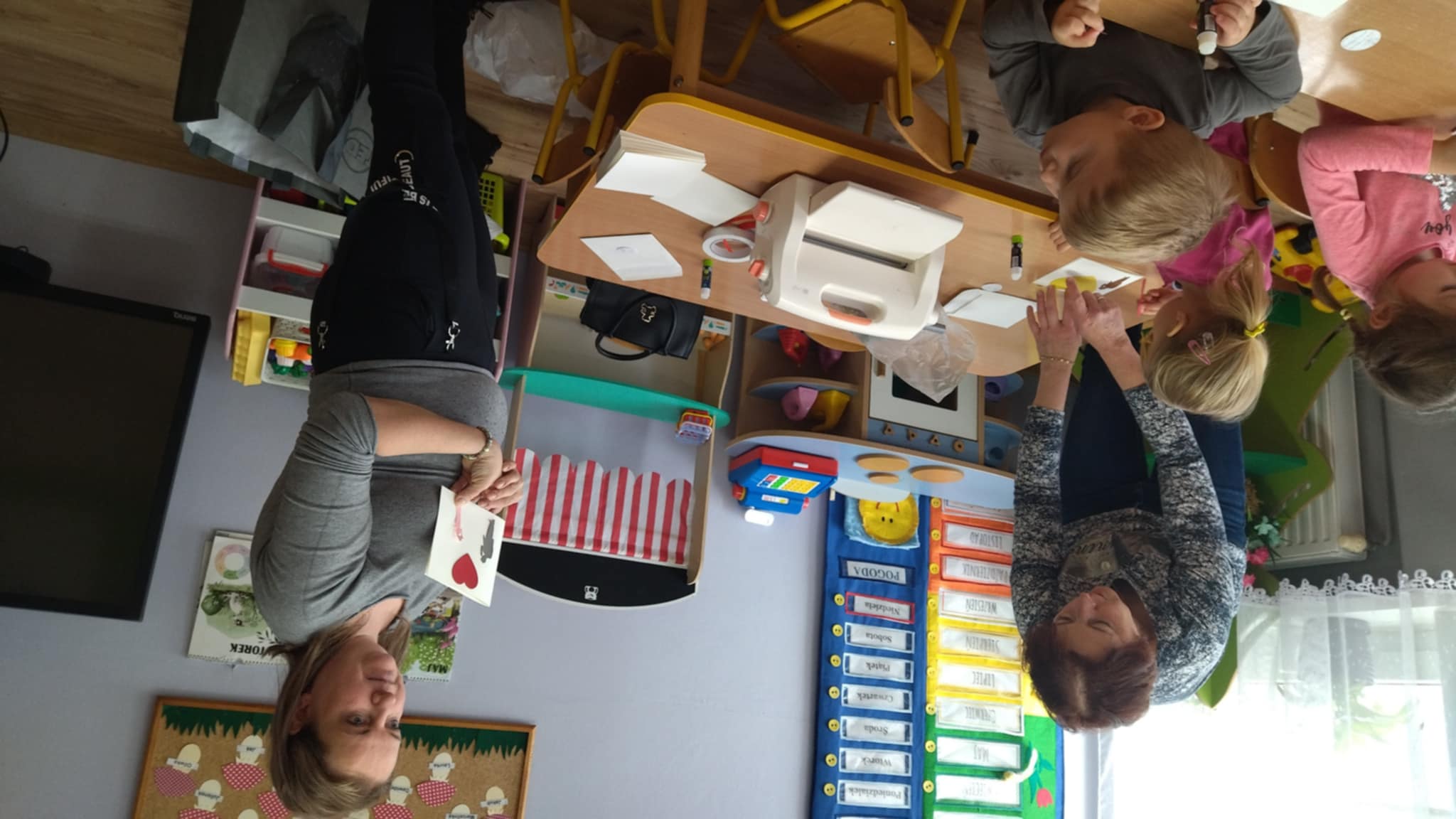 Dnia 20 maja gościliśmy w naszym przedszkolu p. Justynę z Kwiaciarni Bukiety Zmysłów w Moszczenicy, która zaprojektowała i pomogła wykonać przedszkolakom piękne laurki na Dzień Mamy i Taty. Dzieci wykonywały laurki metodą scrapbookingu, czyli tworzenia kartek, które są ozdabiane za pomocą wycinanek, naklejek, kolorowych papierów i innych materiałów, w naszym przypadku była to barwiona zasuszona gipsówka.