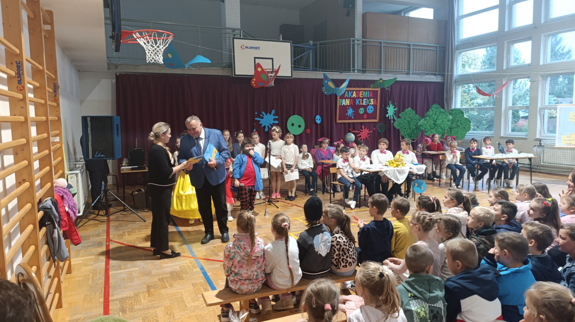 10 października spotykaliśmy się w sali gimnastycznej, by wspólnie świętować Dzień Edukacji Narodowej. Uczniowie klasy 4a i 4b pomogli nam przenieść się w świat niezwykłej szkoły, znanej z kart lektury Jana Brzechwy – „Akademia pana Kleksa”.