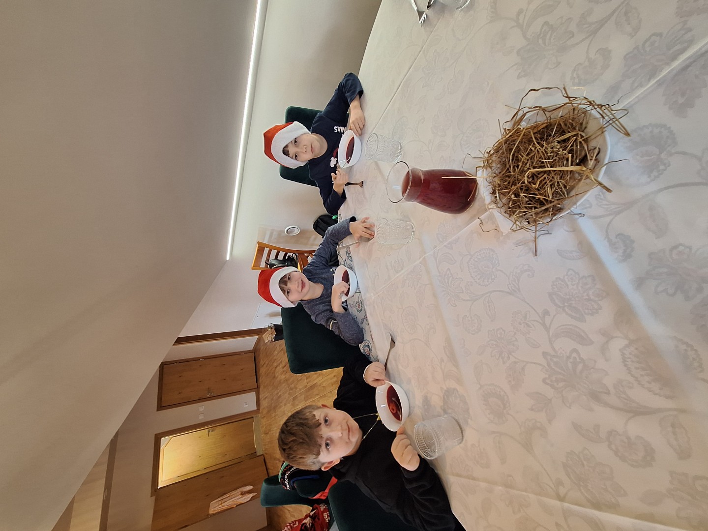 Kolejnym punktem programu było strojenie żywej choinki, a następnie wspólne nakrywanie stołów białym obrusem i układanie sianka, zgodnie z wigilijną tradycją. Na zakończenie wszyscy zasiedli do stołu, aby skosztować tradycyjnego barszczu z uszkami, wigilijnych pierogów oraz kompotu z owoców.