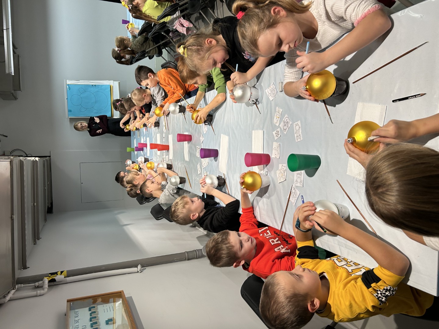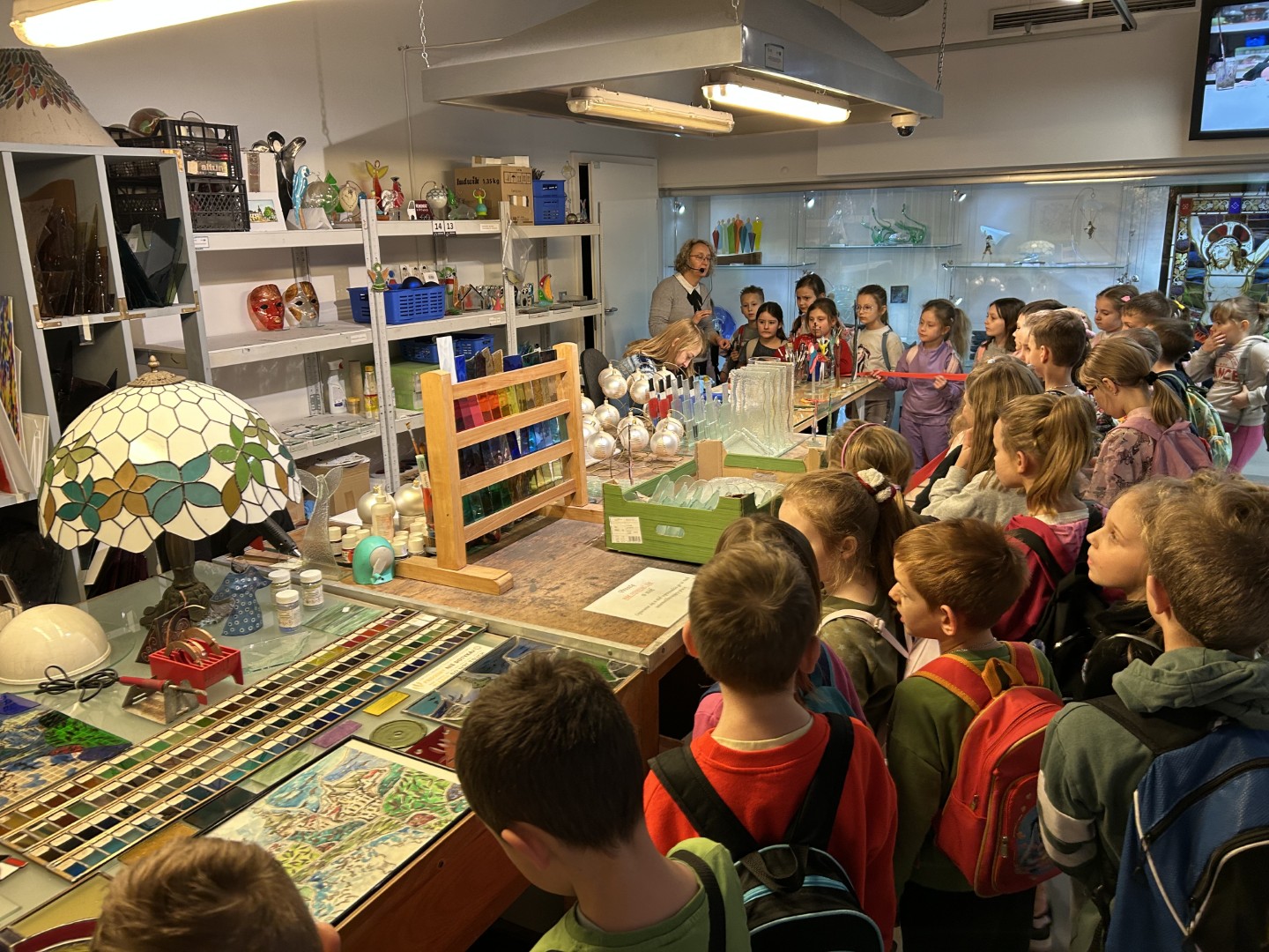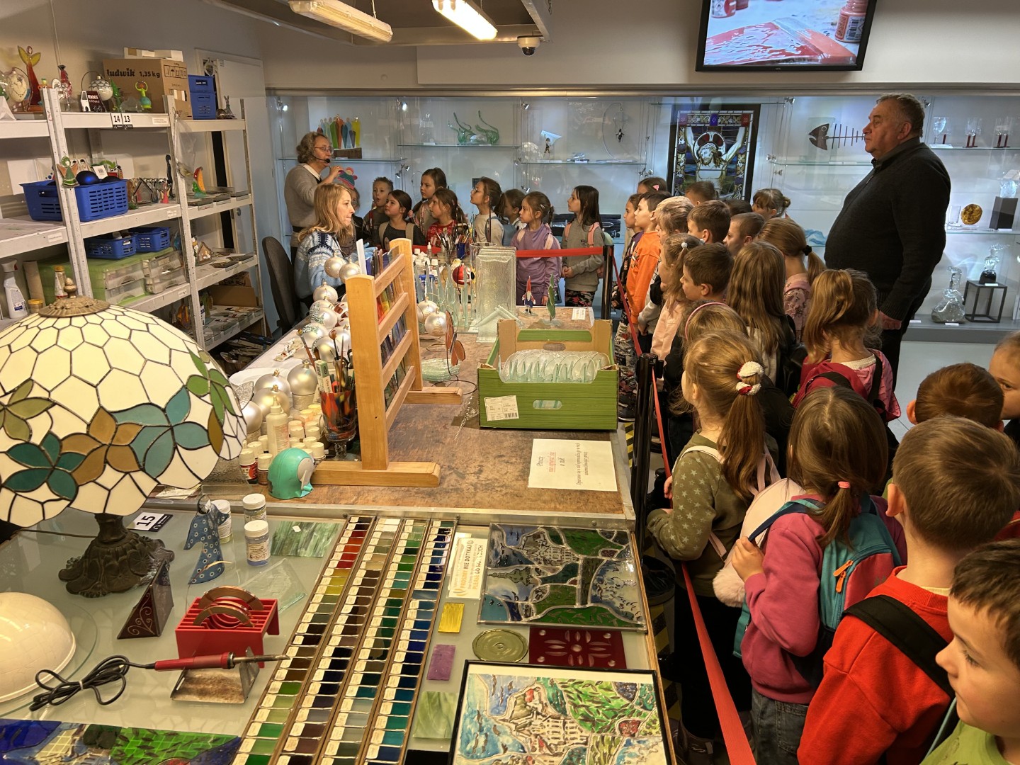 Drugim punktem wyjazdu było Centrum Dziedzictwa Szkła w Krośnie. W czasie wizyty w Centrum, uczniowie podziwiali wystawę pięknych i nowoczesnych szklanych wyrobów oraz oglądali liczne eksponaty w muzeum. Podczas zajęć edukacyjnych dzieci dowiedziały się, jak wygląda proces barwienia i szlifowania szkła, malowania na szkle oraz tworzenia witraży. Zobaczyły jak w rozgrzanym piecu wyrabia się szklane przedmioty mając możliwość obserwacji pracy hutnika na żywo. Z wielkim zainteresowaniem odciskały monety stemplem w płynnym szkle. Na zakończenie wszystkie dzieci uczestniczyły w warsztatach malowania bombek choinkowych, podczas których wykazały się ogromną kreatywnością.