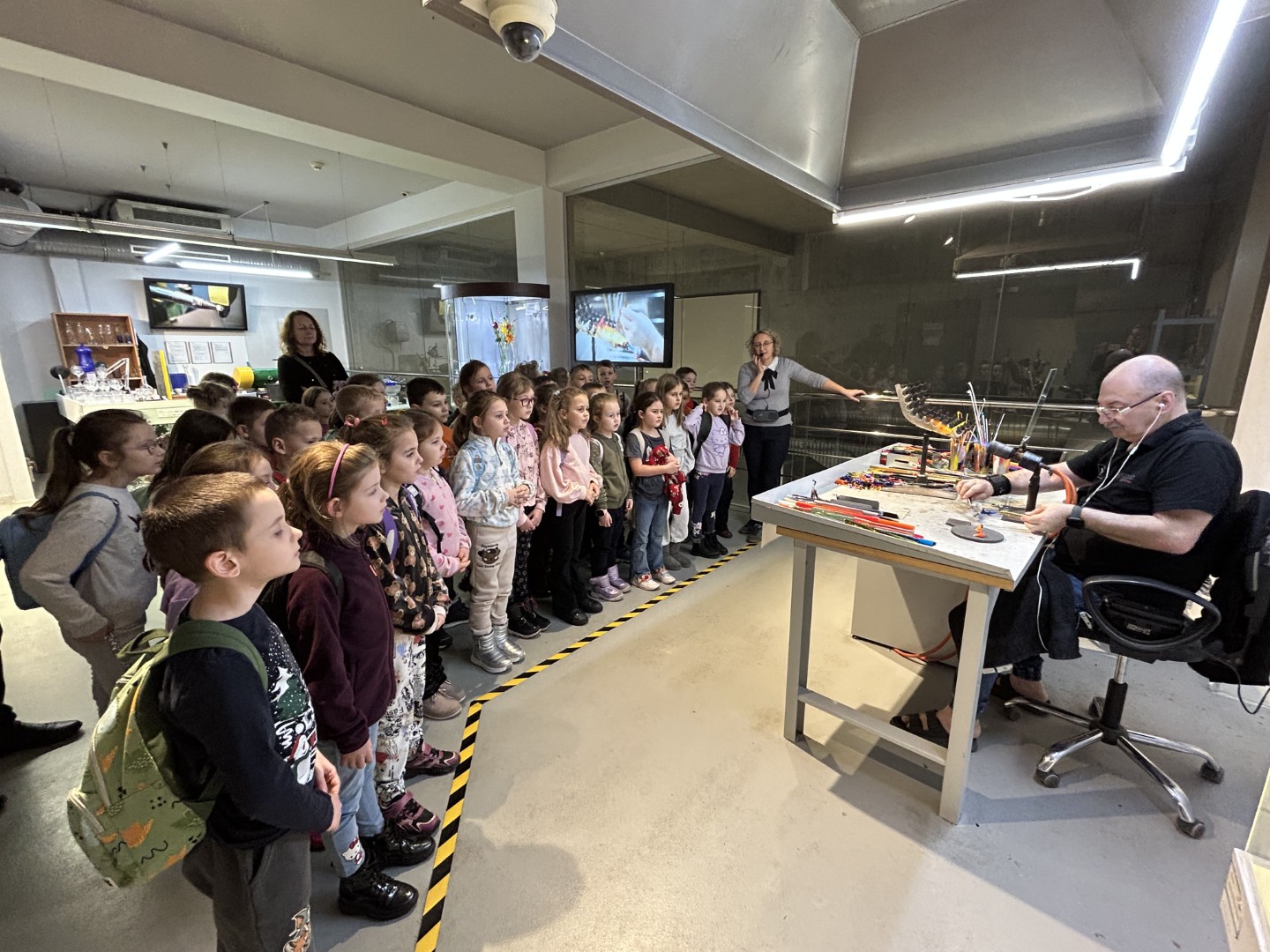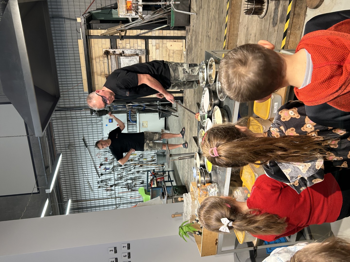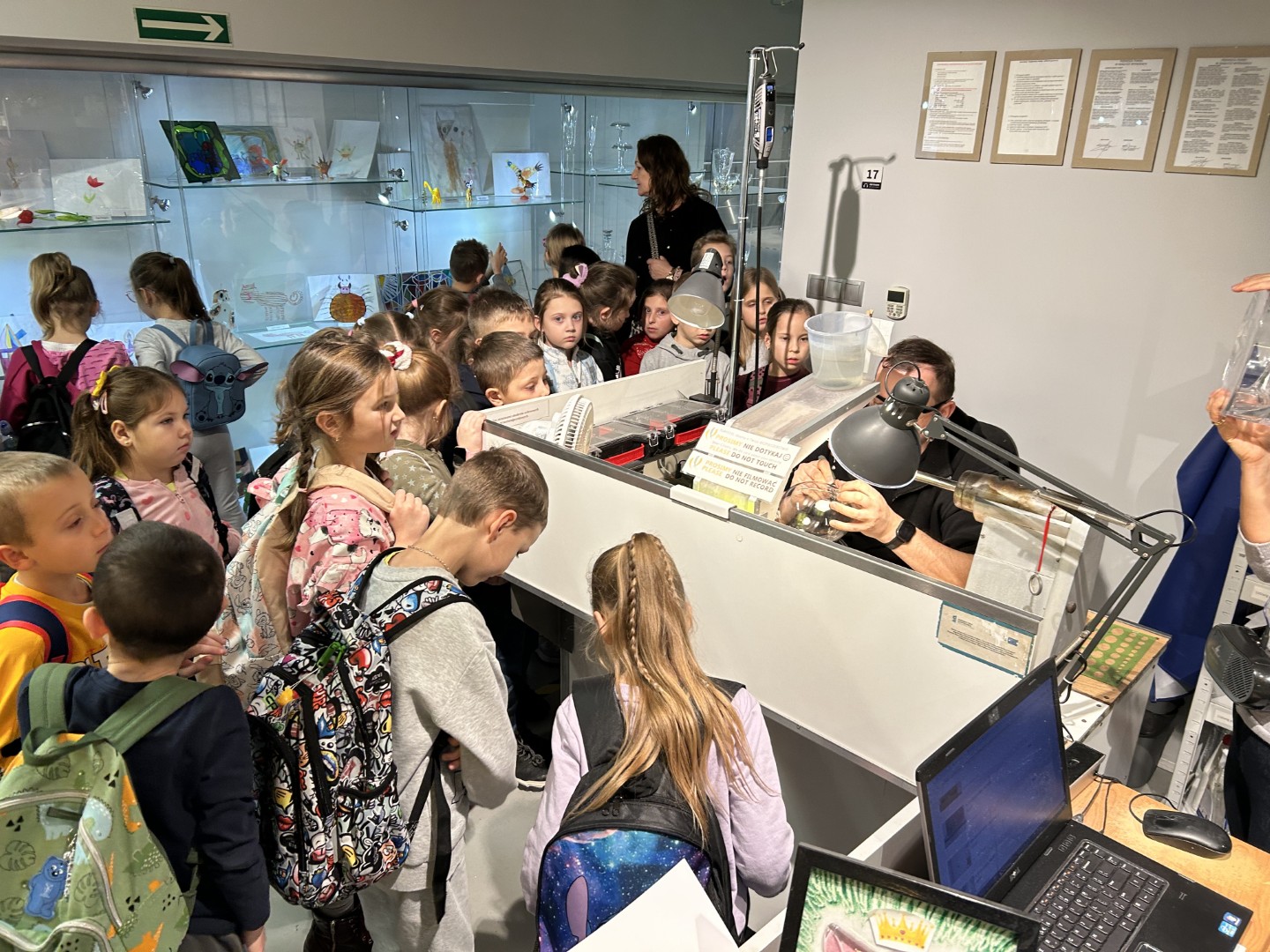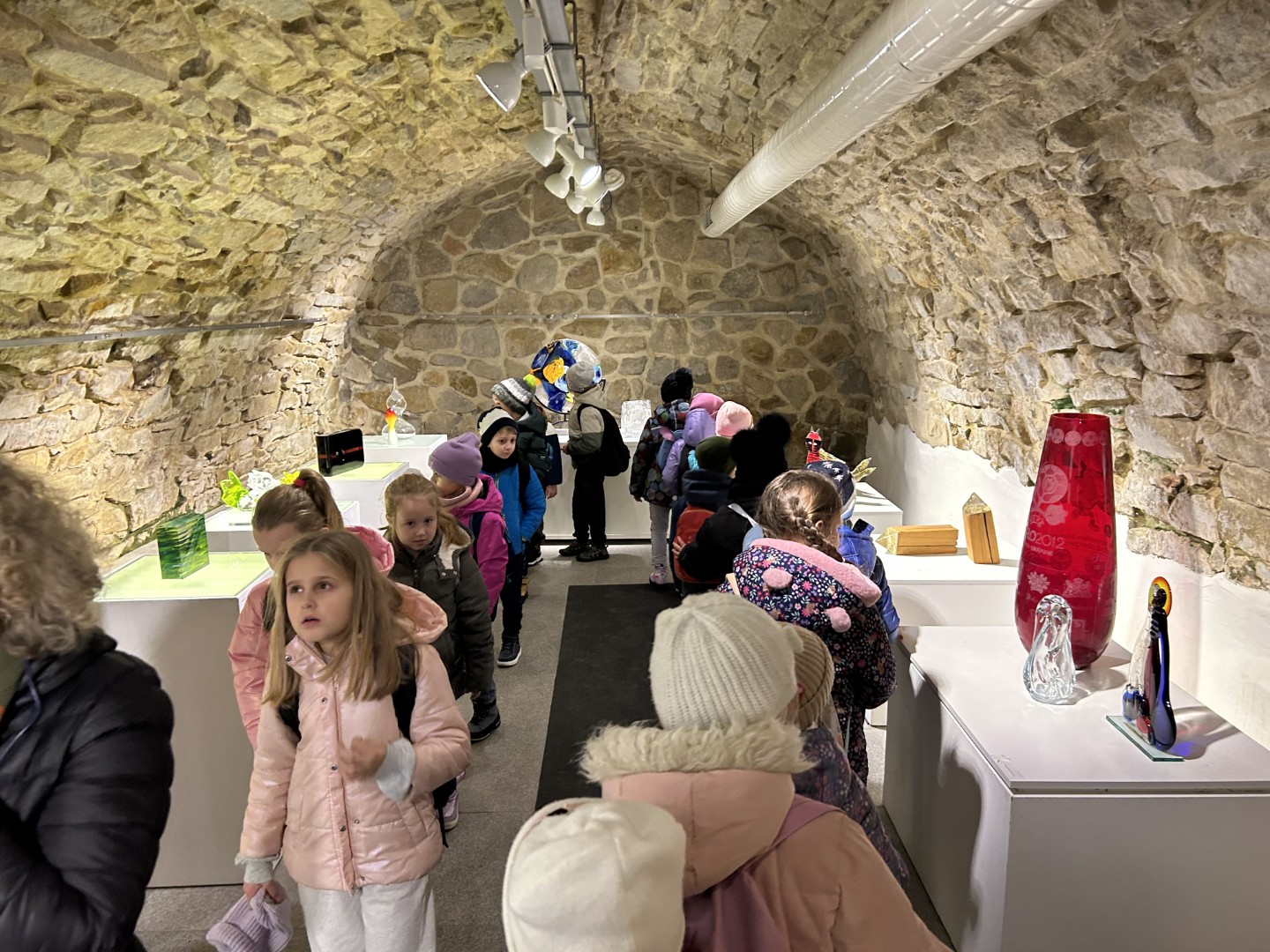 Drugim punktem wyjazdu było Centrum Dziedzictwa Szkła w Krośnie. W czasie wizyty w Centrum, uczniowie podziwiali wystawę pięknych i nowoczesnych szklanych wyrobów oraz oglądali liczne eksponaty w muzeum. Podczas zajęć edukacyjnych dzieci dowiedziały się, jak wygląda proces barwienia i szlifowania szkła, malowania na szkle oraz tworzenia witraży. Zobaczyły jak w rozgrzanym piecu wyrabia się szklane przedmioty mając możliwość obserwacji pracy hutnika na żywo. Z wielkim zainteresowaniem odciskały monety stemplem w płynnym szkle. Na zakończenie wszystkie dzieci uczestniczyły w warsztatach malowania bombek choinkowych, podczas których wykazały się ogromną kreatywnością.