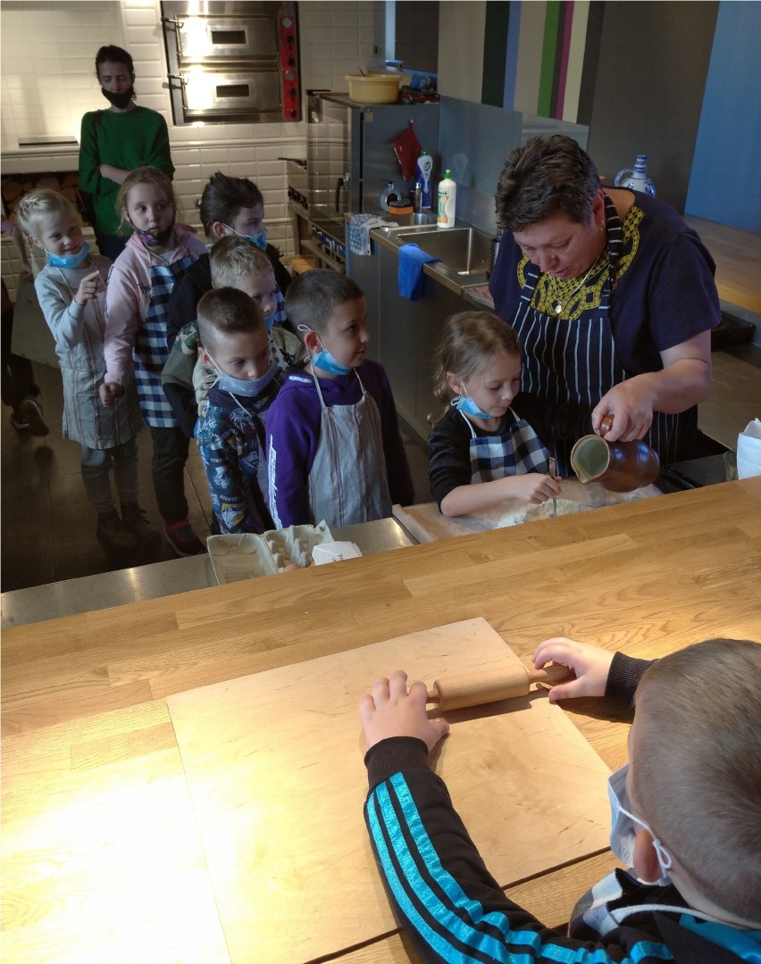 W Etnocentrum Ziemi Krośnieńskiej dzieci odbyły interaktywne spacery po nowoczesnej przestrzeni, w czasie których dowiedziały się o codziennym życiu i dawnych zwyczajach mieszkańców okolic Krosna. Poznały lokalne historie, obrzędy, legendy. Podczas zajęć rękodzielniczych malowały starodawne, drewniane ptaszki. Najwięcej radości sprawiły dzieciom warsztaty kulinarne, podczas których pod kierunkiem przesympatycznej „ciotki Fiony” samodzielnie robił tradycyjne kluski.