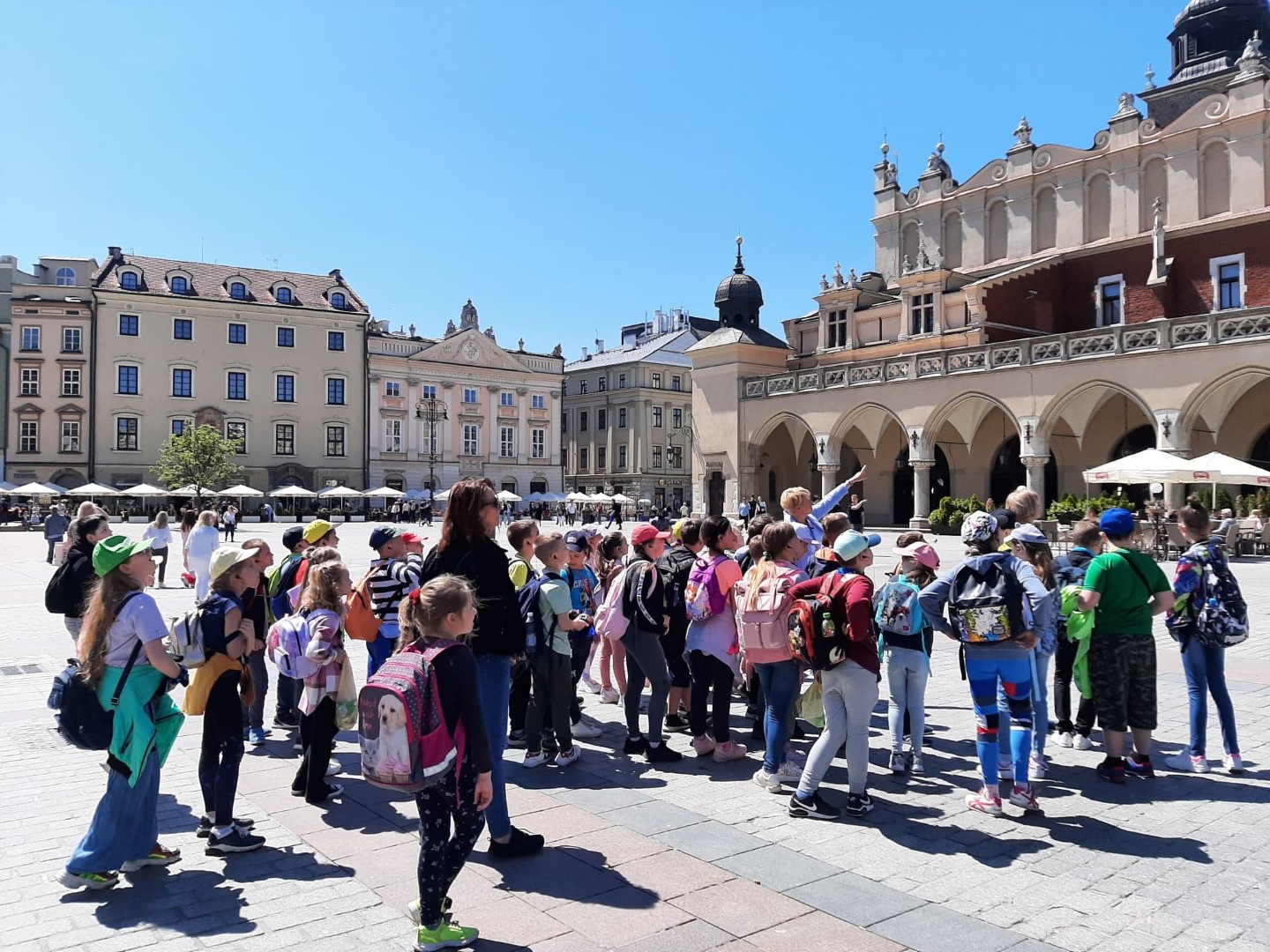 Kraków to niezwykle piękne miasto. Przekonały się o tym dzieci z klas trzecich i czwartych, które 18 maja mogły zobaczyć jego najciekawsze zakątki. Wyjazd dofinansowany i zorganizowany był w ramach projektu Poznaj Polskę. Dzięki tej wycieczce dzieci poznały zabytki i historię Krakowa. Zobaczyły wystawę Wawel Zaginiony, przeszły przez sale zajmowane w czasach królewskich przez króla oraz jego najbliższą rodzinę, przeszły przez Smoczą Jamę i zobaczyły ziejącego ogniem Smoka Wawelskiego. Spacerując w pięknej pogodzie uczniowie doszli do Rynku Głównego gdzie w budynku handlowym Sukiennic dokonali obowiązkowych zakupów. Pod Kościołem Mariackim usłyszeli hejnał grany na cztery strony świata, mieli okazję pomachać hejnaliście i dowiedzieć się o kilku ciekawostkach jego pracy. Po przerwie na obiad dzieci zwiedziły Podziemia Rynku Głównego, a na koniec wycieczki spróbowały własnych sił w produkcji obwarzanka. Wycieczka była niezwykłą lekcją historii i nowym doświadczeniem działania w różnych sytuacjach pozaszkolnych.