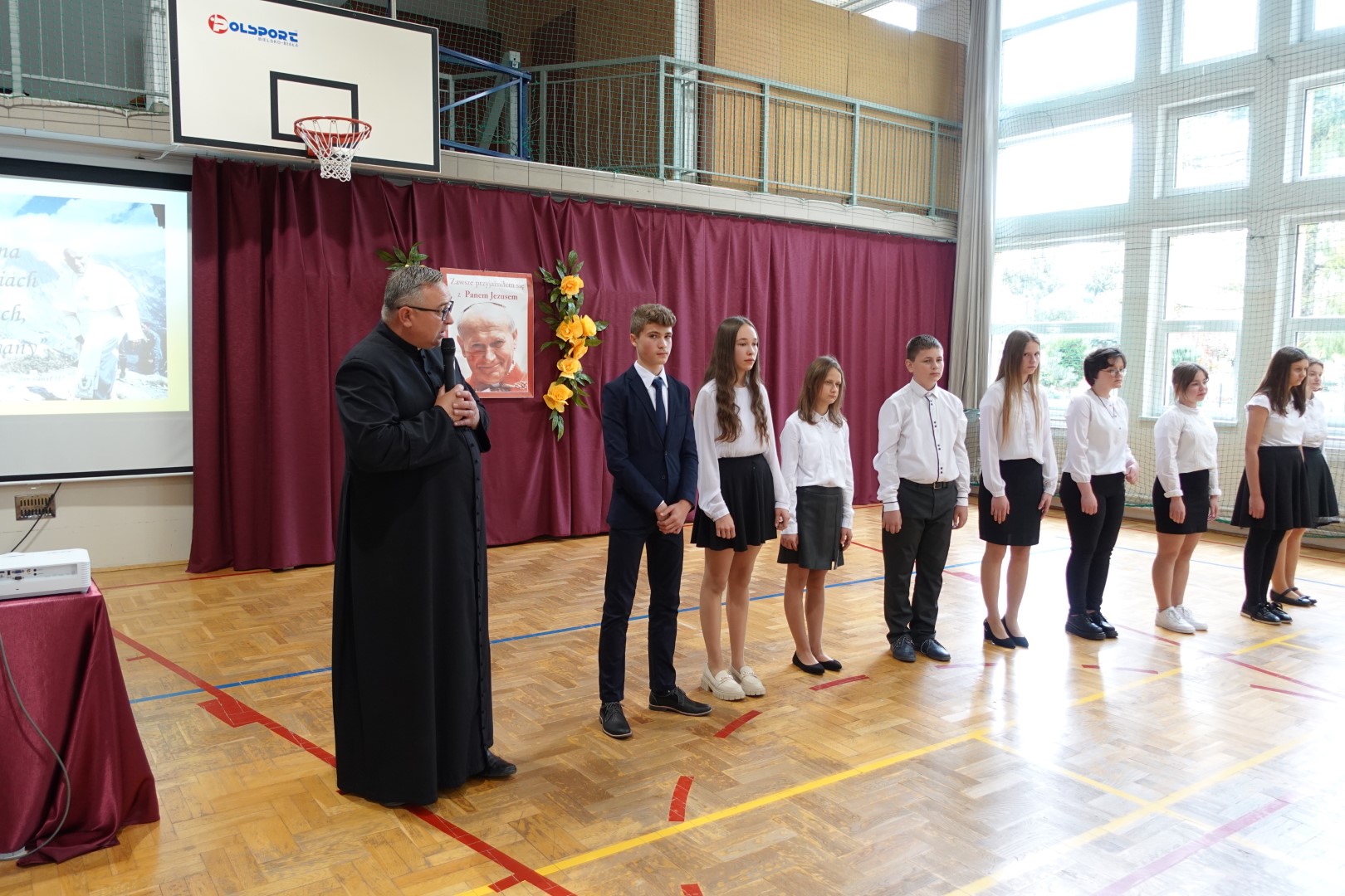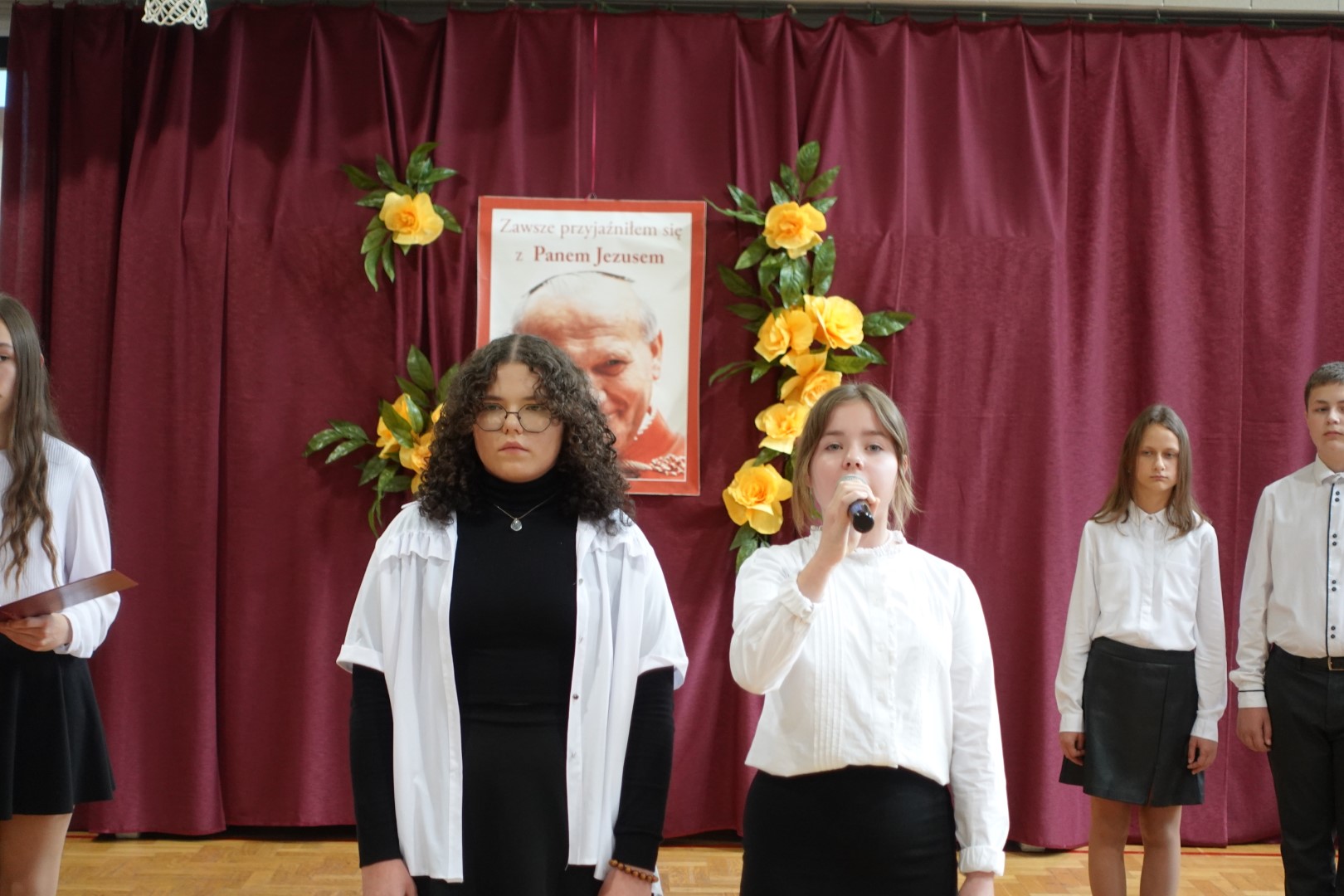 Dnia 19 października odbyła się w naszej szkole uroczysta akademia z okazji Dnia Papieskiego. Mottem uroczystości stały się słowa ,,Ocalić od zapomnienia’’. Uroczystość przygotowali uczniowie klas VIII pod opieką p. Anny Potok oraz p. Jadwigi Gryga. Uroczystość uświetniły piosenki śpiewane przez szkolny chór pod kierunkiem p. Mirosława Potoka.