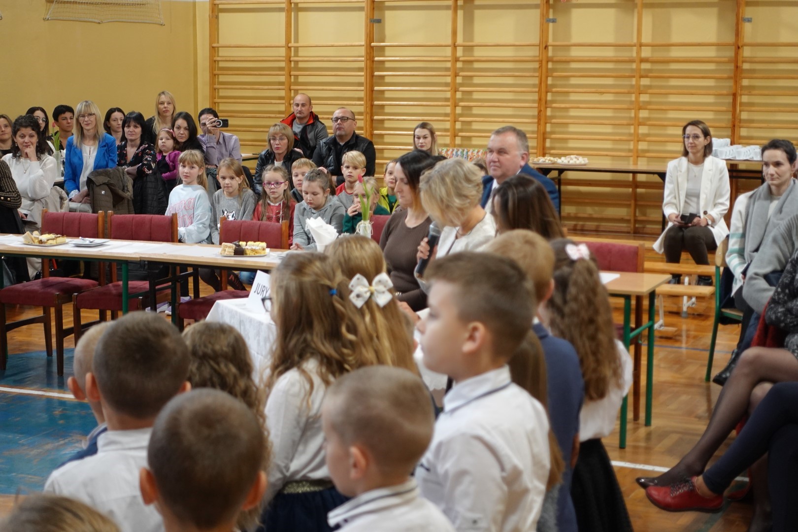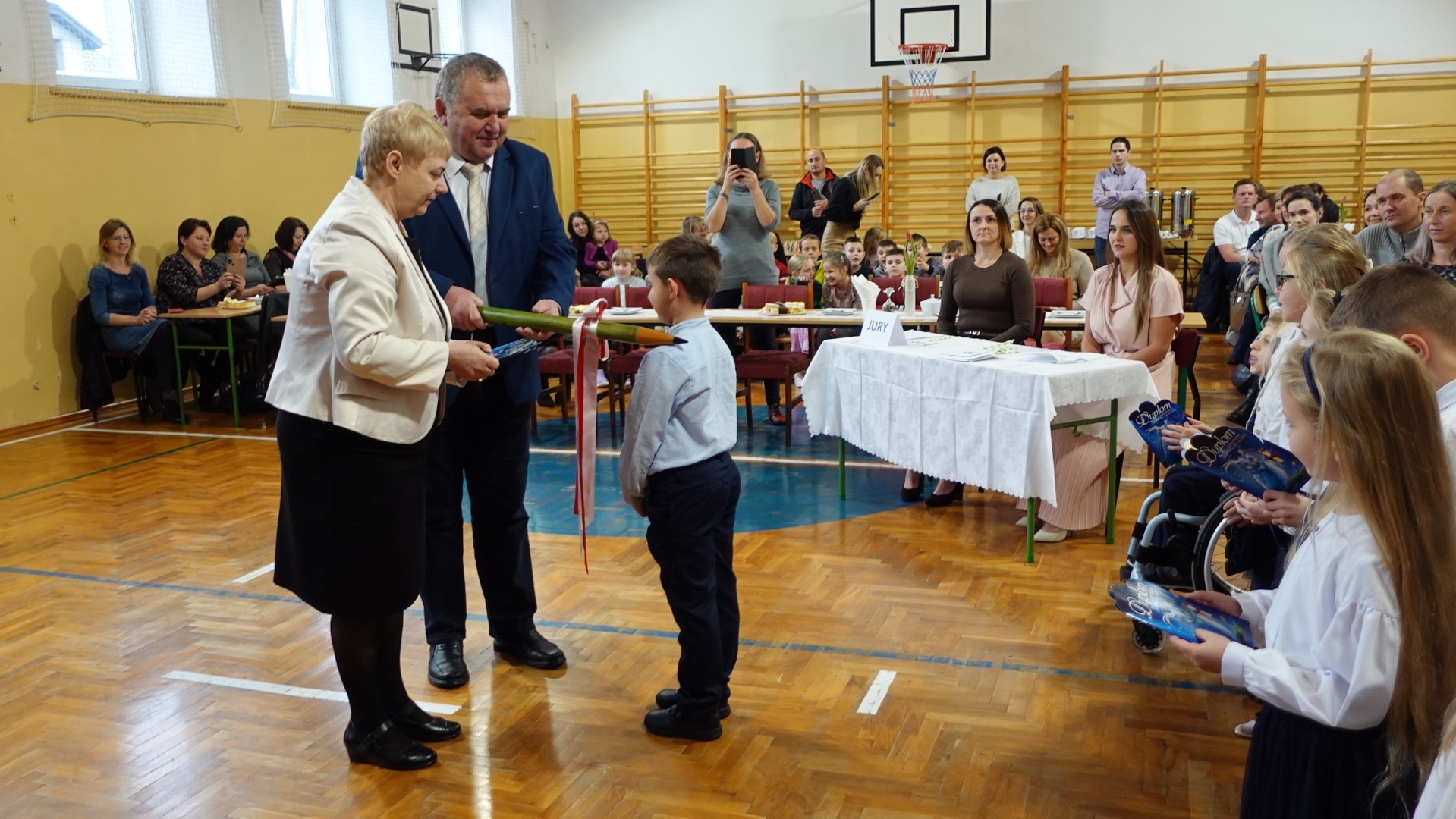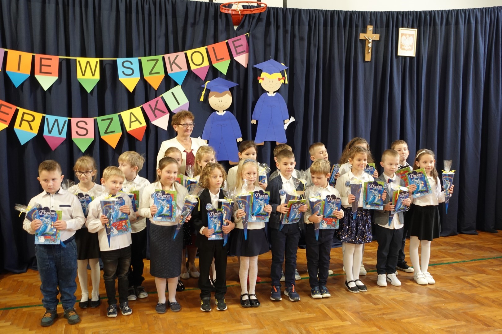 Dzień 8 listopada 2023r zapadł głęboko w pamięci pierwszoklasistów i ich rodziców. W tym bowiem dniu odbyło się Pasowanie na ucznia i czytelnika. Na uroczystość licznie przybyli zaproszeni goście. Występ uświetniła część artystyczna którą przedstawiły pierwszaki pod kierunkiem wychowawczyń; p. Janiny Szczerby i p. Krystyny Tarsa, a do której przygotowywały się od pierwszych dni pobytu w szkole. Dzieci zaprezentowały montaż słowno-muzyczny; śpiewały piosenki, recytowały wiersze o różnej tematyce, rozwiązywały zagadki. Nie zabrakło również zadań matematycznych. Pierwszaki spisały się na medal. Kulminacyjnym punktem całej uroczystości był akt Pasowania na ucznia i czytelnika. Każde dziecko otrzymało dyplom, plakietkę i książeczkę oraz słodki dodatek. Na zakończenie rodzice przygotowali słodki poczęstunek.