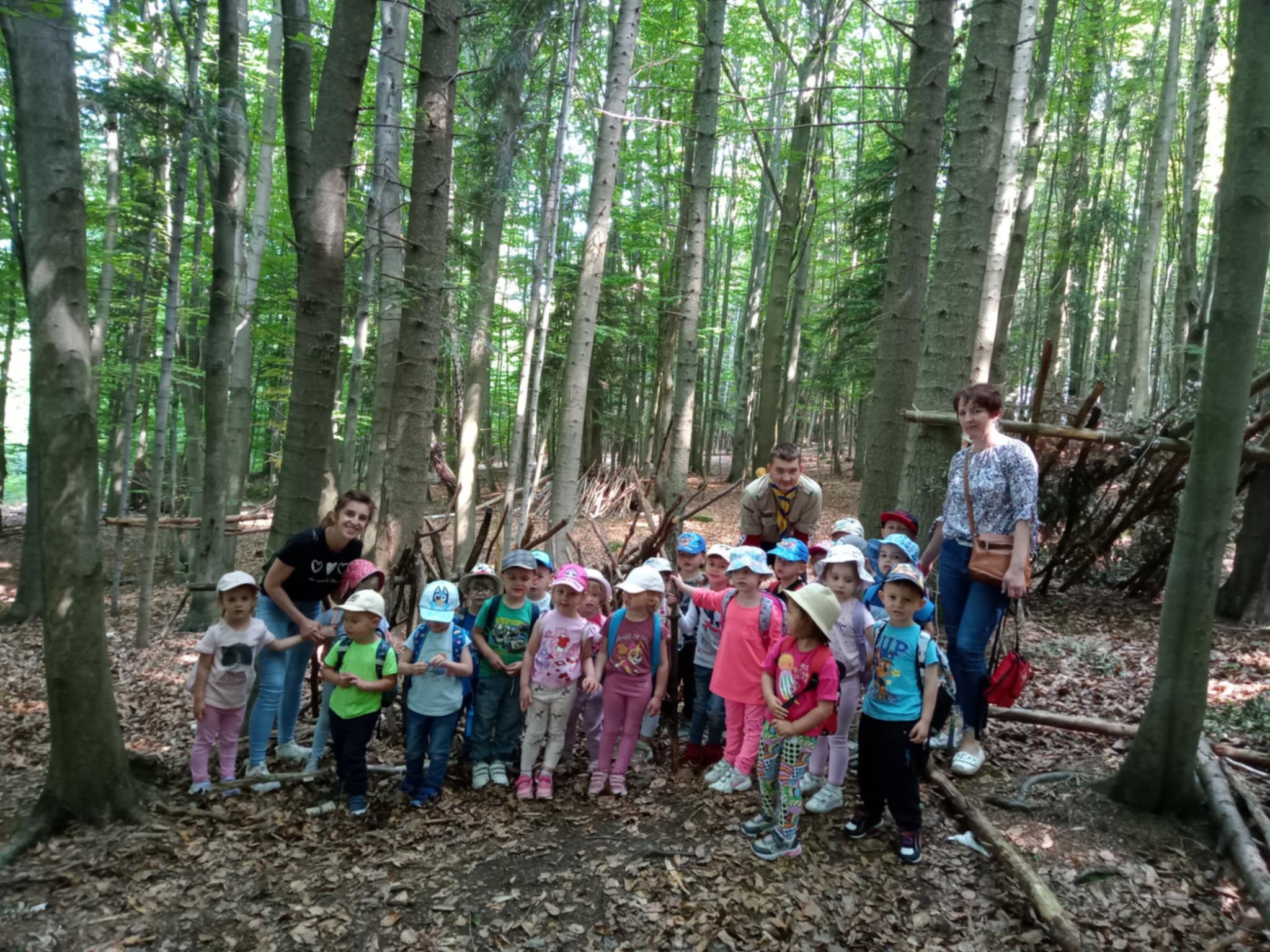 W słoneczny poranek, 10 czerwca przedszkolaki z grup Muchomorki i Jagódki wyruszyły na wycieczkę autokarową do miejscowości Łosie. W zagrodzie edukacyjnej "Skrawek Nieba" czekało na nie wiele atrakcji i niespodzianek. Przedszkolaki wzięły udział w zajęciach plastyczno - technicznych, podczas których wykonały zakładkę do książki z własnoręcznie zebranych ziół i kwiatów. Kolejną atrakcją była wędrówka z przewodnikiem, który w ciekawy sposób opowiedział o zwierzętach leśnych żyjących w okolicach Łosia, zasadach zachowania podczas wycieczek do lasu. Dzieci z wielkim zaangażowaniem za pomocą lup obserwowały przyrodę, tworzyły leśne obrazy. Nauczyły się również budować szałas. Po powrocie z lasu przedszkolaki uczestniczyły w zajęciach kulinarnych, podczas których własnoręcznie przygotowały tradycyjne proziaki, które później ze smakiem pałaszowały. Na pewno te wspaniałe przygody zostaną na długo w ich pamięci.