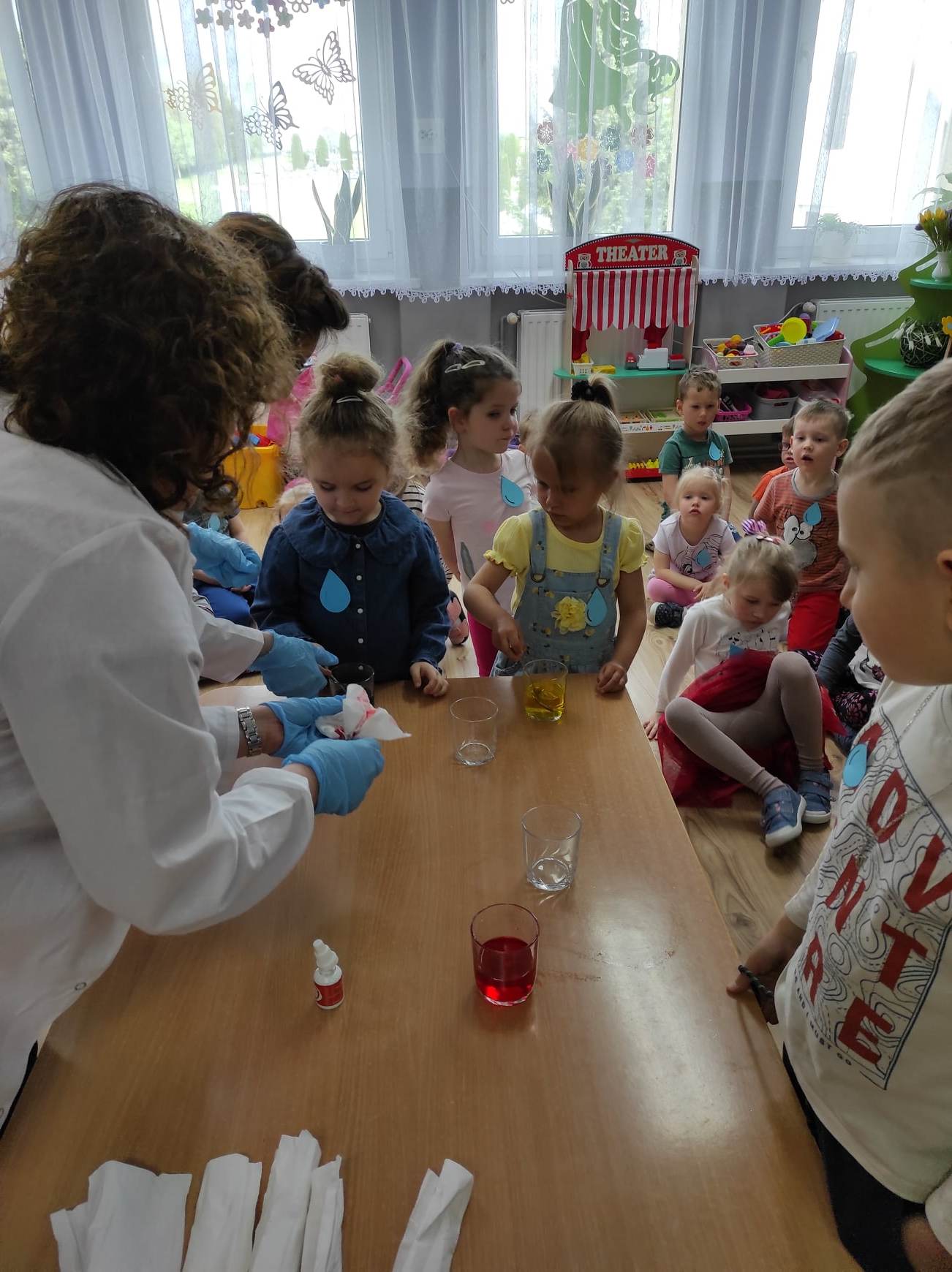 15 maja odbyły się kolejne zajęcia w ramach prowadzonej w przedszkolu innowacji pedagogicznej. Tym razem dzieci wraz ze swoimi paniami wykonywały wodne doświadczenia. Sala przedszkolna zamieniła się ponownie w „Laboratorium Małego Badacza”, w którym przedszkolaki wykonały szereg doświadczeń i eksperymentów z wykorzystaniem wody, m.in. „Wędrująca woda”, „Kolorowe kwiaty”, „Kolorowy deszcz w słoiku”, „Jak działa mydło”, „Ruchomy obrazek”, „Znikające kolory”, „Magiczny woreczek”, „Podwodny wulkan”. Zbadaliśmy również, które przedmioty pływają po wodzie, a które w niej toną i wyjaśniliśmy co ma na to wpływ. Wodne eksperymenty sprawiły dzieciom dużo radości.