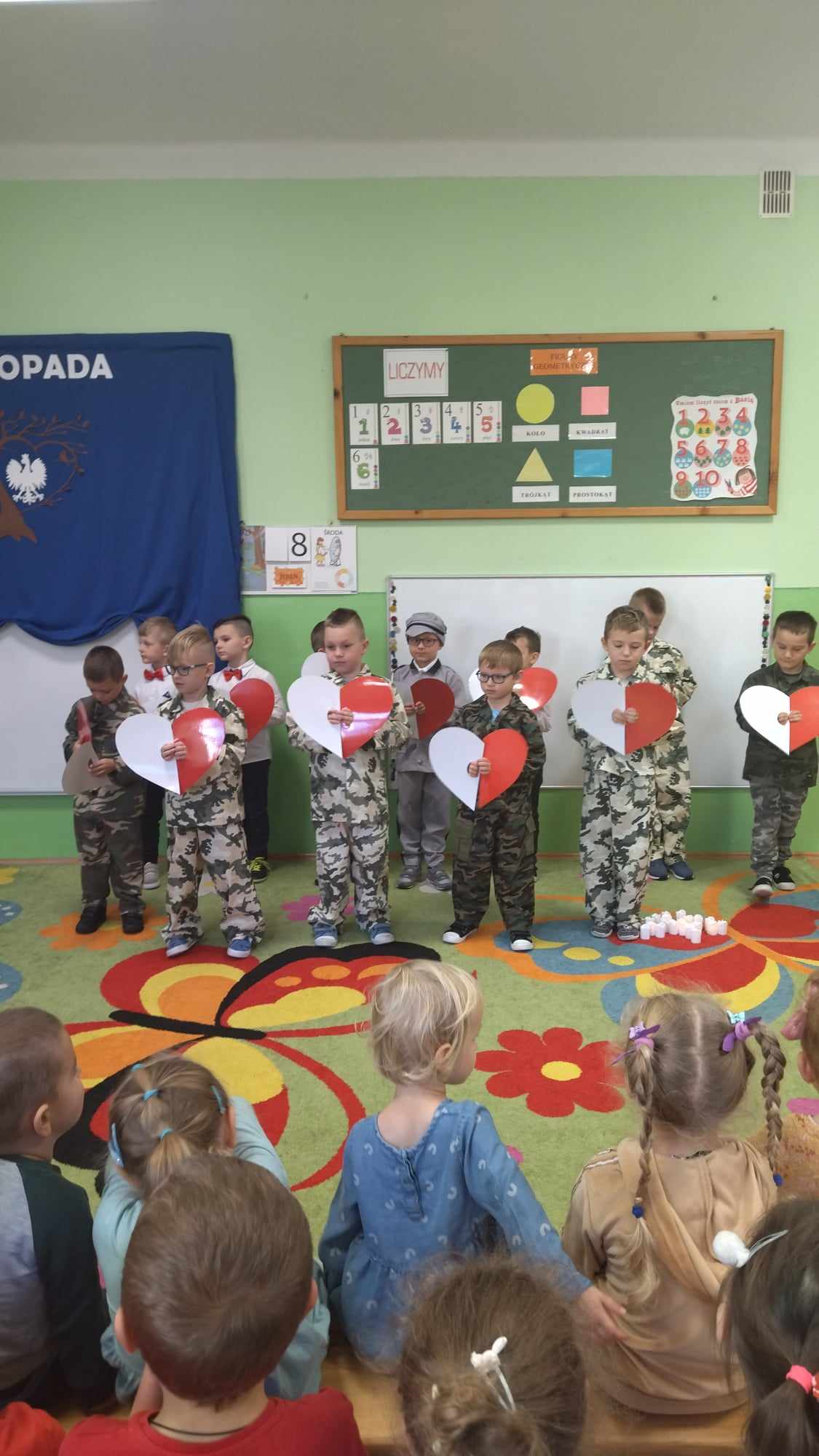 Dzień 11 listopada został uczczony w naszym przedszkolu bardzo uroczyście. Dnia 9 listopada dzieci z najstarszej grupy pod kierownictwem pani Edyty Kotowicz przygotowały występ upamiętniający Dzień Niepodległości. W krótkim spektaklu zostały ujęte najważniejsze fakty. Przedszkolaki w ogromnym skupieniu wysłuchały opowieści, którą pięknie zaprezentowały nam Starszaki. Na koniec występu dumnie, przyjmując postawę „na baczność” wszystkie przedszkolaki wraz z zaproszonymi Gośćmi odśpiewały hymn Polski „Mazurek Dąbrowskiego”. Wszystkie dzieci tego dnia wyglądały odświętnie i uroczyście a na ich piersi widniały kotyliony w barwach narodowych. Dzień Niepodległości był bardzo radosnym dniem w naszym przedszkolu i mamy nadzieję, że zapadnie on w pamięci naszych „Małych Polaków”.
