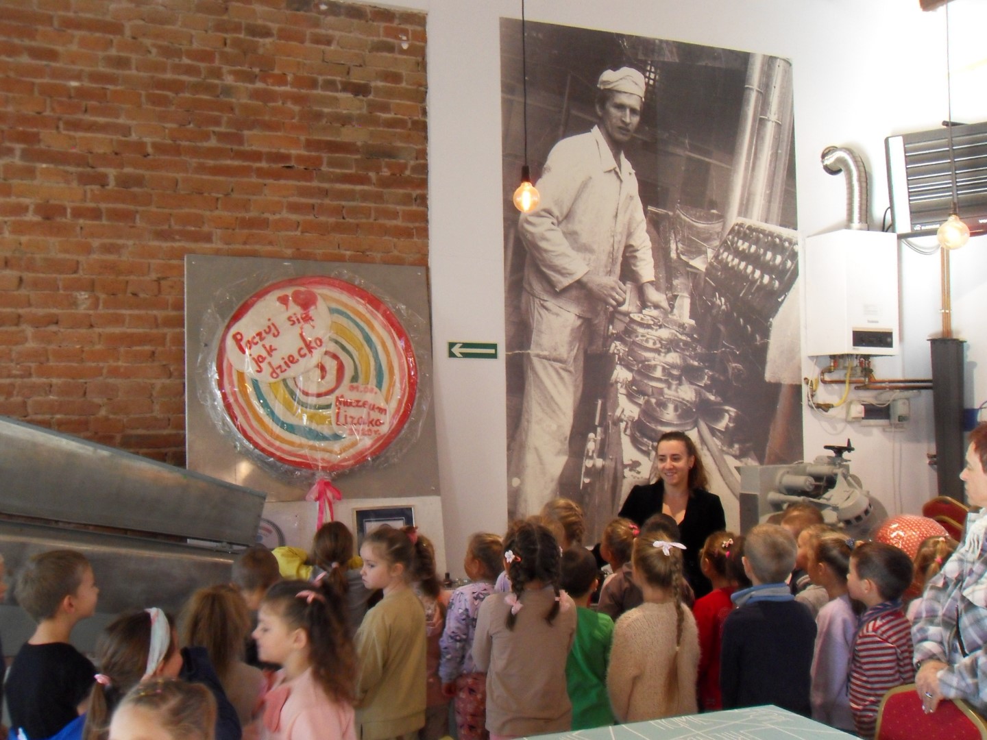 18 października 2024 roku dzieci z grup: Skrzaty i Wesołki wybrały się na wycieczkę do Muzeum Lizaka w Jaśle. Zwiedzanie muzeum zaczęliśmy od sklepiku ze słodkościami, gdzie dzieci mogły oglądać różne kolorowe lizaki. Pani przewodnik w ciekawy sposób opowiedziała o początkach powstawania lizaków oraz jak wyglądała ich produkcja na przestrzeni lat. Zapoznaliśmy się z zawodem cukiernika i karmelarza. Poznaliśmy również proces tworzenia karmelu, barwienia, łączenia w różne kolory. Największą atrakcją dla wszystkich przedszkolaków była możliwość własnoręcznego zrobienia lizaka z przygotowanej masy. W muzeum mogliśmy również posmakować cukrów, z których produkuje się lizaki i powąchać aromatów dodawanych do karmelu, aby nadać mu różne smaki. Potem udaliśmy się na warsztaty robienia pizzy, gdzie bliżej poznaliśmy zawód kucharza. Po wysłuchaniu krótkiej historii o włoskiej pizzy i po dokładnym umyciu rąk każdy otrzymał porcję swojego ciasta i po rozwałkowaniu mógł przyozdobić swoje ciasto sosem pomidorowym, szynką, salami, kukurydzą i serem według własnych pomysłów i smaków. Następnie wszystkie pizze zostały upieczone, a na koniec każdy z apetytem zjadł swoją. Dzieci pełne wrażeń i z uśmiechem na twarzy wróciły do przedszkola.